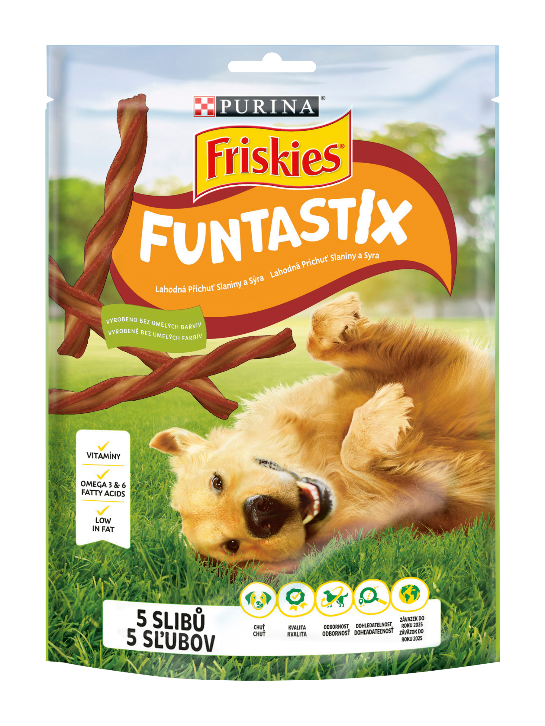 Lahodná kroucená pochoutka s příchutí slaniny a sýra vyrobená z těch nejlepších ingrediencí, bez přidaných umělých barviv. FRISKIES Funtastix může být podáváno kdykoli jako pochoutka nebo odměna, a to buď vcelku, nebo rozlomená na kousky. Friskies 5 slibů pro vašeho šťastného psa: - Chuť: lahodné receptury, které přinesou radost do vašeho domova - Kvalita: během našeho výrobního procesu provádíme stovky denních kontrol - Odbornost: vyvinuto Purina odborníky na výživu - Dohledatelnost: vyrobeno z vysoce kvalitních surovin, pečlivě vybraných od důvěryhodných dodavatelů - Závazek do roku 2025: zavazujeme se, že do roku 2025 budou naše obaly 100% recyklovatelné nebo znovupoužitelné