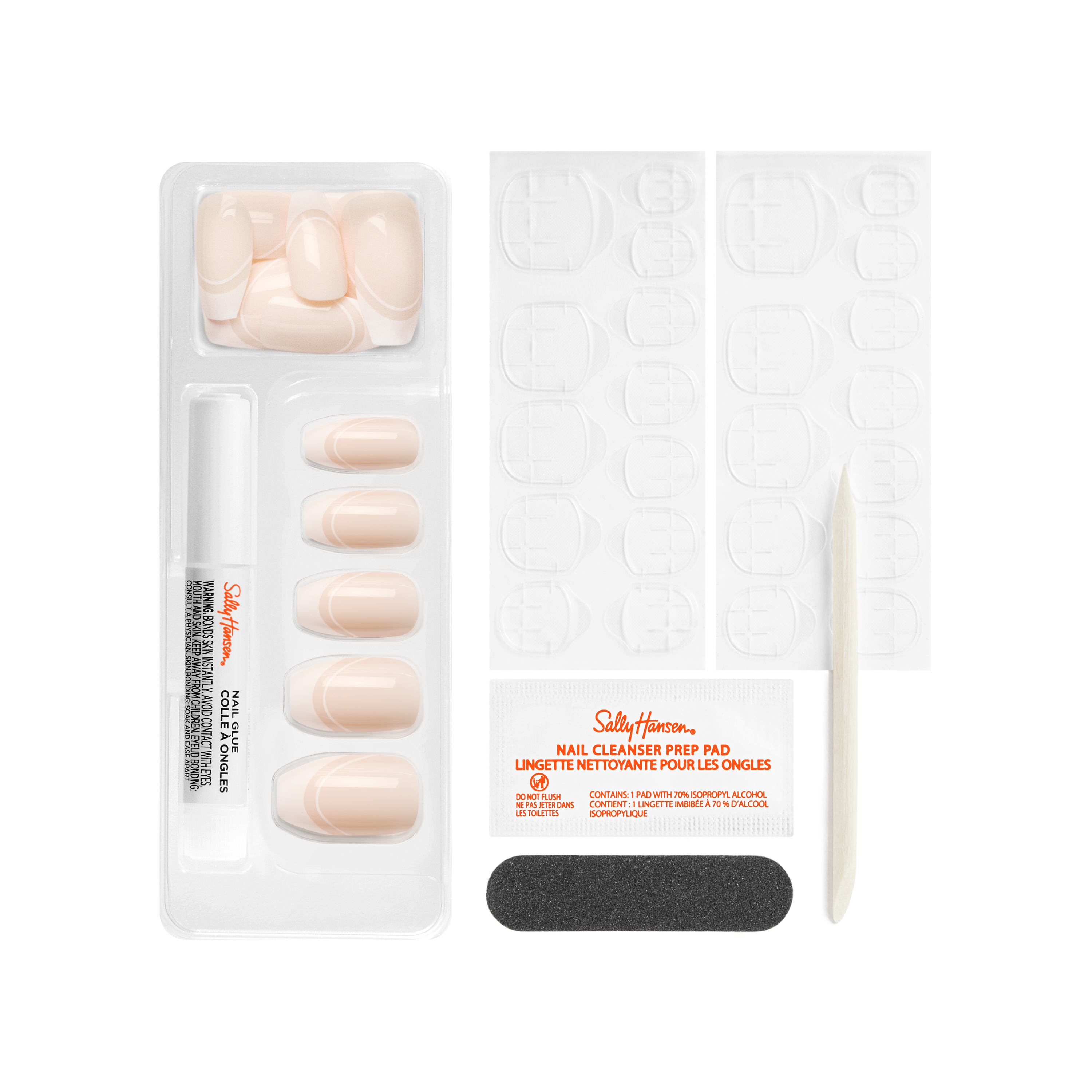 NÁVOD K POUŽITÍ: 1. PŘIZPŮSOBENÍ Vyberte správnou velikost pro každý nehet. 2. PŘÍPRAVA Zapilujte do tvaru, vyleštěte a setřete. 3. APLIKACE POMOCÍ PÁSKŮ NEBO LEPIDLA 3a. PÁSKY Přizpůsobte velikost nehtu, zarovnejte pásek tak, aby pokryl i plochu vzrostlého nehtu a aplikujte. Odstraňte fólii a přiložte umělý nehet. Pevně přitlačte a držte 30 sekund. 3b. LEPIDLO Naneste lepidlo na přírodní a umělý nehet, přitlačte a držte 30 sekund. 4. PŘITLAČTE!