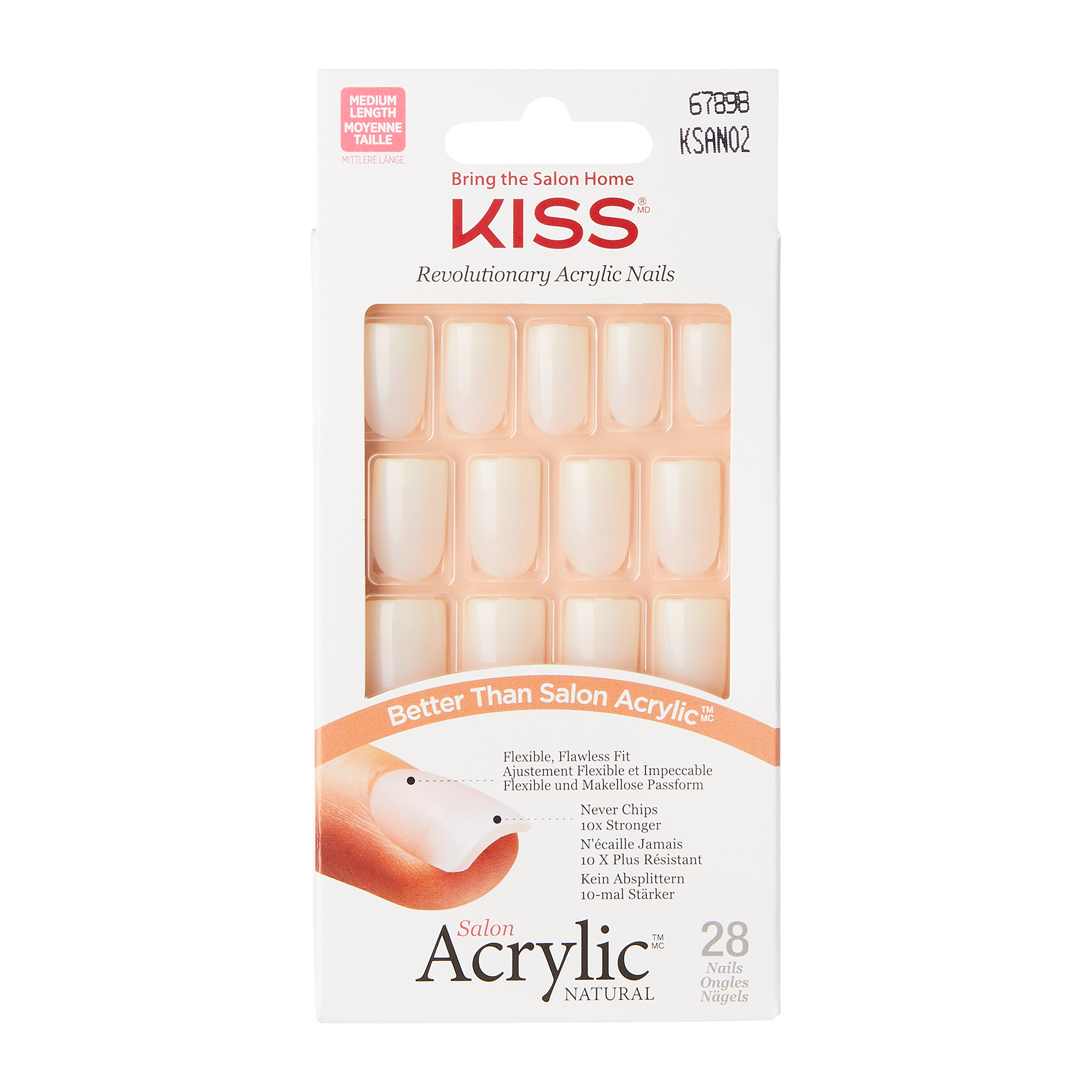 Perfektní přirozeně vypadající nahé nehty s akrylovými nahými francouzskými nehty KISS Salon. Už žádné pruhy, linky nebo nerovné kabáty, s pohodlím doma a bez jakýchkoli nevýhod v salonní akrylové manikúry. Díky snadné aplikaci lepením; k dispozici v krátké i střední délce.