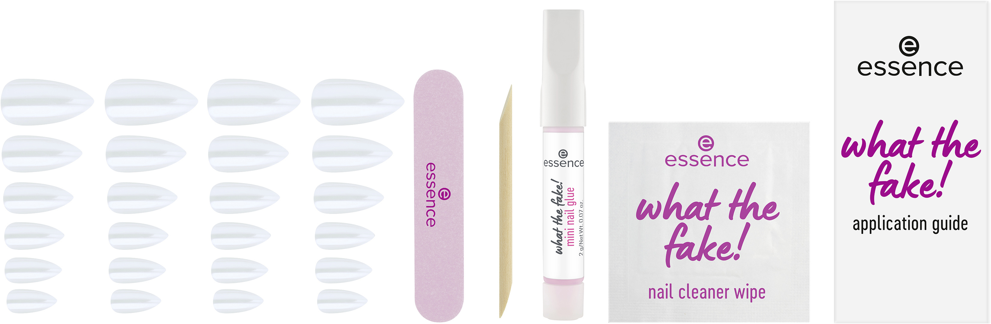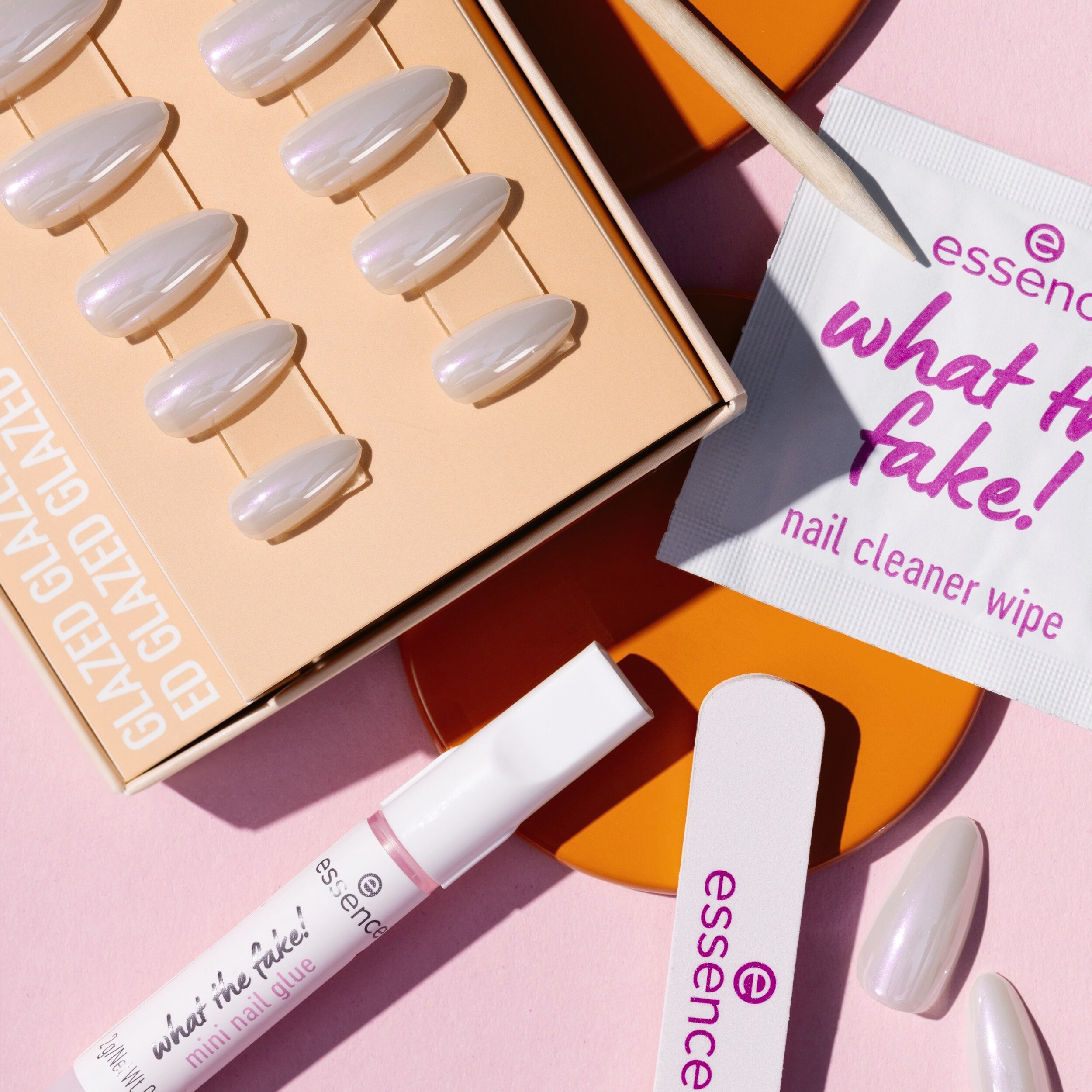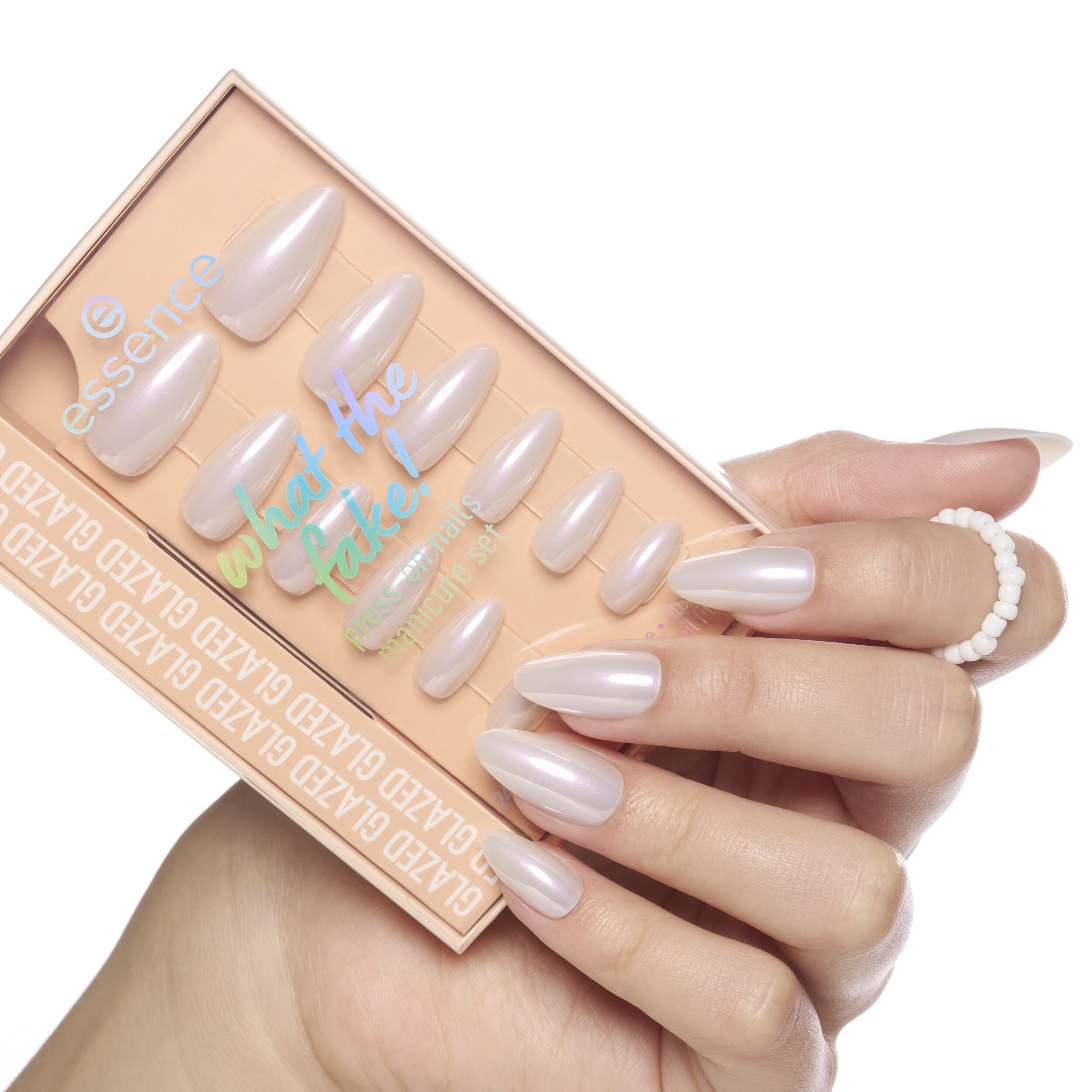 Hotové nehty během několika minut díky essence what the fake! sadě s umělými nehty PRESS-ON 01 GLAZED. Tato sada obsahuje 24 vysoce kvalitních umělých nehtů ve 12 různých velikostech v mandlovém tvaru s jemným bílým glazovaným efektem. Díky svému preciznímu tvaru a kvalitě se nehty dokonale přizpůsobí vašim přirozeným nehtům – pro vzhled jako ze salonu u vás doma. Sada obsahuje také lepidlo na nehty, tyčinku na manikúru, mini pilník na nehty a čisticí ubrousek na nehty – vše, co potřebujete pro snadnou aplikaci dlouhotrvající manikúry. Snadná aplikace a výsledek, který si zamilujete!