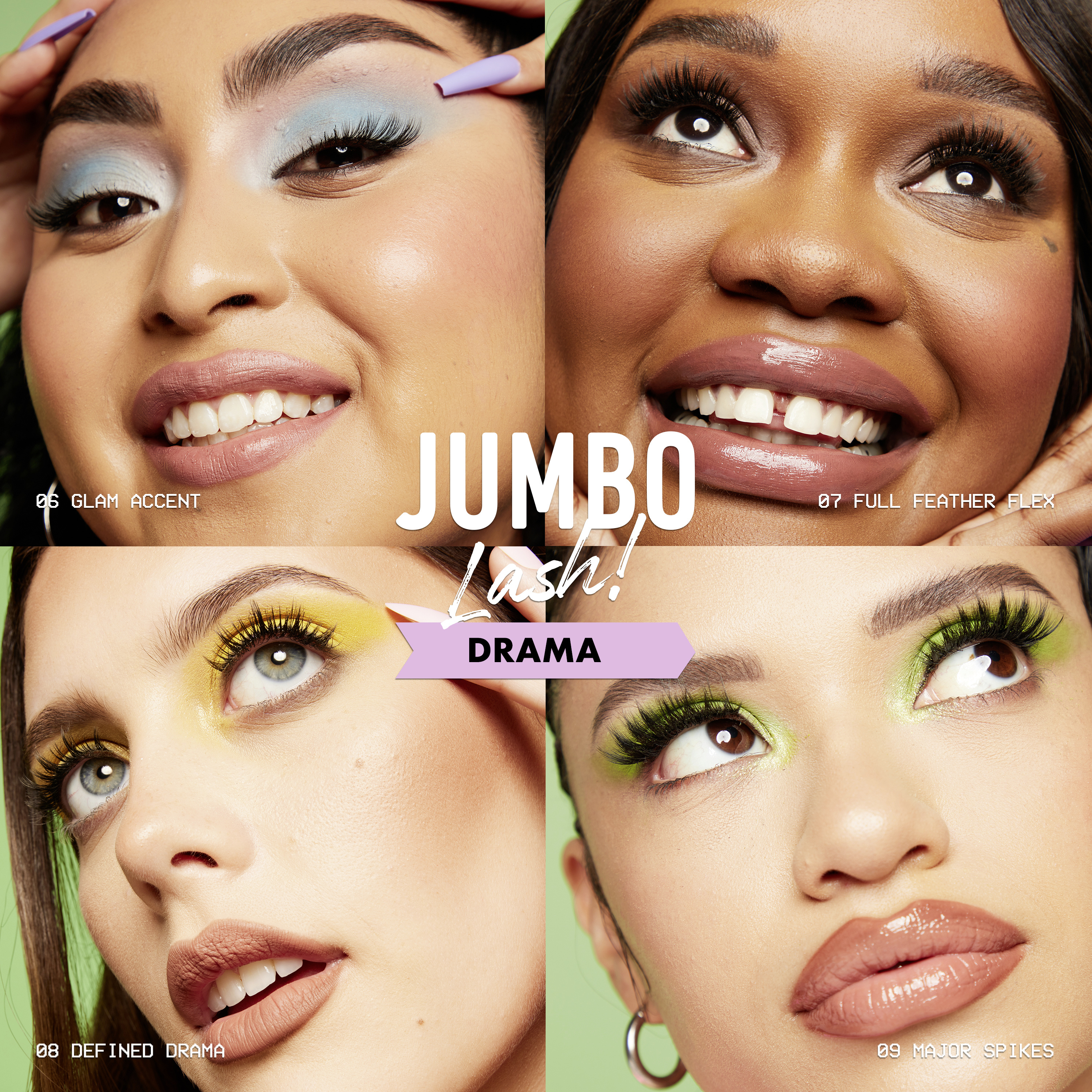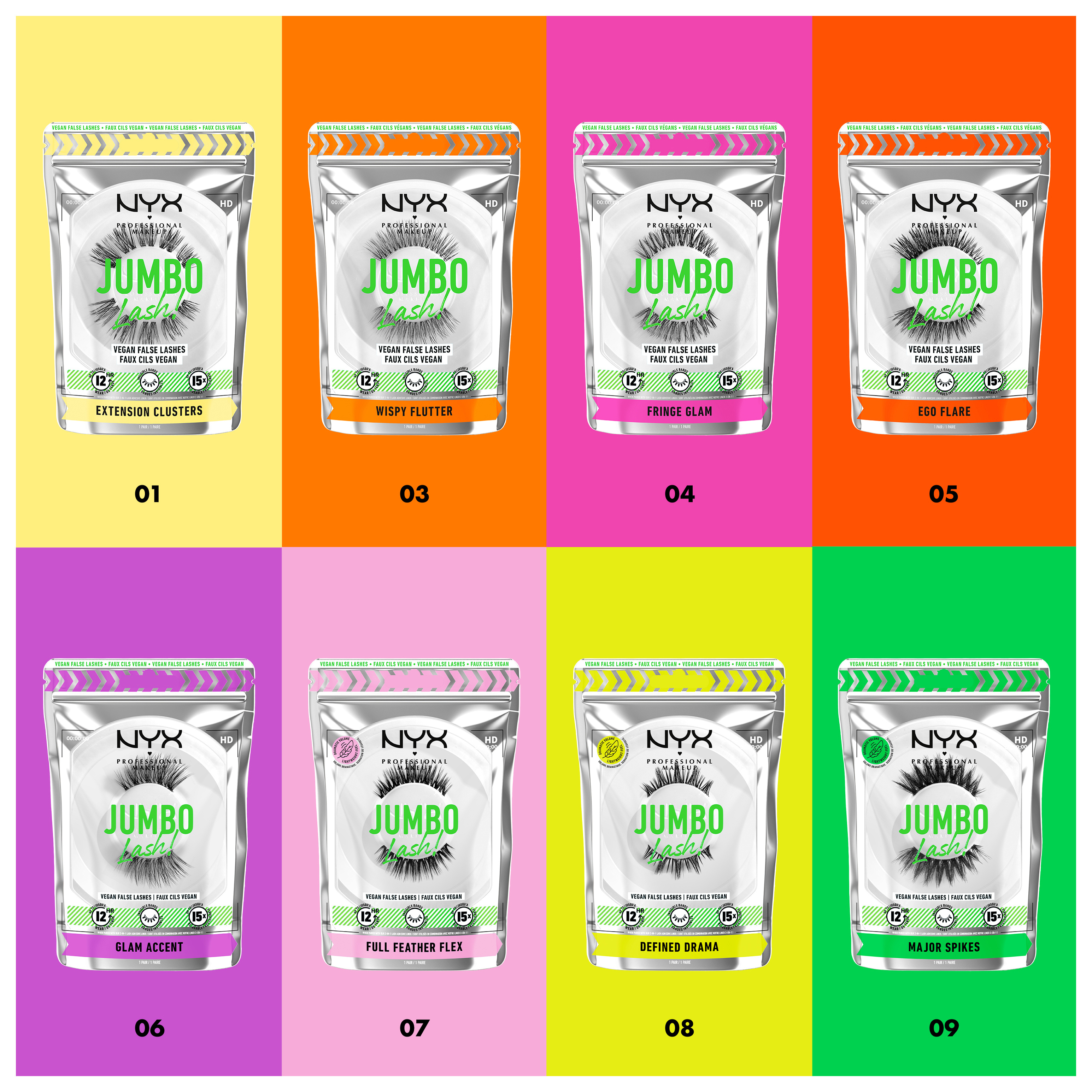 Dodejte vašim řasám JUMBO energii! Seznamte se s naší vegan* technologií umělých řas. Nyní ve 4 nových přirozeně objemných stylech, lehké jako pírko, s dlouhotrvající výdrží! Vytvořte profesionální vzhled řas bez lepidla. Žádné magnety. Žádný povyk. Tyto inovativní falešné řasy jsou lehké, pohodlné, vrstvitelné a opakovaně použitelné. Ultra flexibilní pro nošení po dlouhé hodiny. Objevte energii krásných řas!