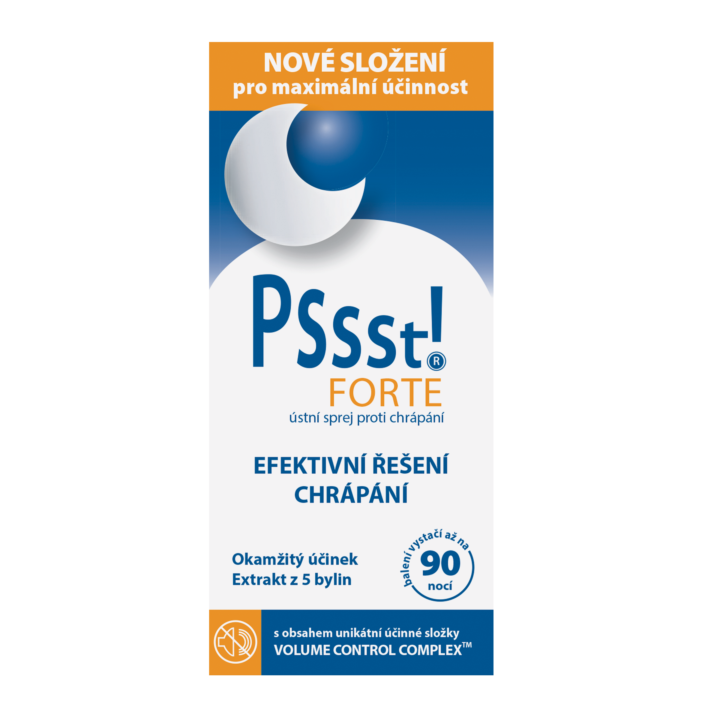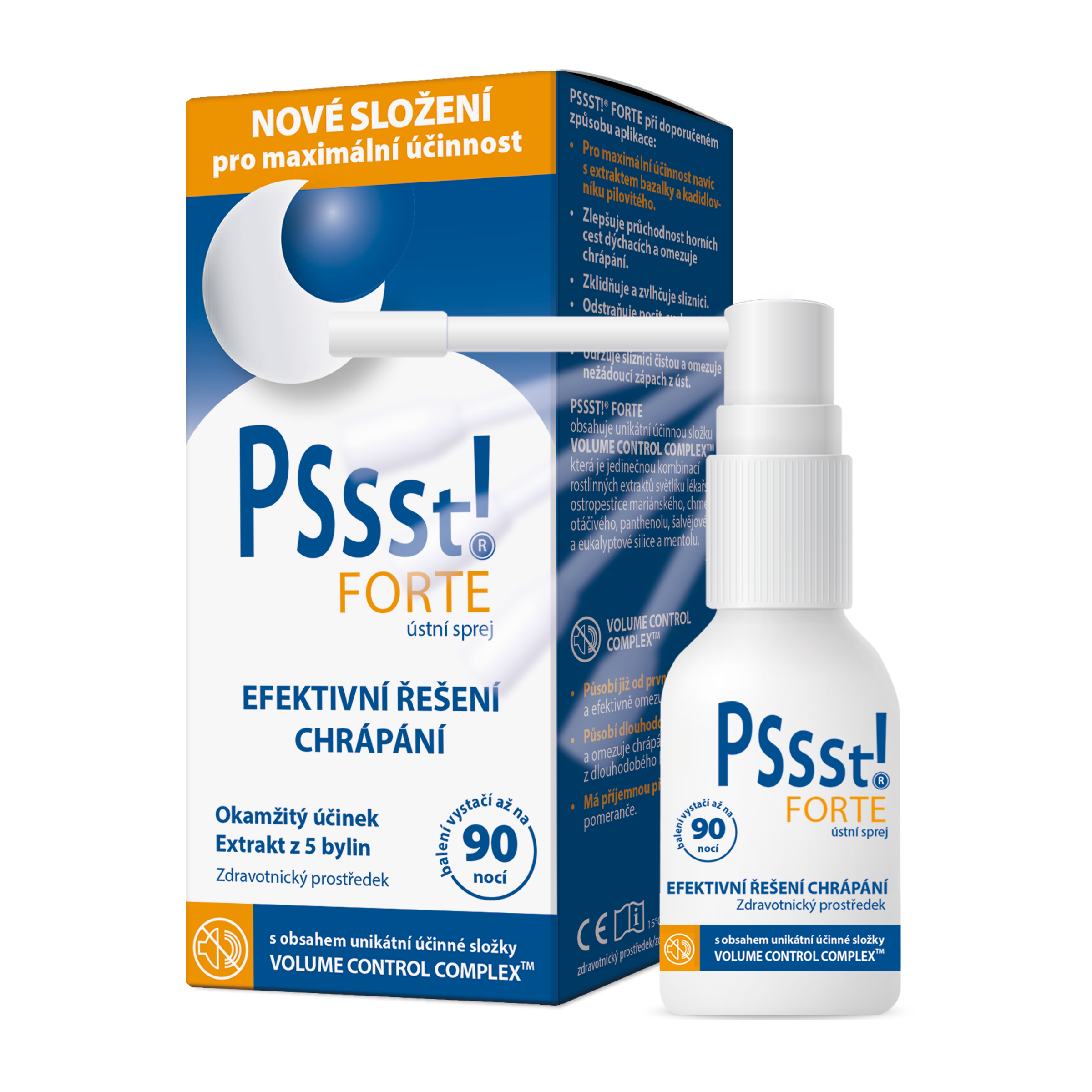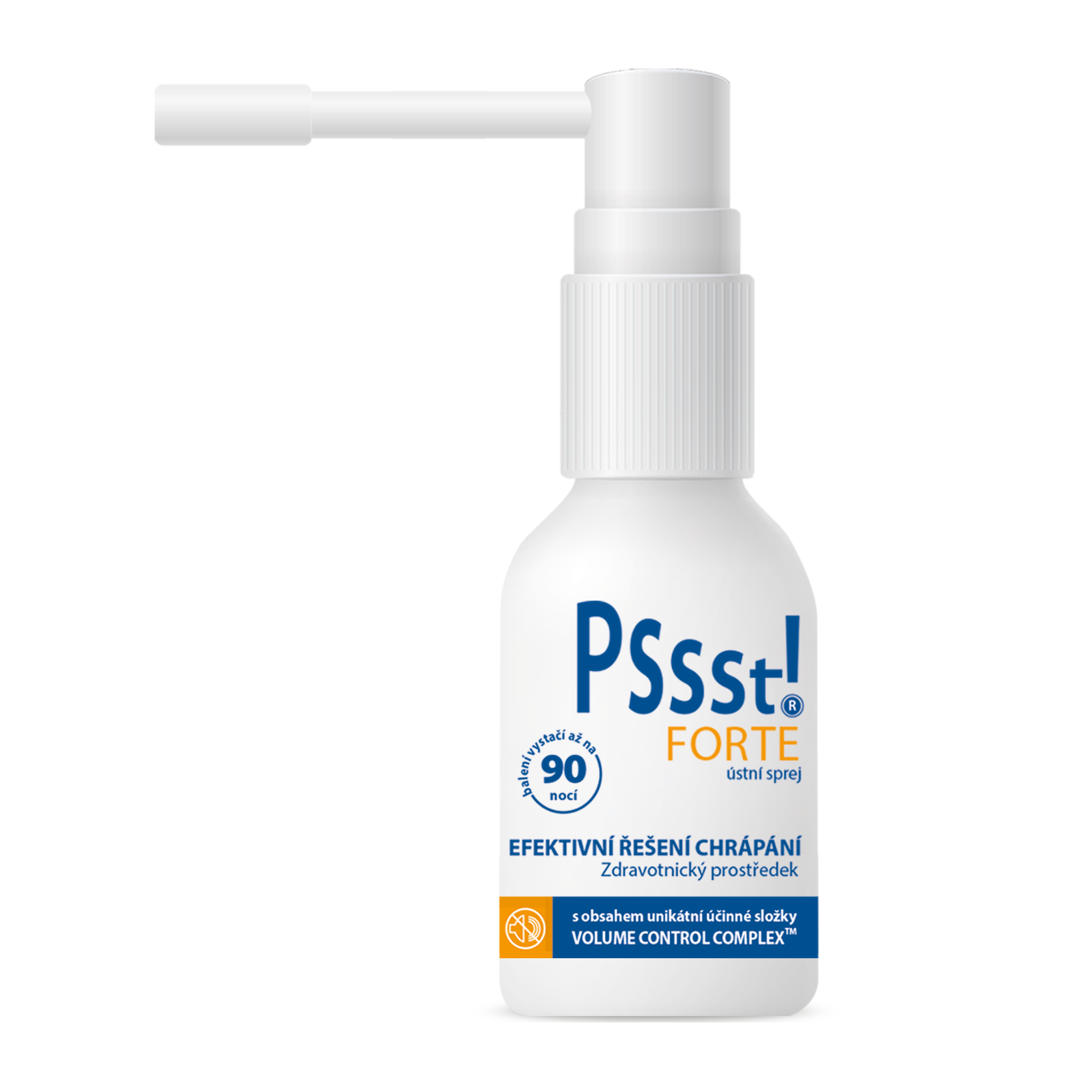 Objevte Pssst! FORTE ústní sprej proti chrápání, účinný zdravotnický prostředek s novým posíleným složením, který nabízí rychlý nástup účinku a zajišťuje klidný, ničím nerušený spánek. Tento sprej obsahuje unikátní účinnou složku VOLUME CONTROL COMPLEX™, která se zaměřuje na měkké části horních cest dýchacích, čímž efektivně snižuje chrápání.