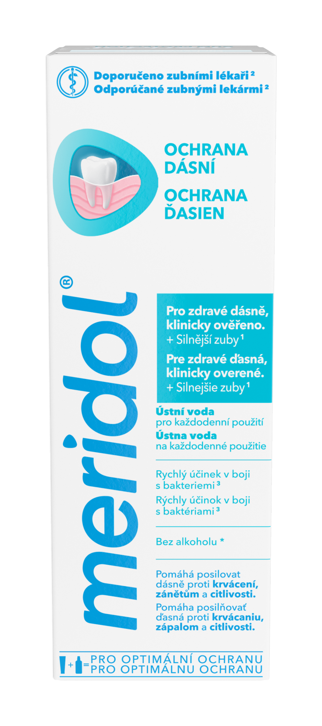 Vyplachujte si ústa ústní vodou meridol Ochrana Dásní pro péči o své zuby i dásně. Naše ústní voda na citlivé dásně nejenže pomáhá posilovat odolnost vůči zánětu, ale při pravidelném používání v kombinaci s čištěním zubů také poskytuje účinnou redukci zubního plaku – a to i na těžko dostupných místech, například mezi zuby. Je určena pro každodenní použití. Tato ústní voda bez alkoholu* byla klinicky ověřena pro podporu zdravých dásní a silnějších zubů¹ a pomáhá posilovat dásně proti krvácení, zánětu a diskomfortu. Obsahuje zinek a amin v dvojím aktivním složení, které bojuje proti bakteriím a poskytuje rychlý účinek v boji s bakteriemi² s dlouhotrvající ochranou dásní. Ústní voda na dásně je vyvinuta ve spolupráci s dentálními odborníky a její účinnost je klinicky ověřená. Je doporučována zubními lékaři³. Naše ústní voda pomáhá chránit před zubním kazem, parodontitidou, zánětem dásní (gingivitidou), citlivostí dásní a krvácením či ustupujícími dásněmi. Její složení je navíc navrženo tak, aby nezabarvovalo zuby. Dopřejte svým zubům a dásním optimální ochranu díky této ústní vody na ochranu dásní.