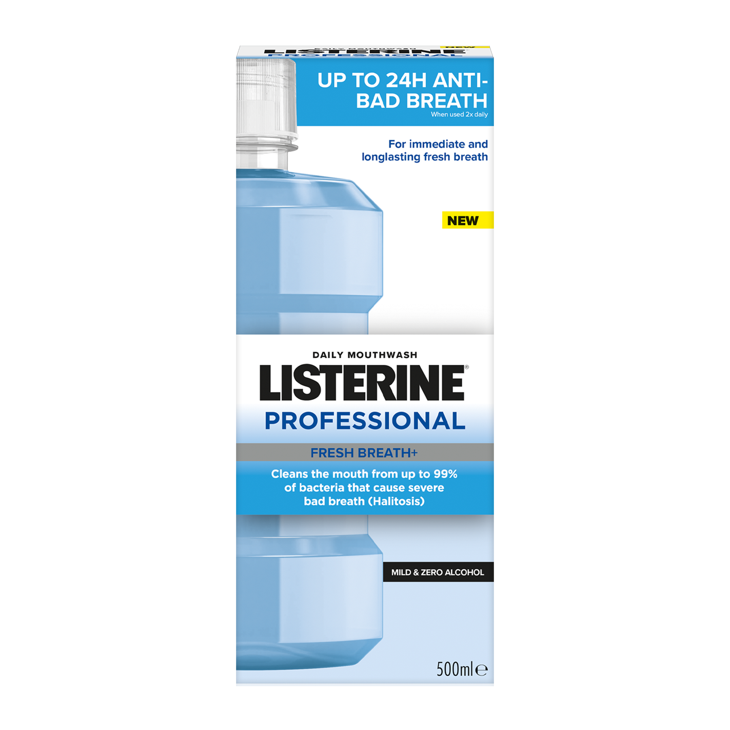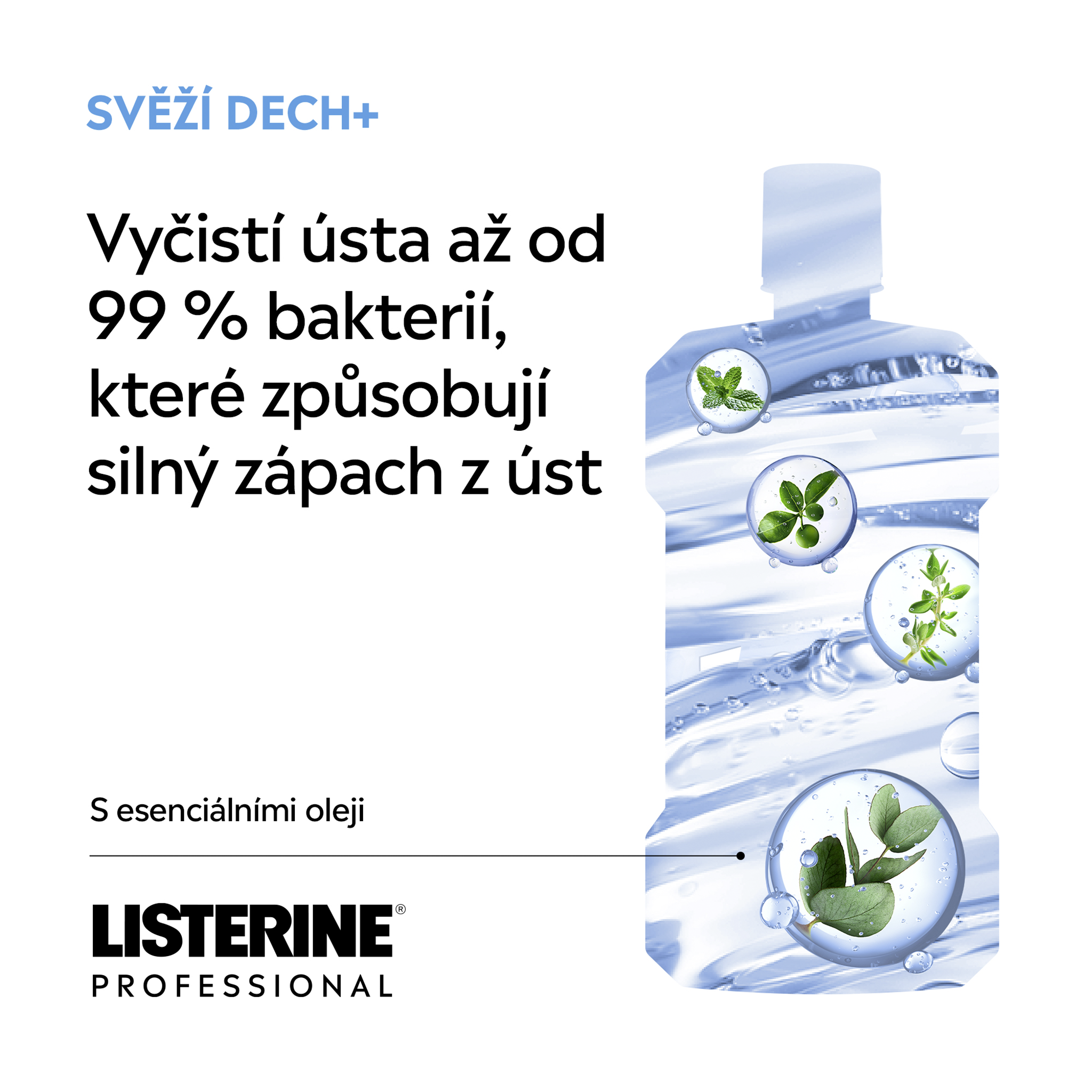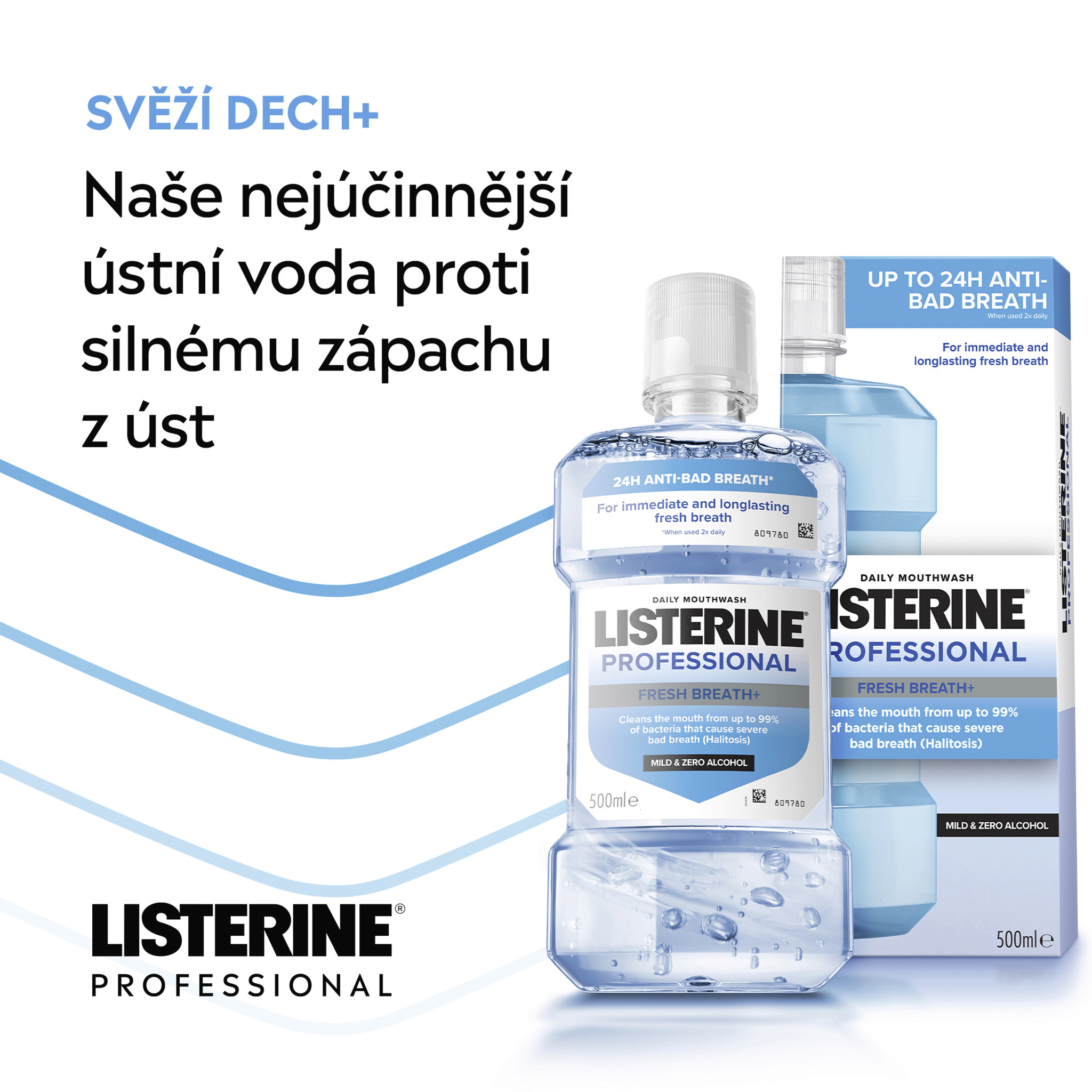 Ústní voda LISTERINE® PROFESSIONAL FRESH BREATH+ s esenciálními oleji, zinkem a technologií neutralizující zápach při používání 2x denně čistí ústa od bakterií, které způsobují silný zápach z úst (halitózu). Pro až 24h bez zápachu z úst*. Pomáhá chránit před bakteriemi, které způsobují špatný dech. Jemné složení, bez alkoholu. Nevysušuje ústa.
