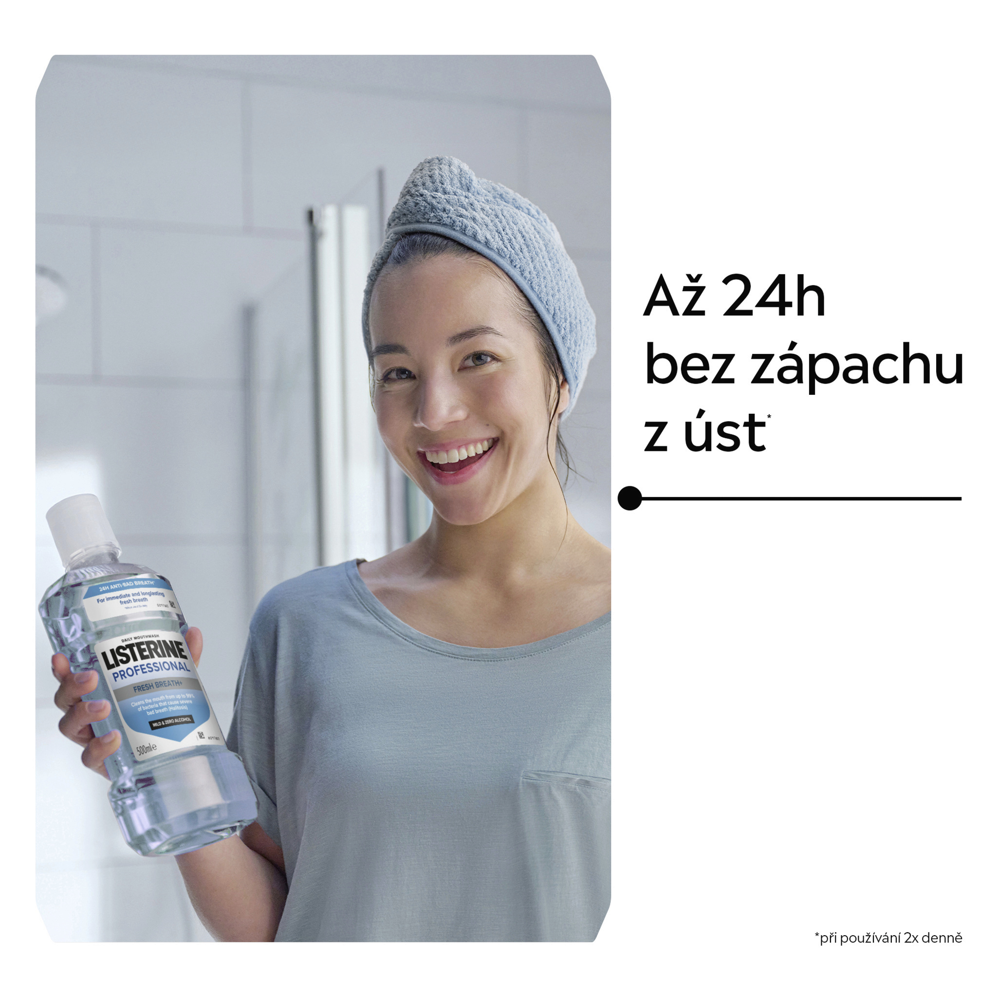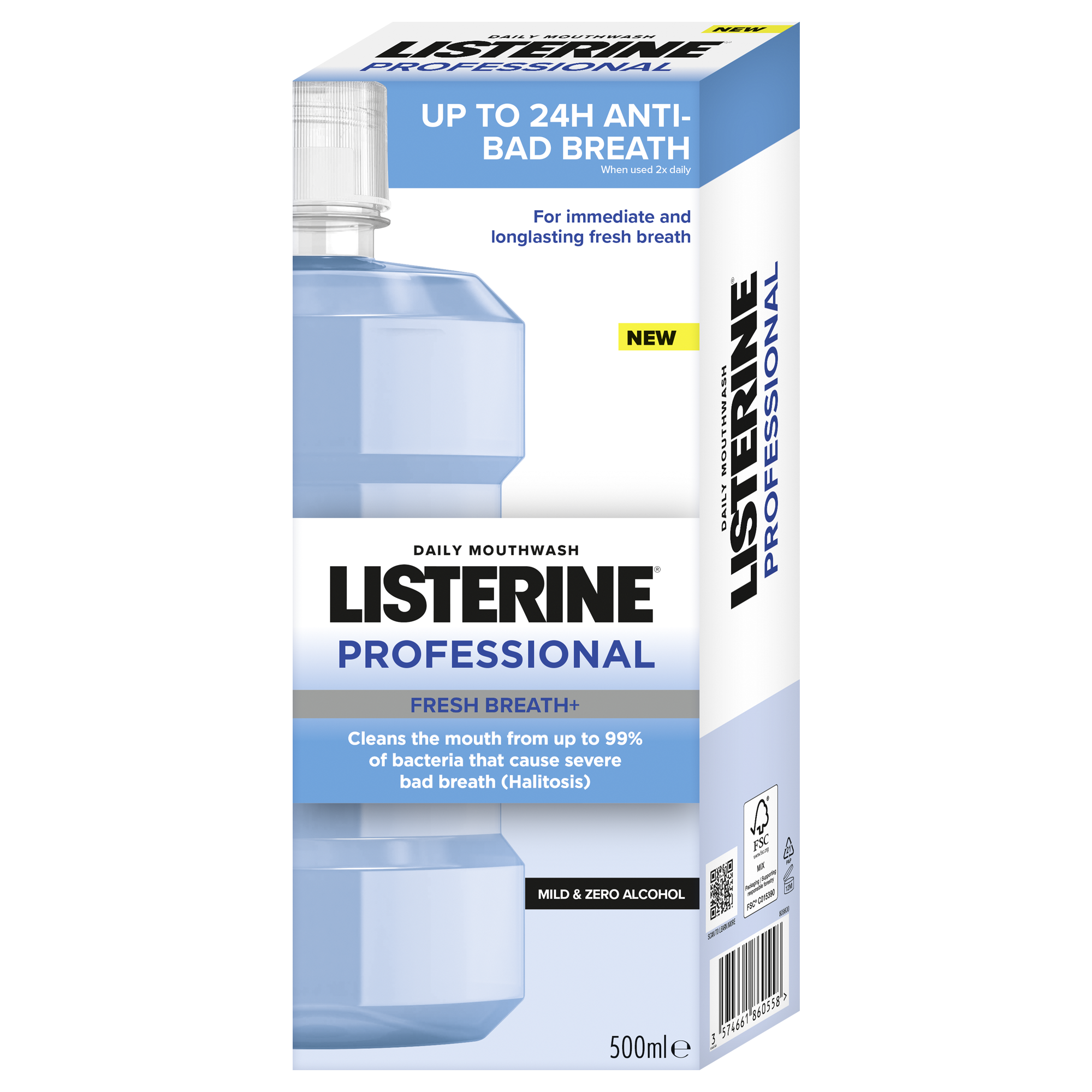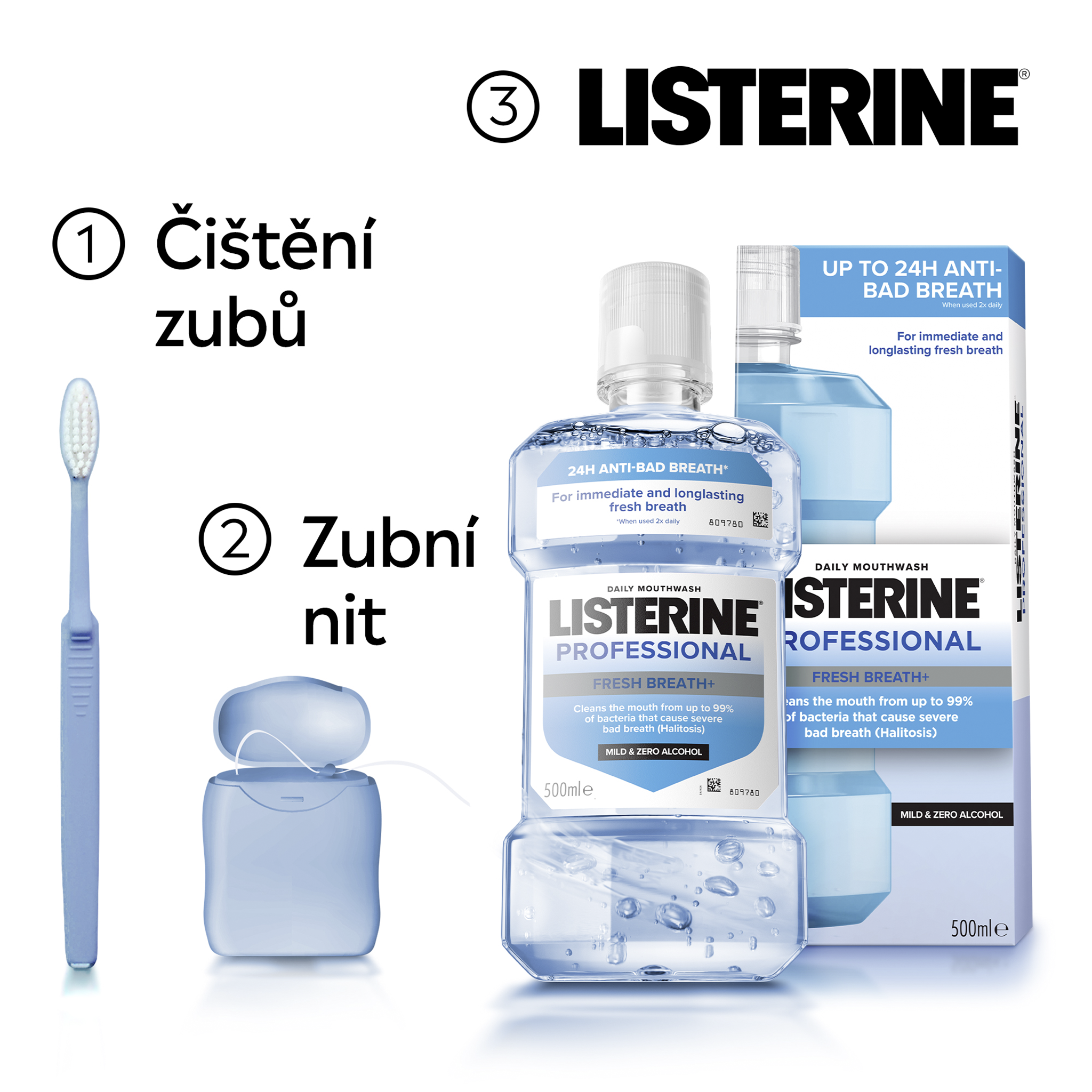 Ústní voda LISTERINE® PROFESSIONAL FRESH BREATH+ s esenciálními oleji, zinkem a technologií neutralizující zápach při používání 2x denně čistí ústa od bakterií, které způsobují silný zápach z úst (halitózu). Pro až 24h bez zápachu z úst*. Pomáhá chránit před bakteriemi, které způsobují špatný dech. Jemné složení, bez alkoholu. Nevysušuje ústa.