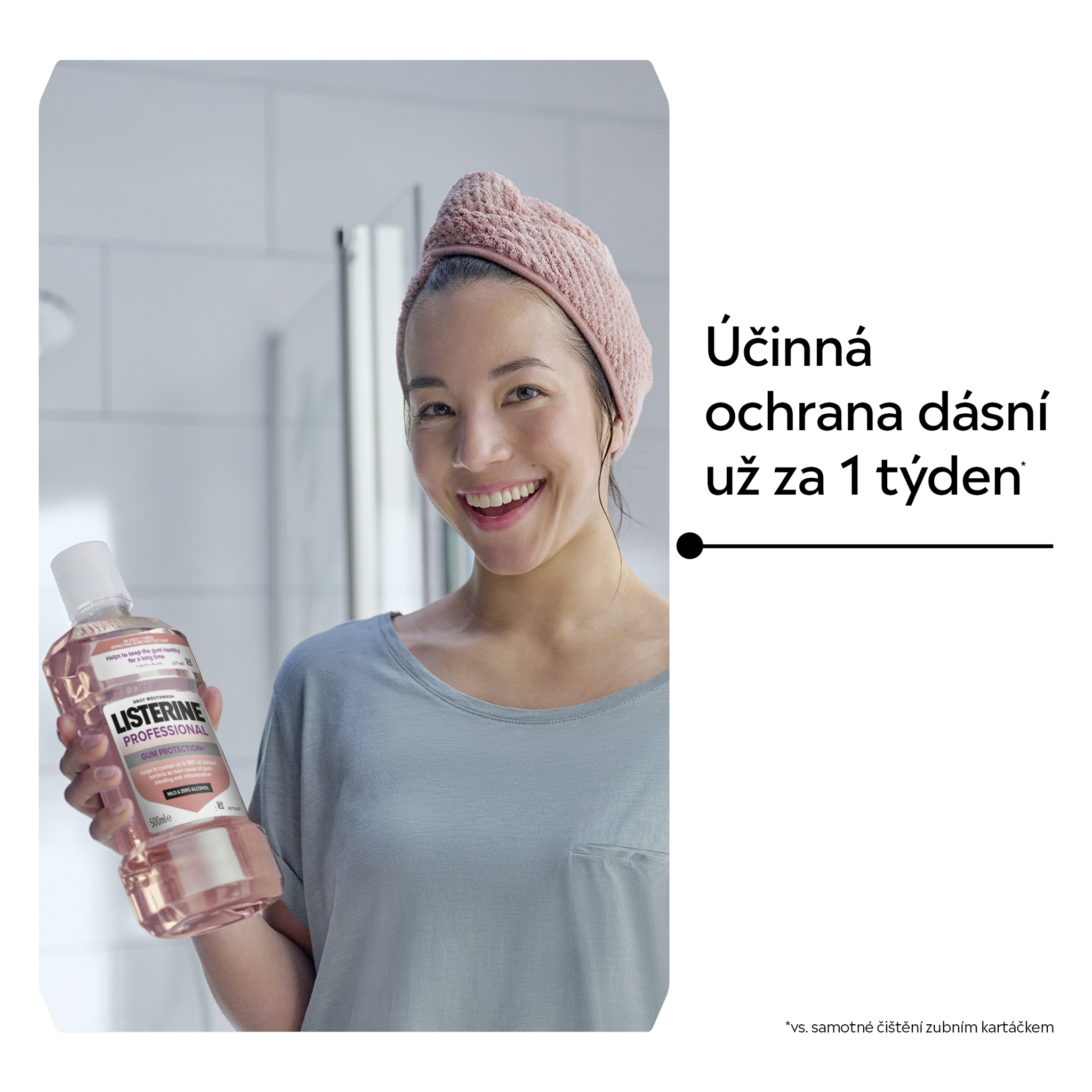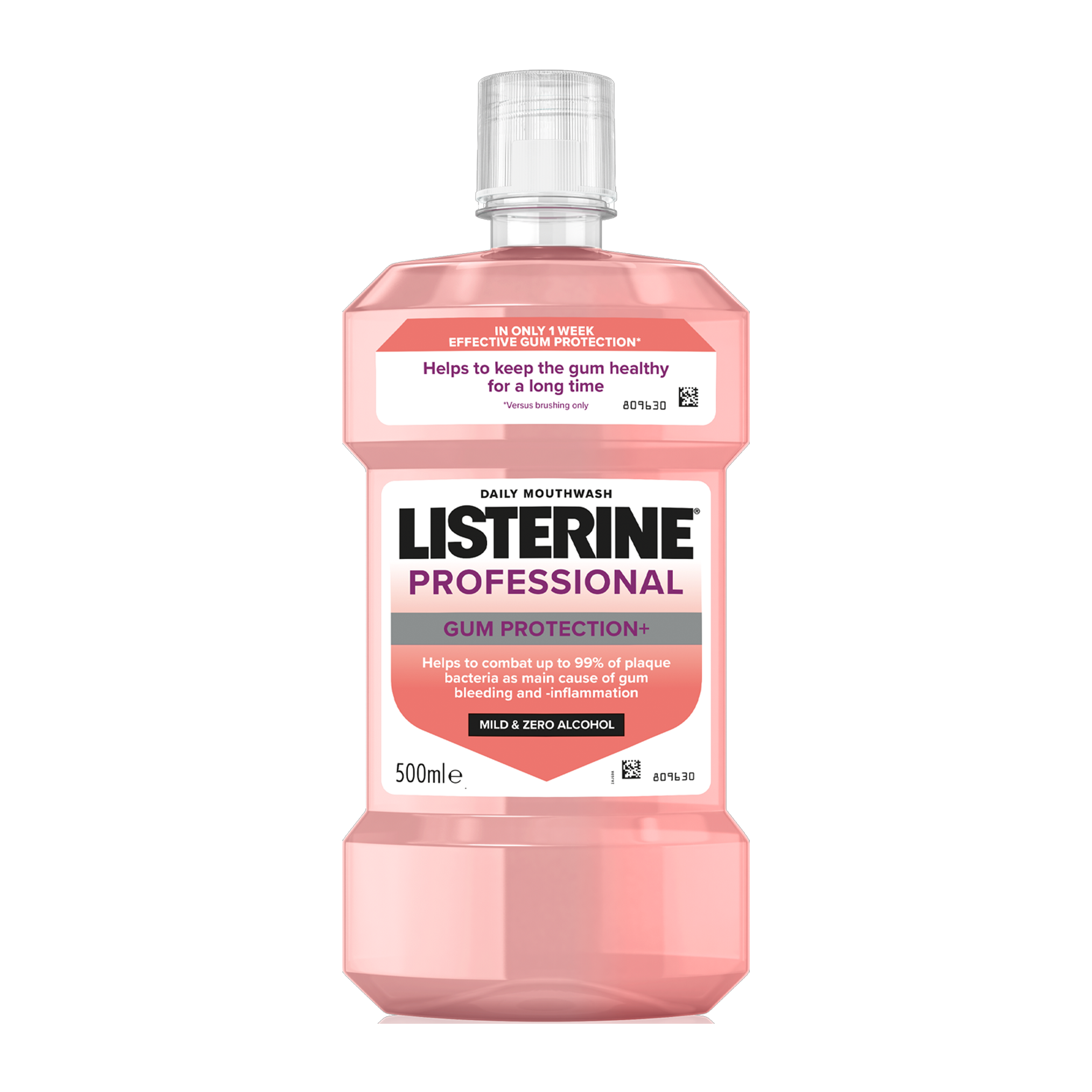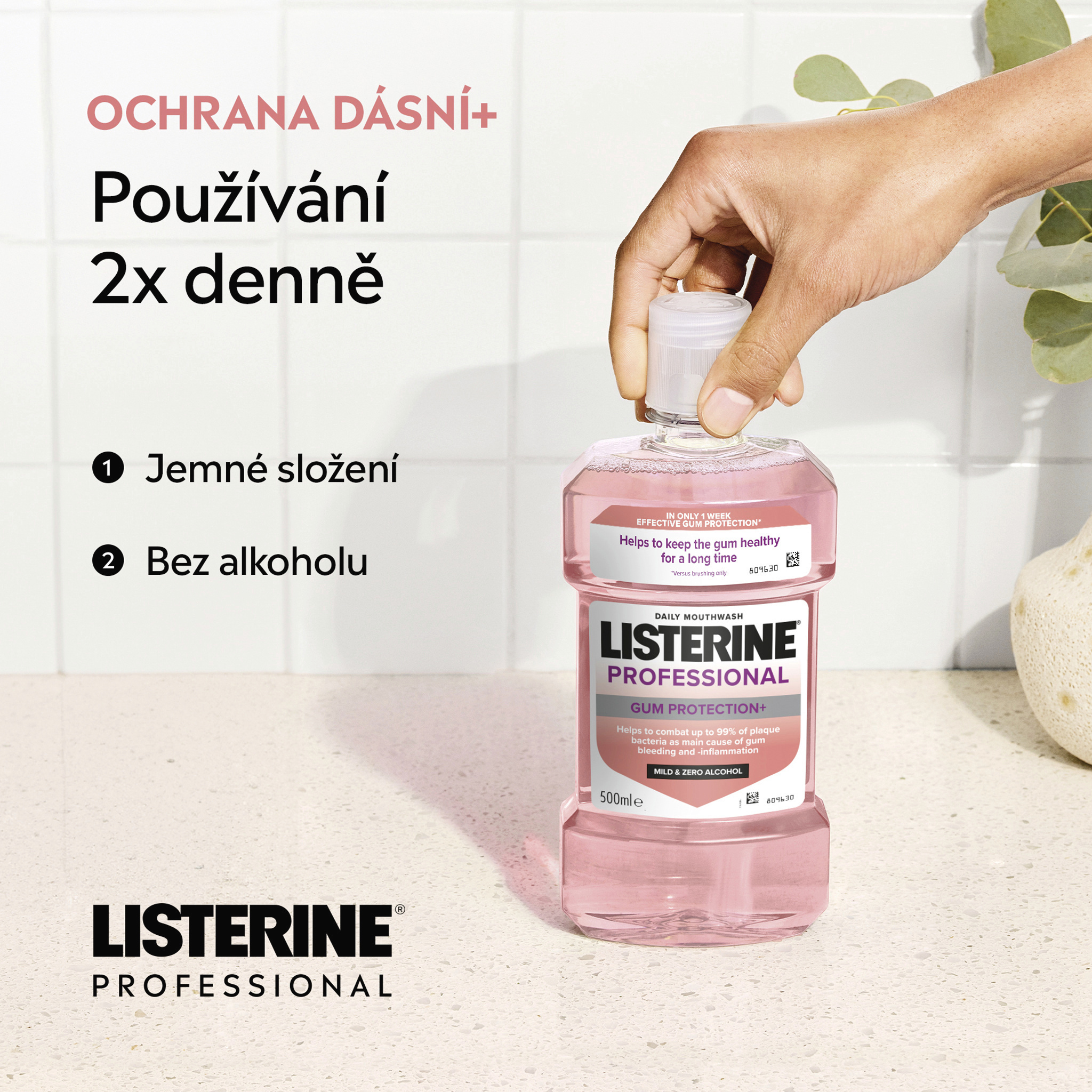 Ústní voda LISTERINE® PROFESSIONAL GUM PROTECTION+ s esenciálními oleji, fluoridem a nejvyšším obsahem zinku v rámci ústních vod LISTERINE® pomáhá bojovat proti zubnímu plaku, hlavní příčině krvácení a zánětu dásní, při používání 2x denně. Poskytuje účinnou ochranu dásní už za 1 týden*. Pomáhá chránit před opakujícími se problémy s dásněmi. Při nepřežitém používání pomáhá udržovat dásně zdravé. Jemné složení, bez alkoholu. Nevysušuje ústa.