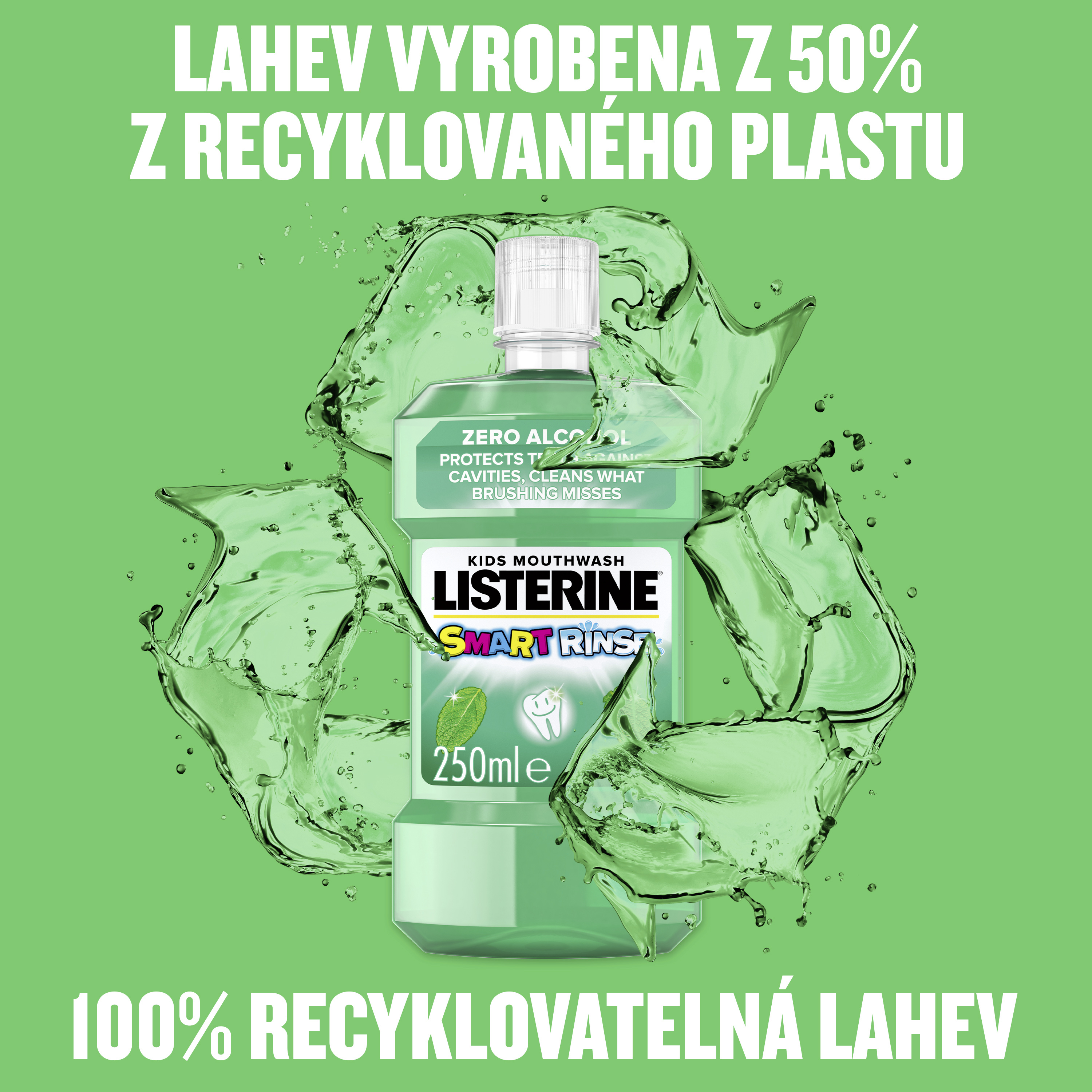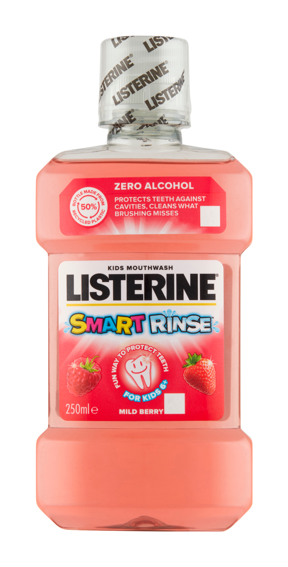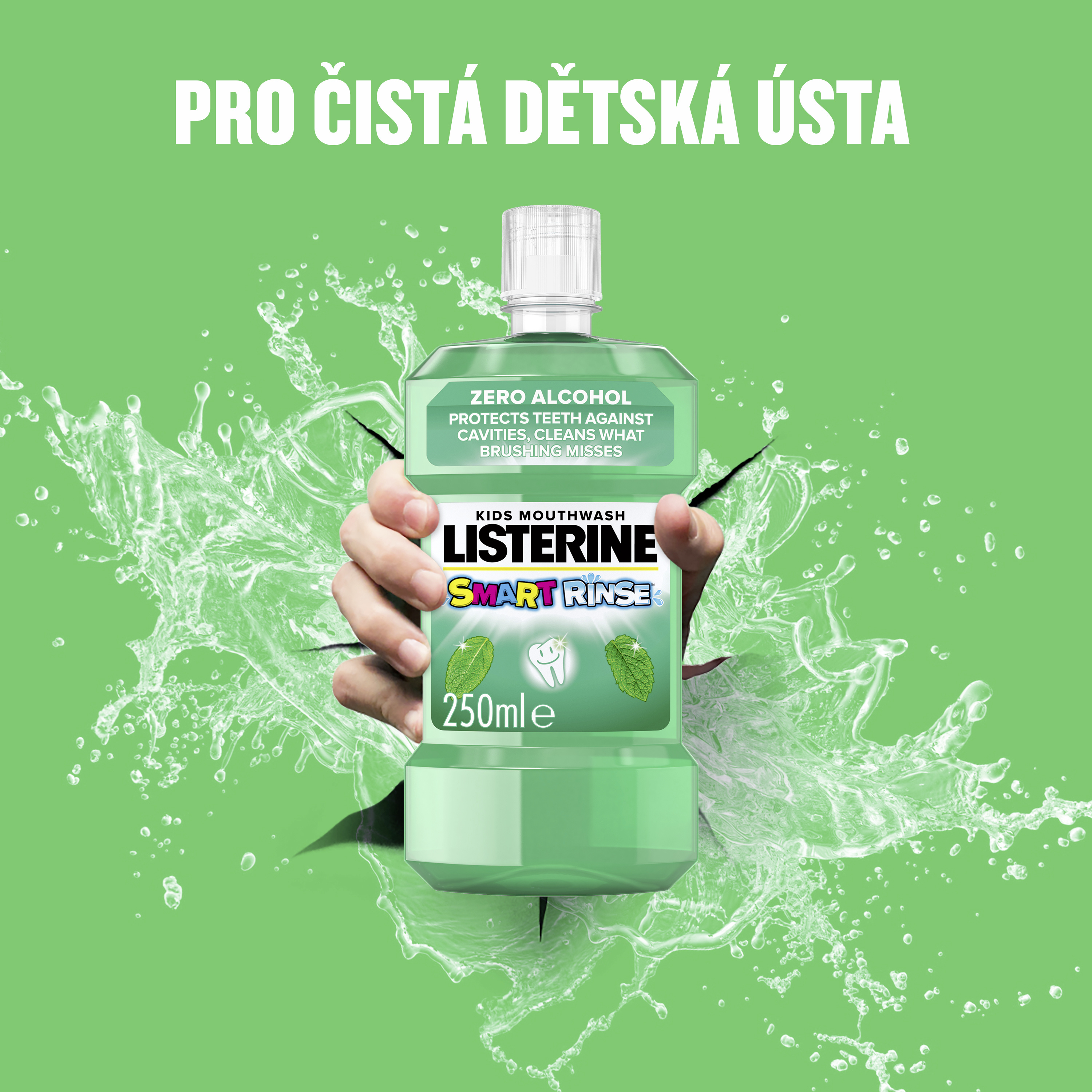 LISTERINE® SMART RINSE® je ústní voda s fluoridem, která pomáhá chránit zuby Vašeho dítěte před zubním kazem při používání dvakrát denně po čištění zubním kartáčkem. Odstraňuje bakterie způsobující zubní povlak a zápach z úst. Pro čistější a svěžejší ústa než při samotném čištění zubním kartáčkem.