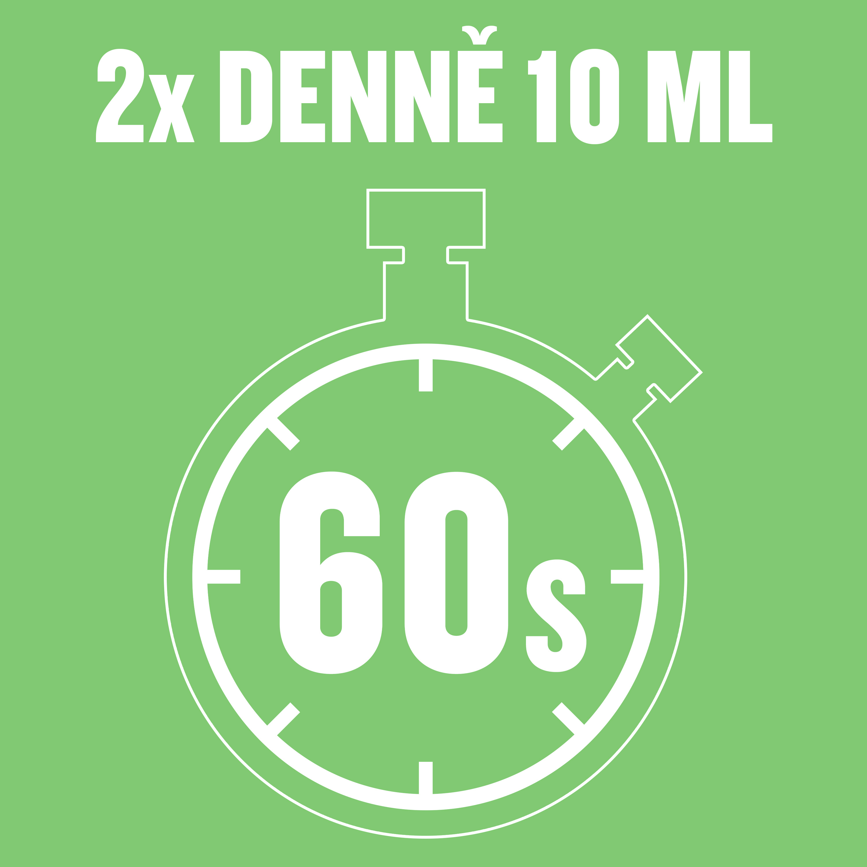 UCHOVÁVEJTE MIMO DOSAH DĚTÍ. Používání není vhodné pro děti do 6 let. Nepolykejte. Nepoužívejte, pokud je uzávěr lahve při koupi poškozen. Pokud používáte doplňky obsahující fluorid, poraďte se se svým zubním lékařem. Po vypláchnutí 30 minut nejezte a nepijte.