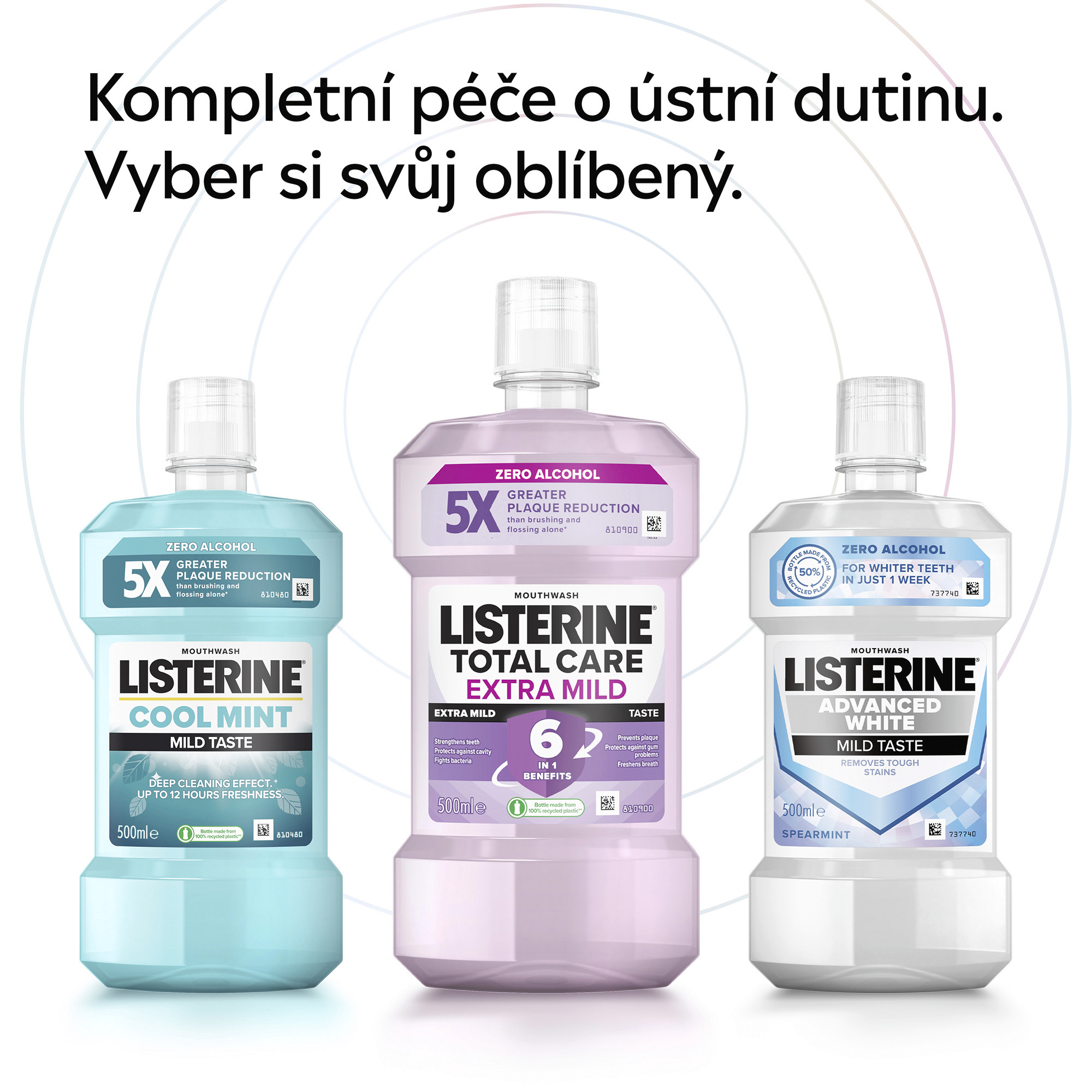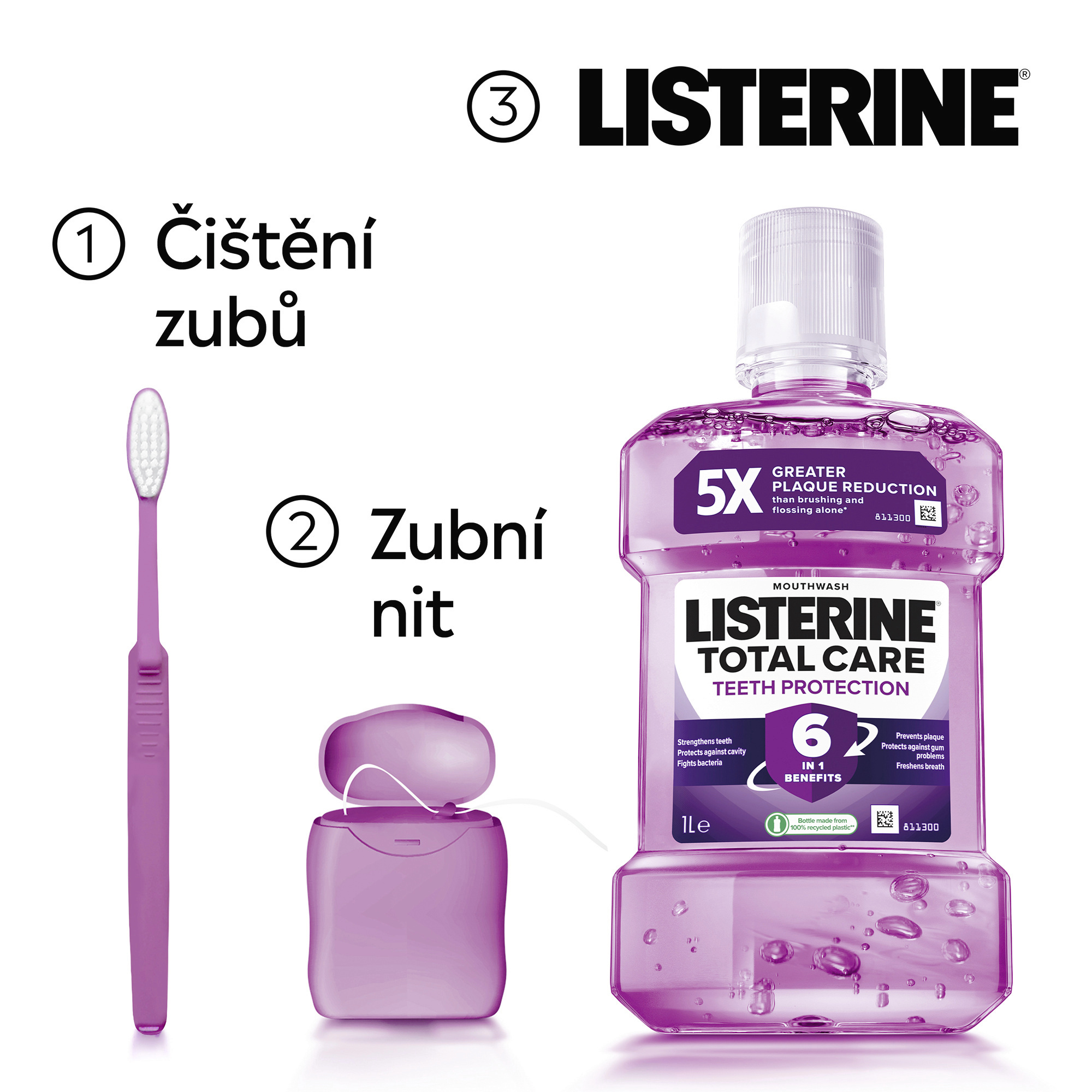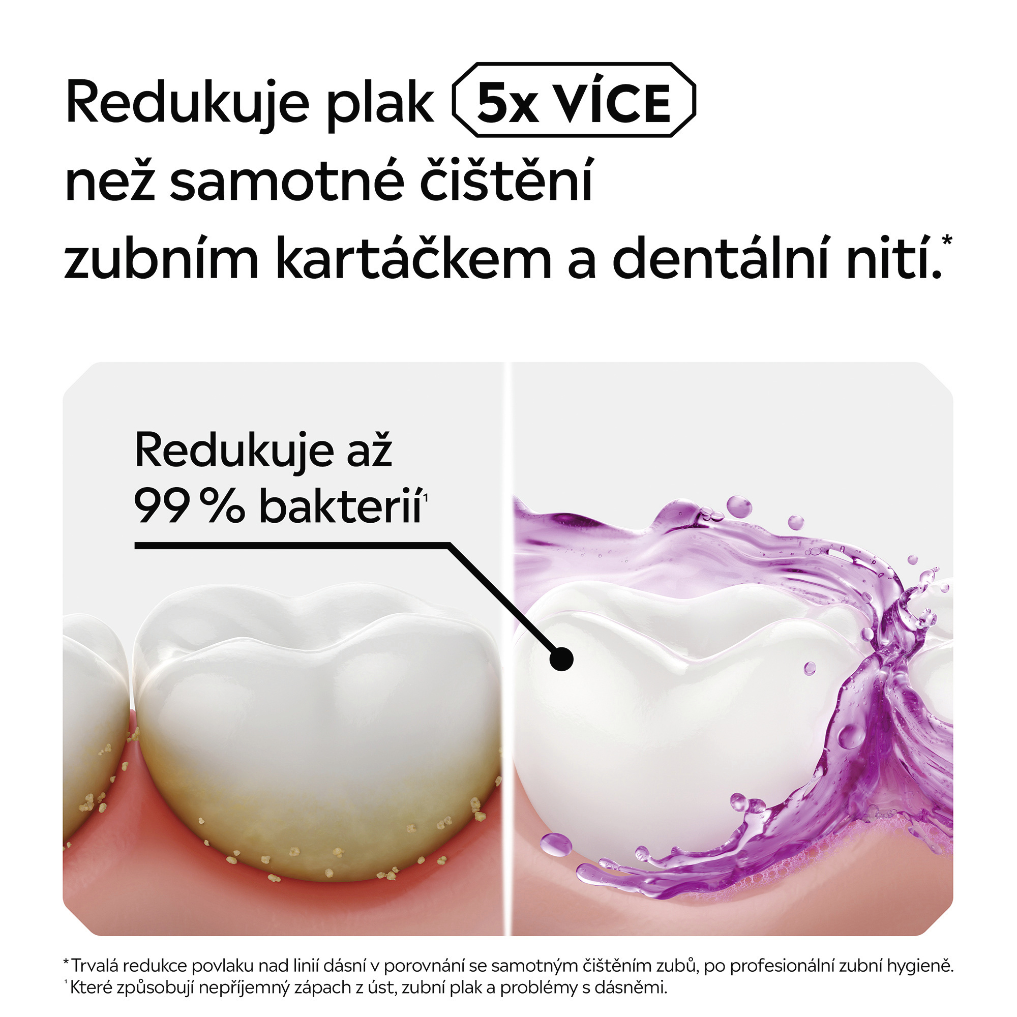 Proč používat ústní vodu LISTERINE®? Vyplachování úst dvakrát denně není jen skvělým způsobem, jak si zachovat svěží dech. Je to klíč k tomu, aby celá vaše ústa byla čistá. Je pravda, že samotným čištěním zubním kartáčkem vyčistíte pouze 25 % úst. Síla ústní vody porazí bakterie ve vaší ústní dutině, na zubech i dásních. LISTERINE® má klinicky prokázaný antibakteriální účinek – obsahuje unikátní kombinaci 4 esenciálních olejů, zároveň však ústní flóra zůstává v rovnováze. Při použití dvakrát denně LISTERINE® odstraňuje bakterie, které v ústech zůstávají po čištění zubů. Bylo prokázáno, že LISTERINE® zlepšuje vaši ústní hygienu a účinkuje v místech, které jsou zubním kartáčkem obtížně dosažitelné. Zároveň také omezuje a předchází tvorbě zubního plaku, jedné z hlavních příčin problémů s dásněmi, a osvěží váš dech.