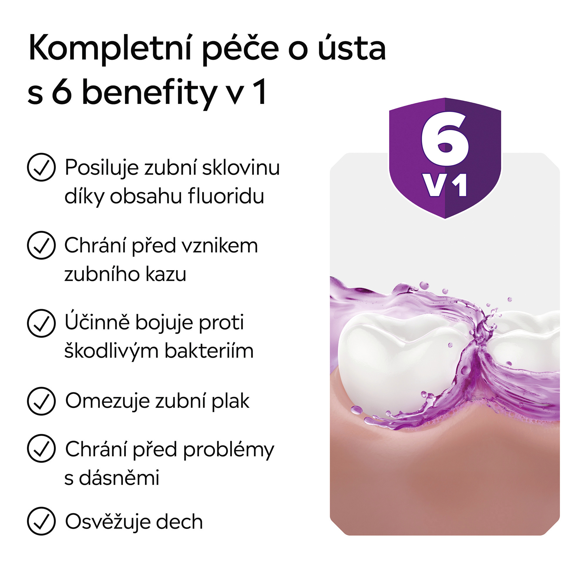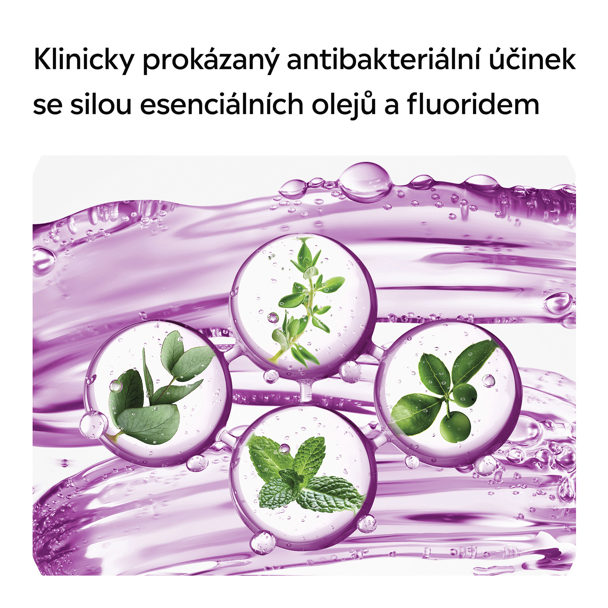 - Díky jedinečné kombinaci esenciálních olejů účinně bojuje proti bakteriím i tam, kam se zubní kartáček nedostane: mezi zuby, na dásních a na jazyku