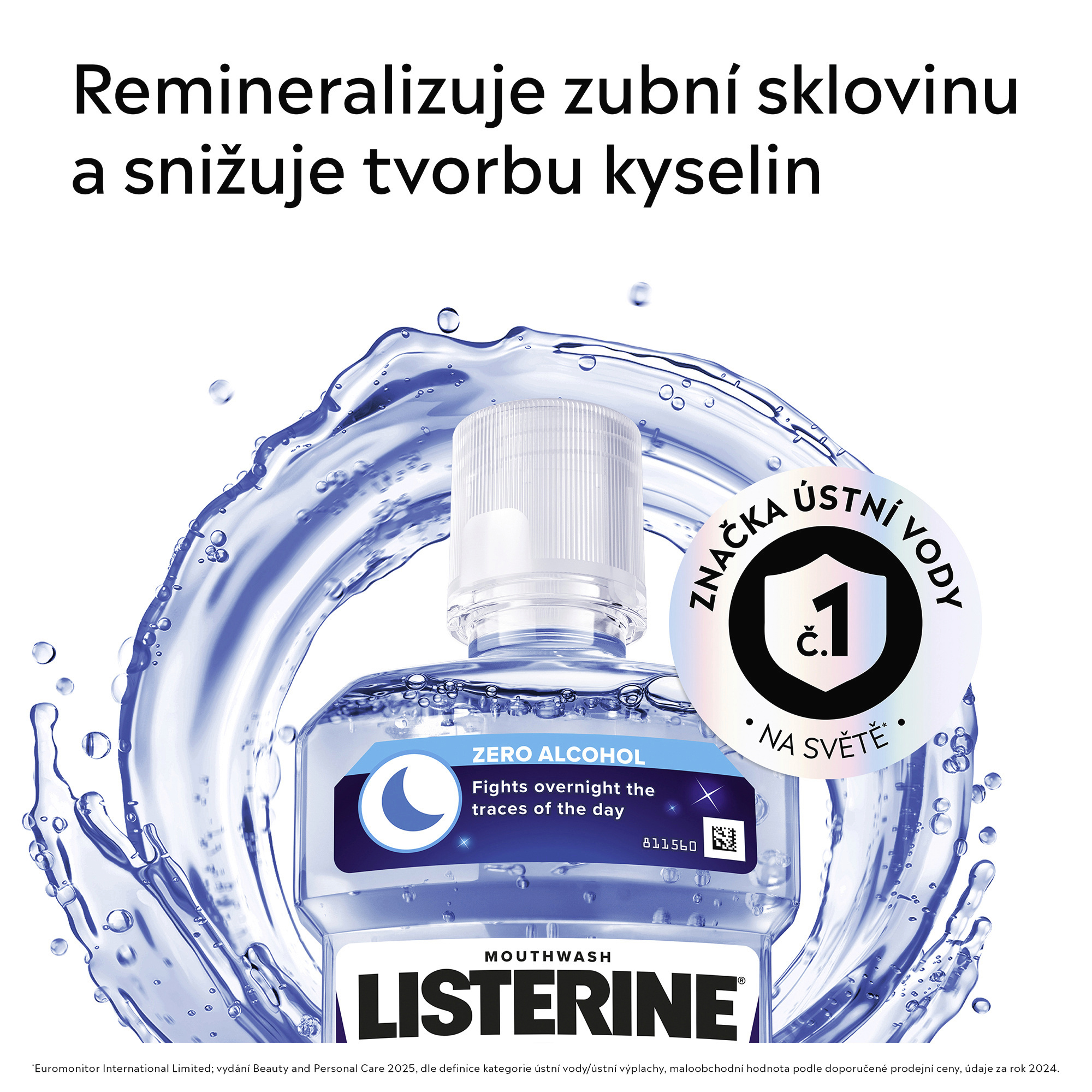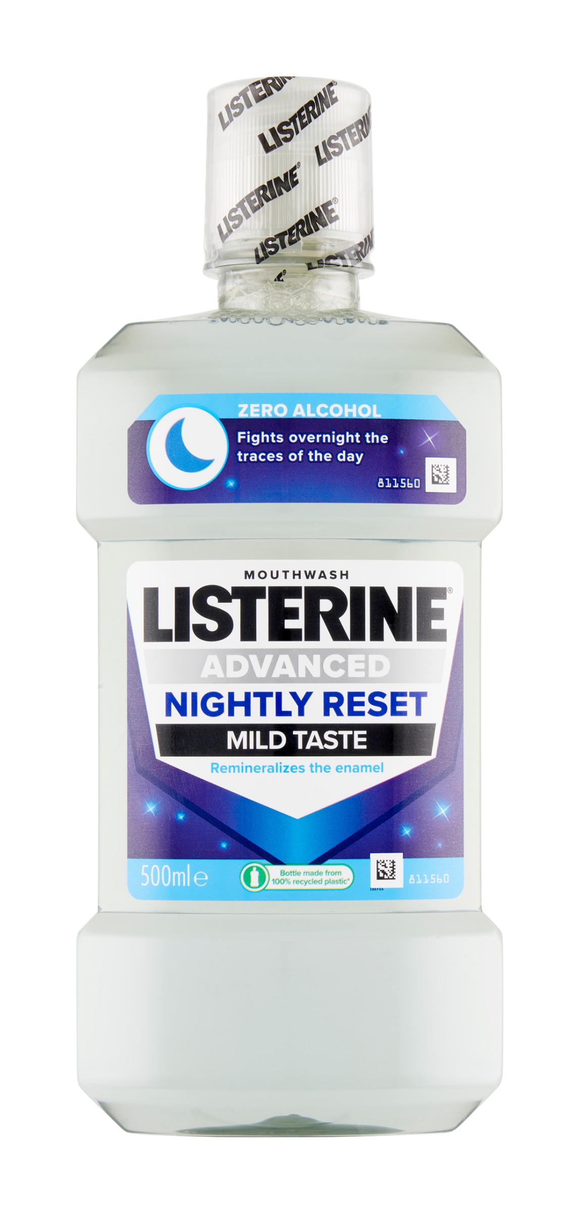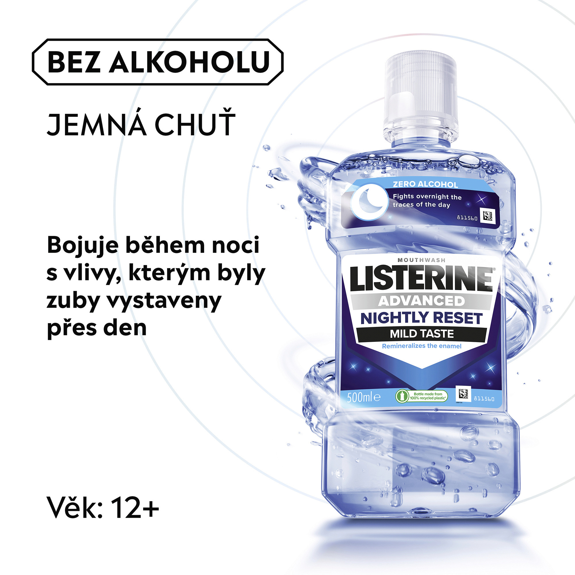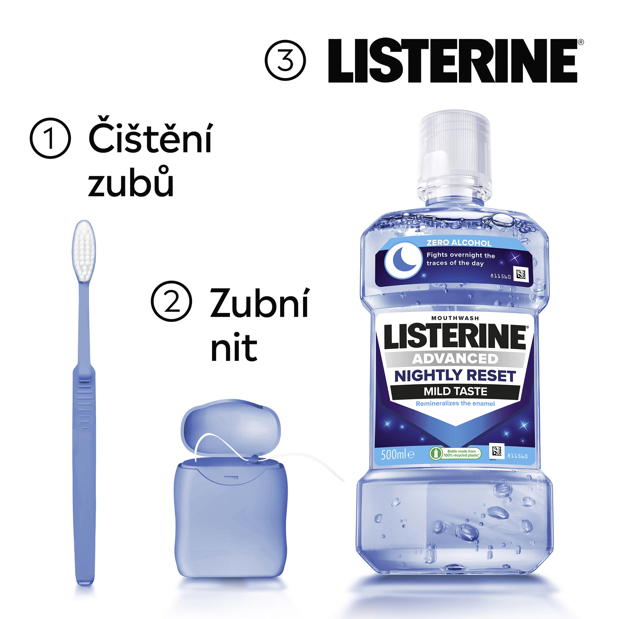 Během konzumace jídla a pití vznikají v ústech cukerné kyseliny, které ze zubů uvolňují minerální látky. Výsledkem může být větší náchylnost Vašich zubů ke vzniku zubního kazu - zejména v noci. LISTERINE® ADVANCED NIGHTLY RESET snižuje tvorbu kyselin a RAPID FUSION™ technologie remineralizuje zubní sklovinu. Pro účinnější vstřebávání fluoridu a silnější zuby. Inovativní složení bojuje během noci s vlivy, kterým byly Vaše zuby vystaveny přes den: