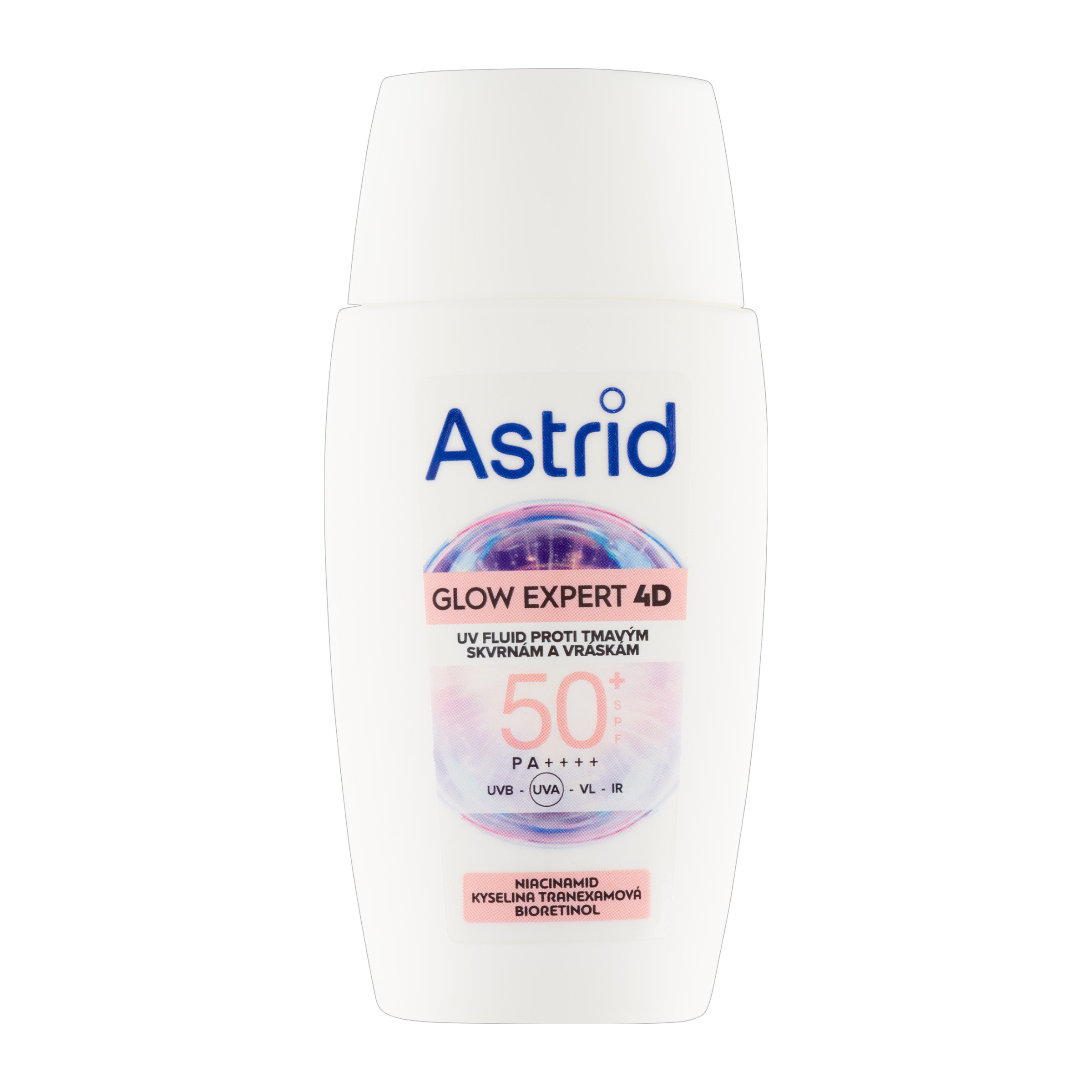 Astrid Glow Expert 4D Ultralehký denní UV fluid proti tmavým skvrnám a vráskám SPF 50+ chrání vaši pleť tím, že pomáhá předcházet jejímu fotostárnutí způsobenému škodlivým UVA, UVB, VL¹ a IR¹ zářením.