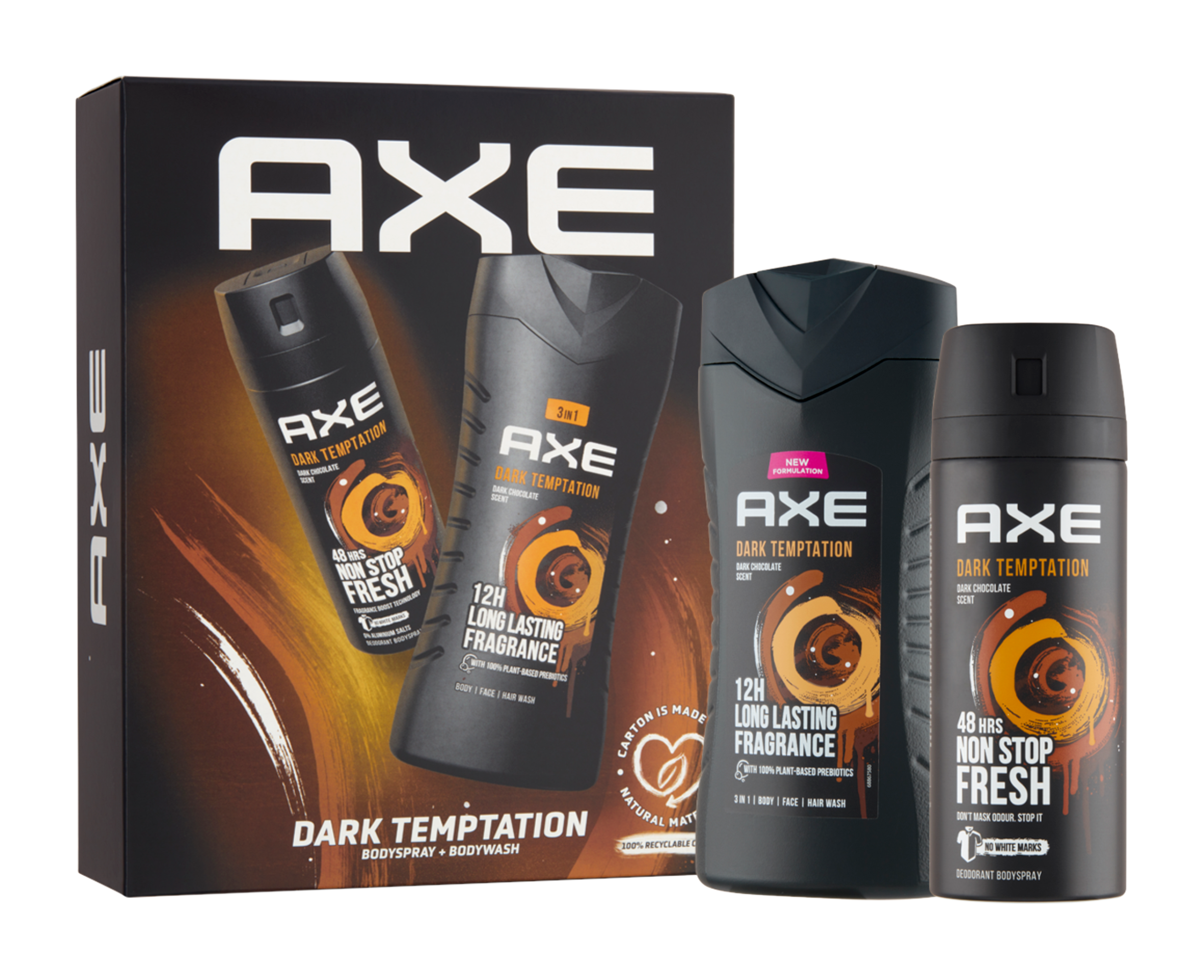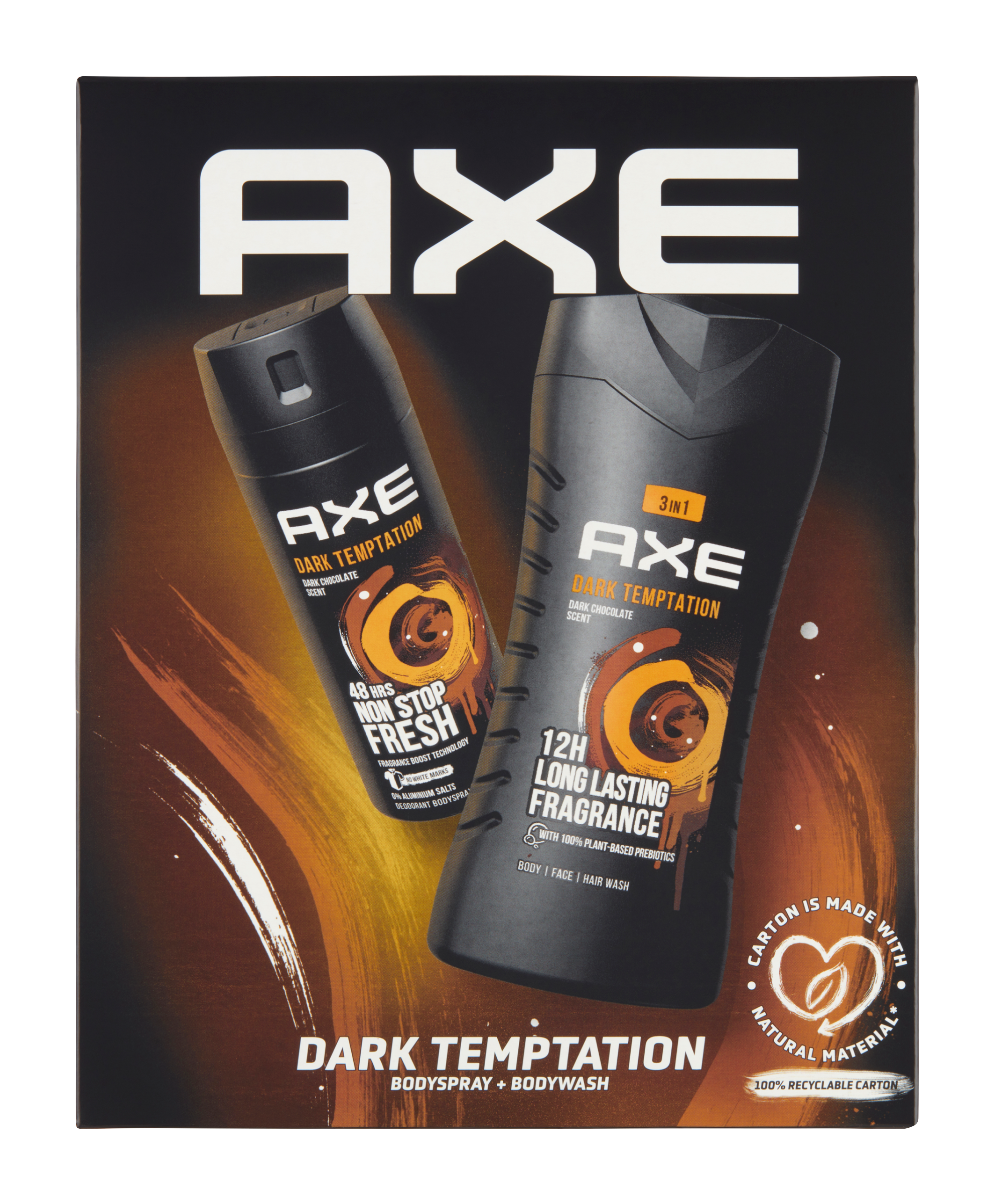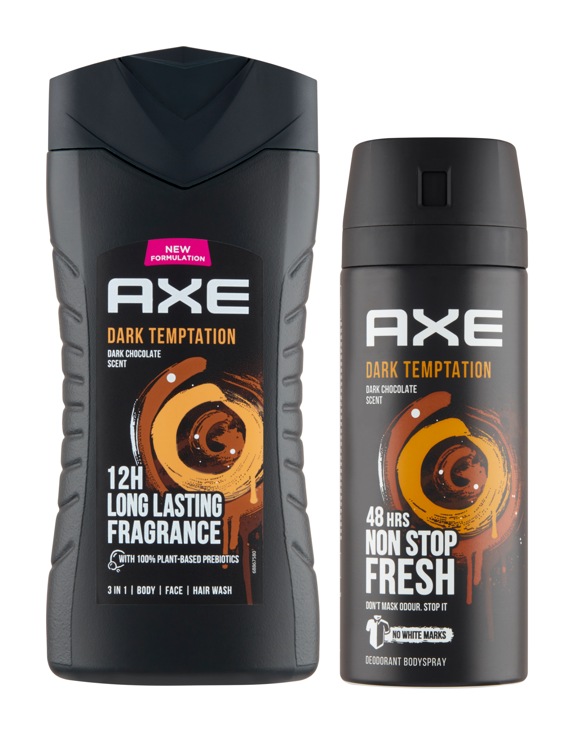 Obsahuje: Axe sprchový gel 250ml Dark Temptation, Axe deodorant 150ml Dark Temptation.