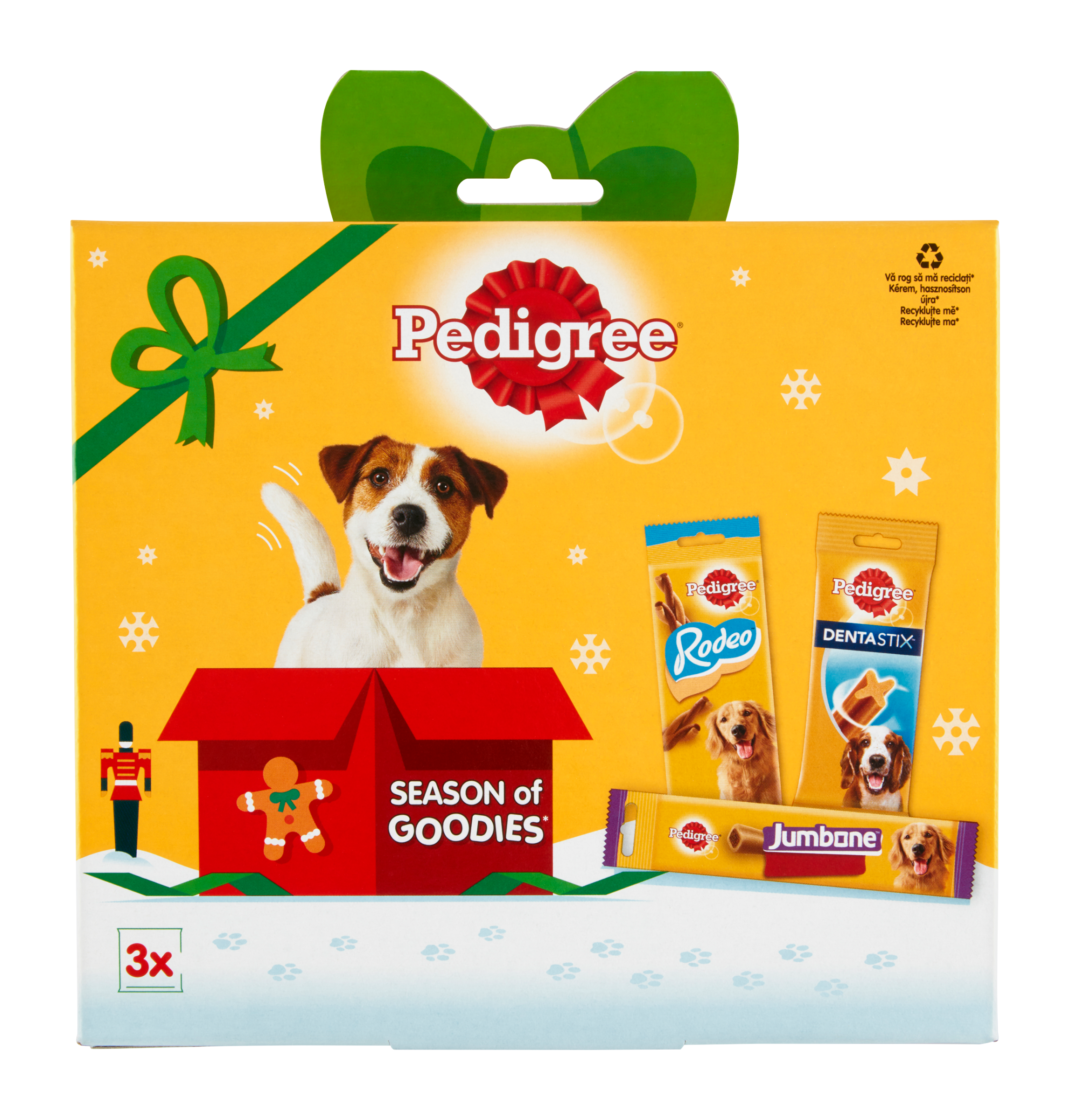 PEDIGREE® Dentastix™. Doplňkové krmivo pro psy starší 4 měsíců. Cereálie, Výrobky rostlinného původu, Minerální látky včetně 2.7% tripolyfosfátu sodného, Maso a výrobky živočišného původu, Oleje a tuky PEDIGREE® Rodeo™ s Kuřecím. Doplňkové krmivo pro dospělé psy. Výrobky rostlinného původu, Obiloviny, Maso a vedlejší produkty živočišného původu (včetně 4 % kuřecího masa), Bílkovinné extrakty rostlinného původu, Různé cukry, Minerální látky, Oleje a tuky, Semena, Bylinky PEDIGREE® Jumbone™ Hovězí a Drůbeží příchuť: Cereálie, Výrobky rostlinného původu, Různé cukry, Minerální látky, Maso a výrobky živočišného původu (obsahuje 1.3 % prášku ze sušených hovězích jater, což odpovídá 2.2% hovězího a 1.1% prášku ze sušených drůbežích jater, což odpovídá 2.5% drůbežího), Semena, Oleje a tuky, Rostlinné bílkovinné extrakty, Bylinky