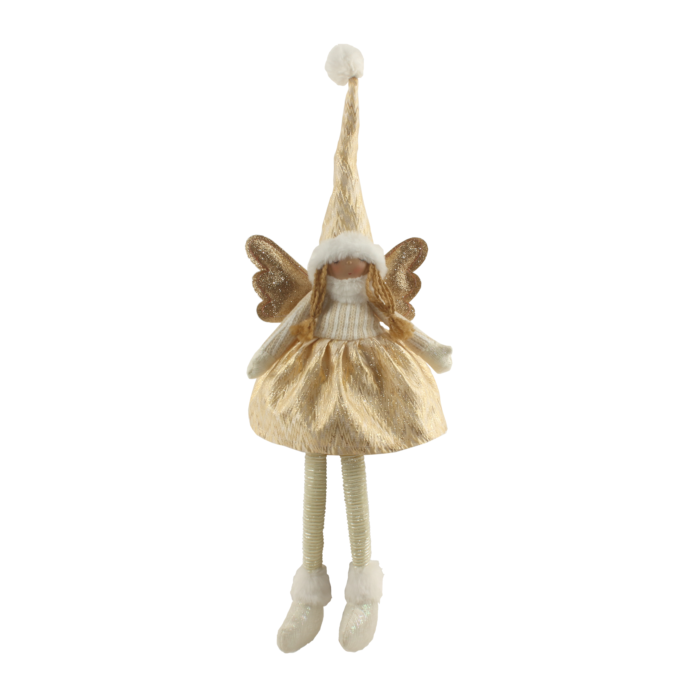 Vneste do svého domova kouzlo Vánoc s tímto roztomilým andílkem. Oblečený v lesklých zlatých šatech a třpytivých křídlech působí elegantně a slavnostně. Bílá čepice s bambulkou, rukavice a boty krásně ladí s celkovým vzhledem. Ideální jako ozdoba k vánočnímu stromečku nebo jako součást sváteční výzdoby.