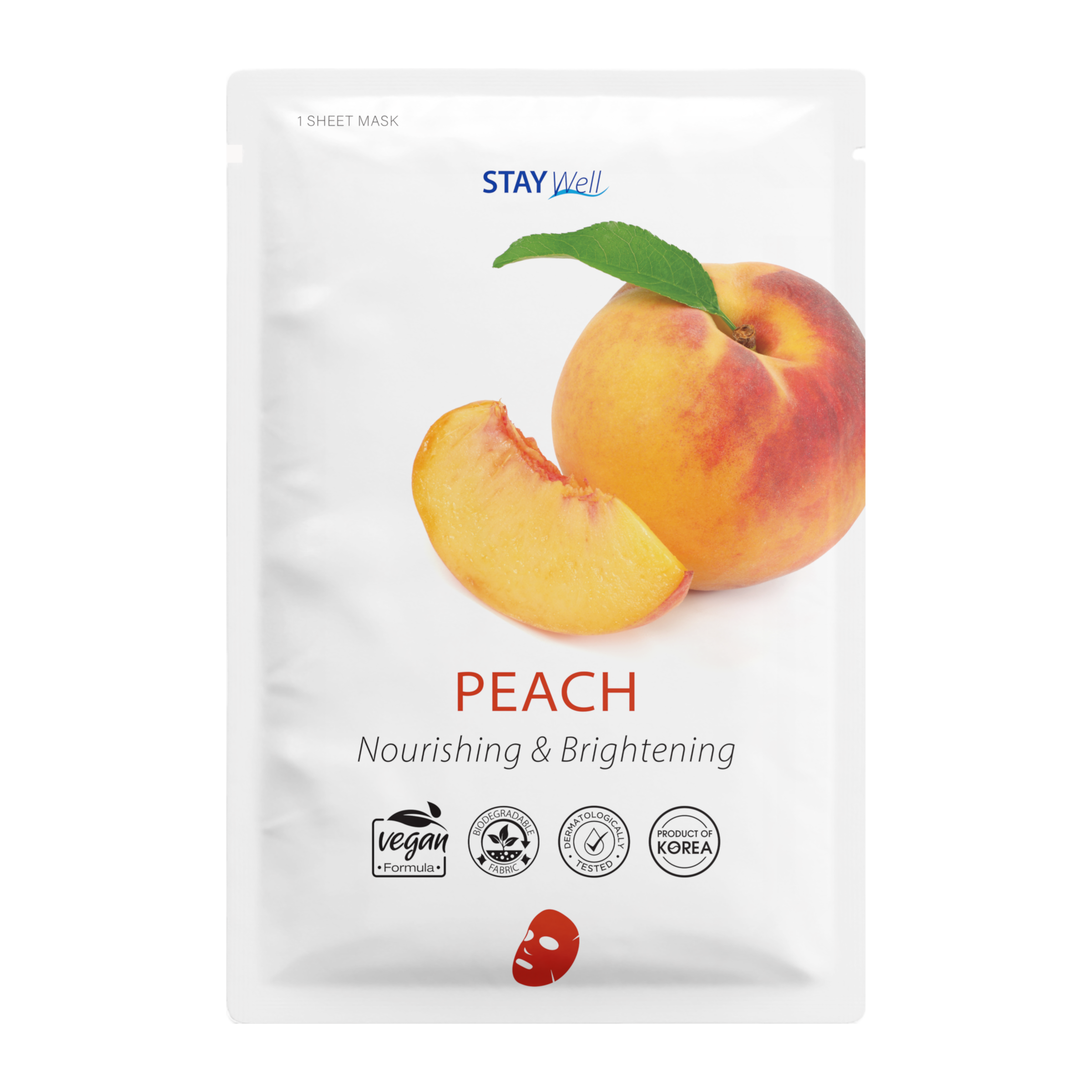 Maska STAY WELL Vegan Peach Sheet Mask vyživuje a rozjasňuje pokožku díky výtažkům z broskví a ovsa. Látka je přírodní a biologicky odbouratelná. Zajišťuje výjimečnou hebkost a jemnou péči o pokožku.