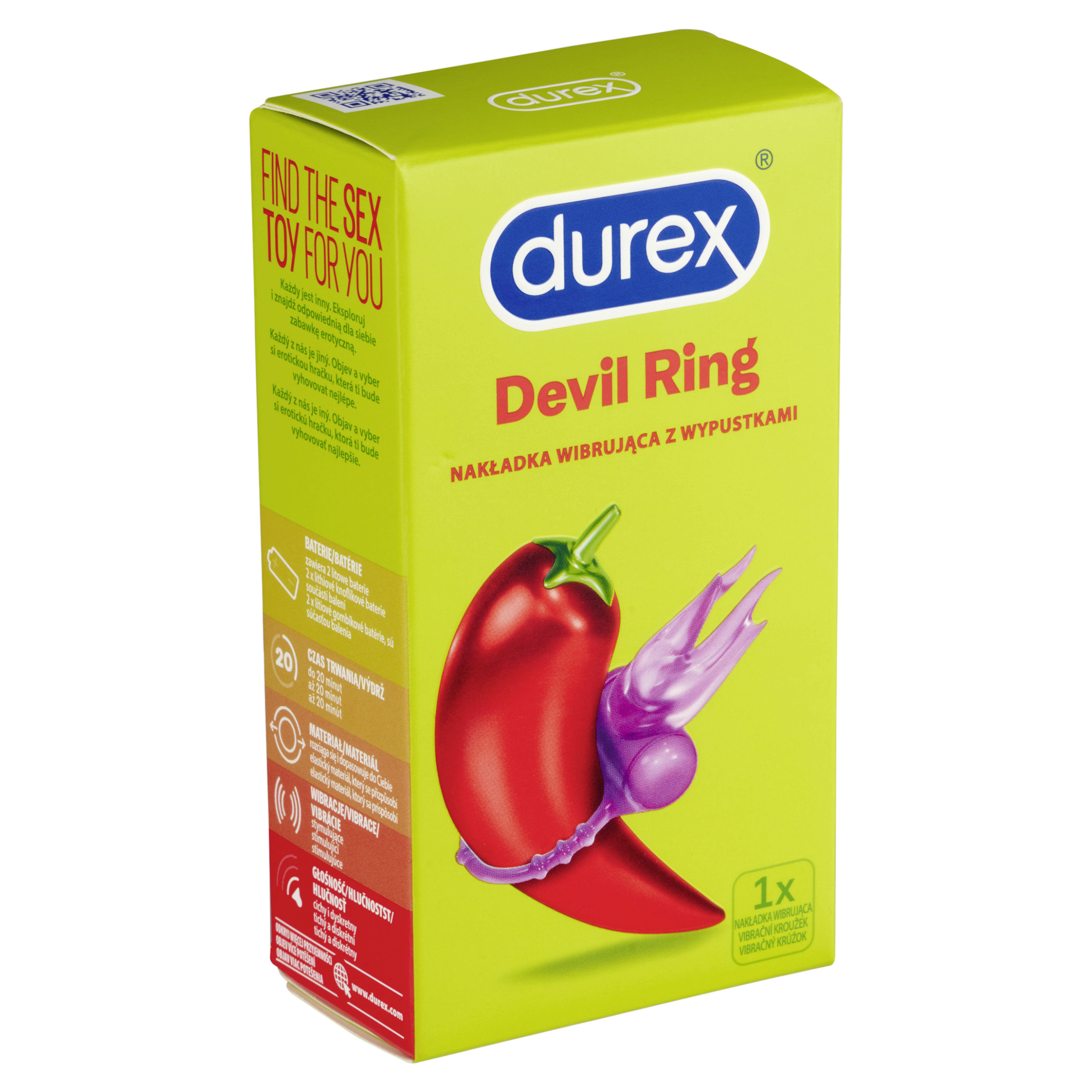 Objevuj potěšení Durex Devil Ring je vibrační kroužek určený na penis s vibrační hlavicí pro stimulaci klitorisu, která je navržena tak, aby ženám poskytla více potěšení během sexu. Vibrační hlavice je sestrojena tak, aby poskytla až 20 minut intenzivních vibrací. Lze použít s kondomy z přírodního kaučukového latexu Durex a lubrikačními gely Durex. Zjistěte více, jděte na durex.com. Každý z nás je jiný. Objev a vyber si erotickou hračku, která ti bude vyhovovat nejlépe. Zjistěte více, jděte na durex.com. Objev více potěšení www.durex.com.
