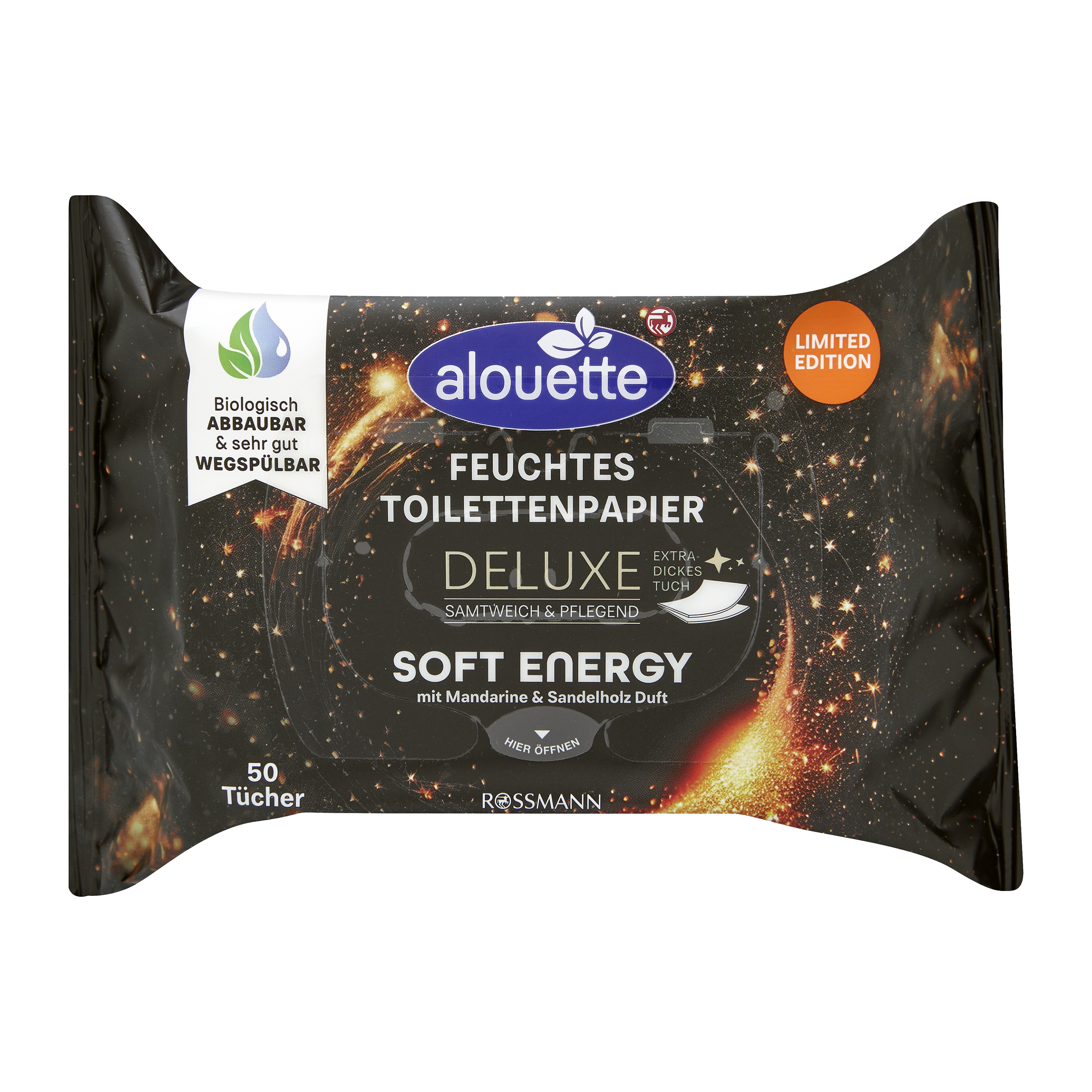 Vlhčené toaletní papíry Alouette Soft Energy s vůní mandarinky a santalového dřeva jsou obzvláště kvalitní. Díky speciálnímu vláknovému složení netkaného materiálu se kapesníky nejen velmi snadno splachují, ale jsou také příjemně měkké a zajišťují šetrné a pečující čištění.