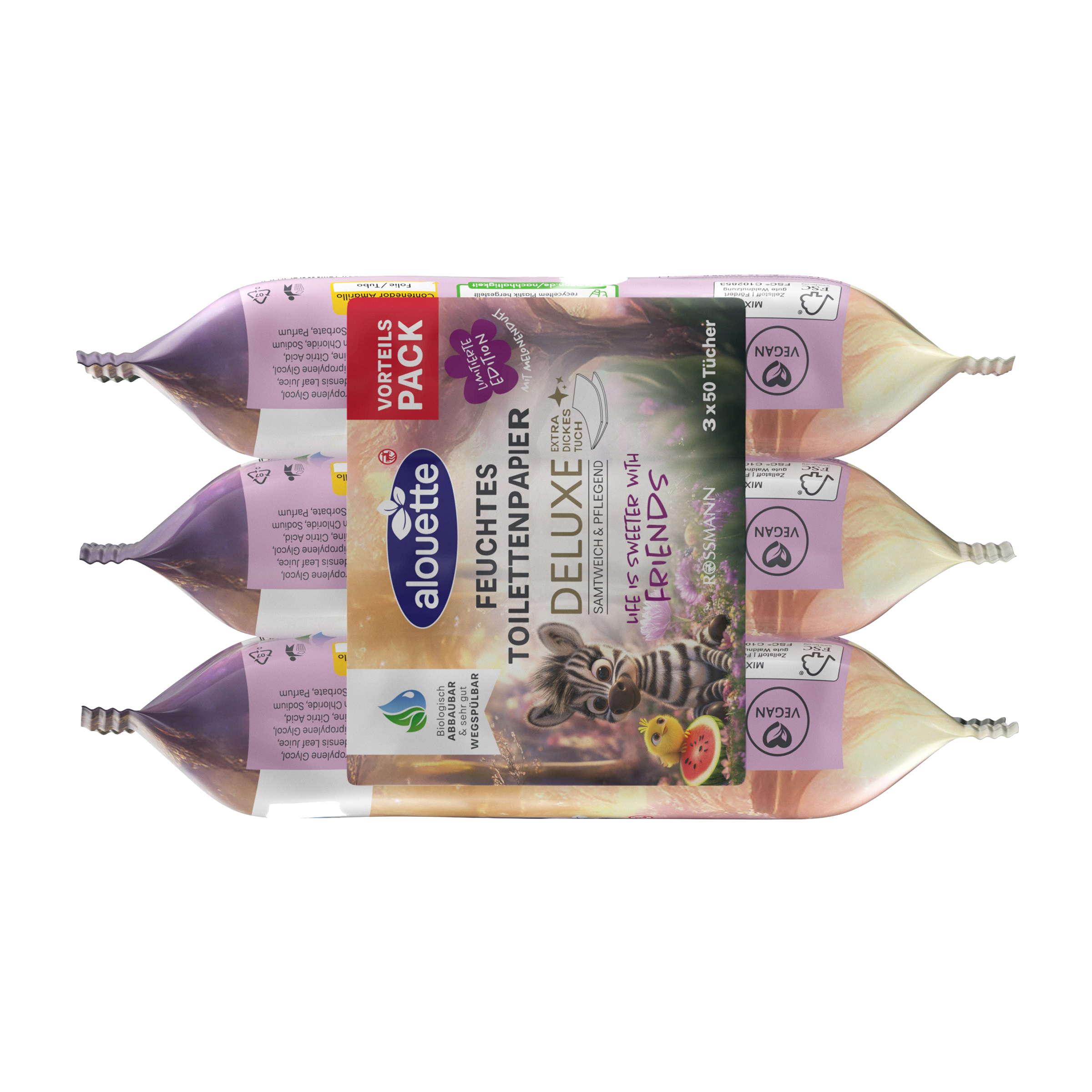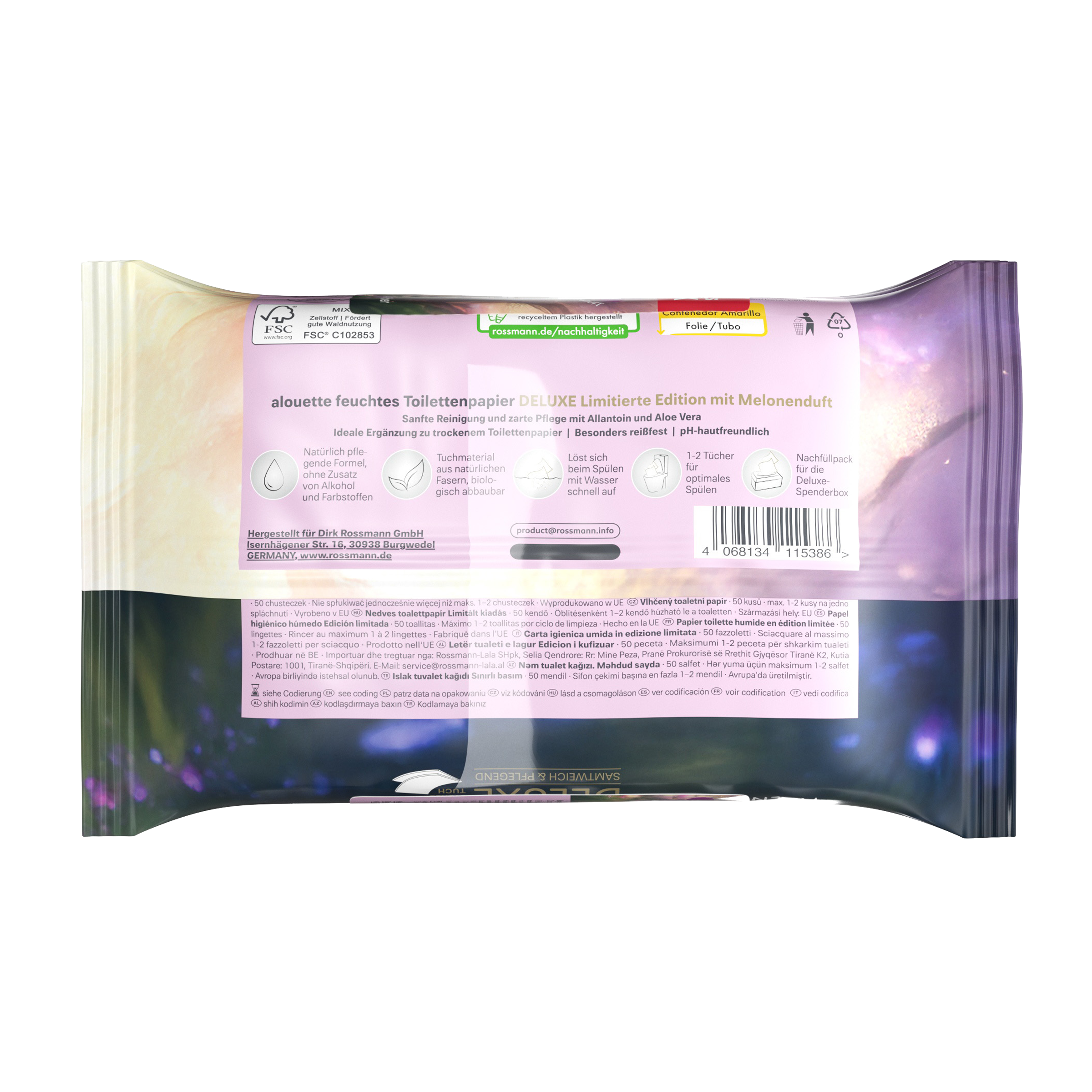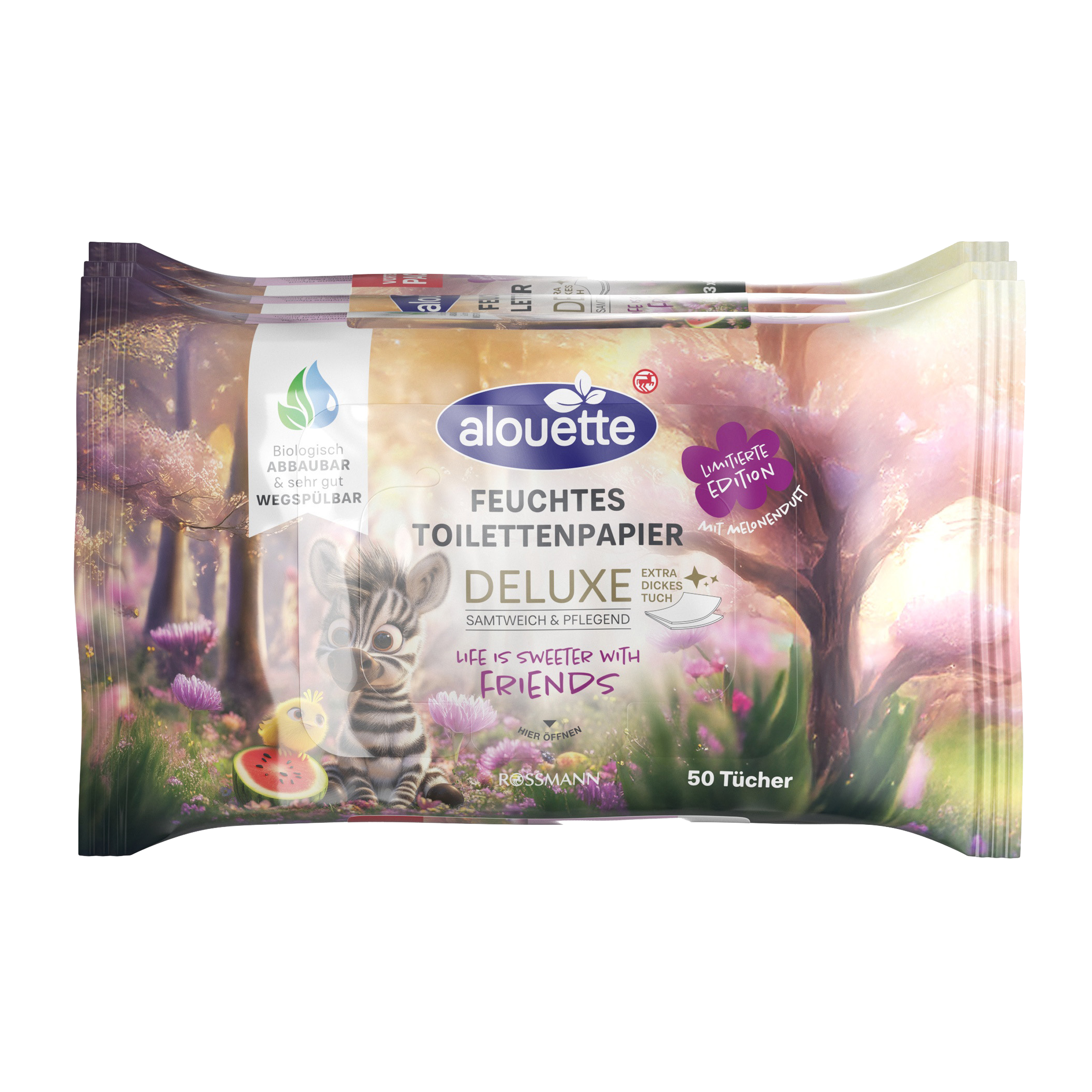 Vlhčený toaletní papír Alouette Deluxe s vůní melounu nabízí obzvláště vysokou kvalitu. Díky speciálnímu složení vláken netkané textilie se ubrousky nejen snadno splachují, ale jsou také příjemně měkké a poskytují jemné a výživné čištění.