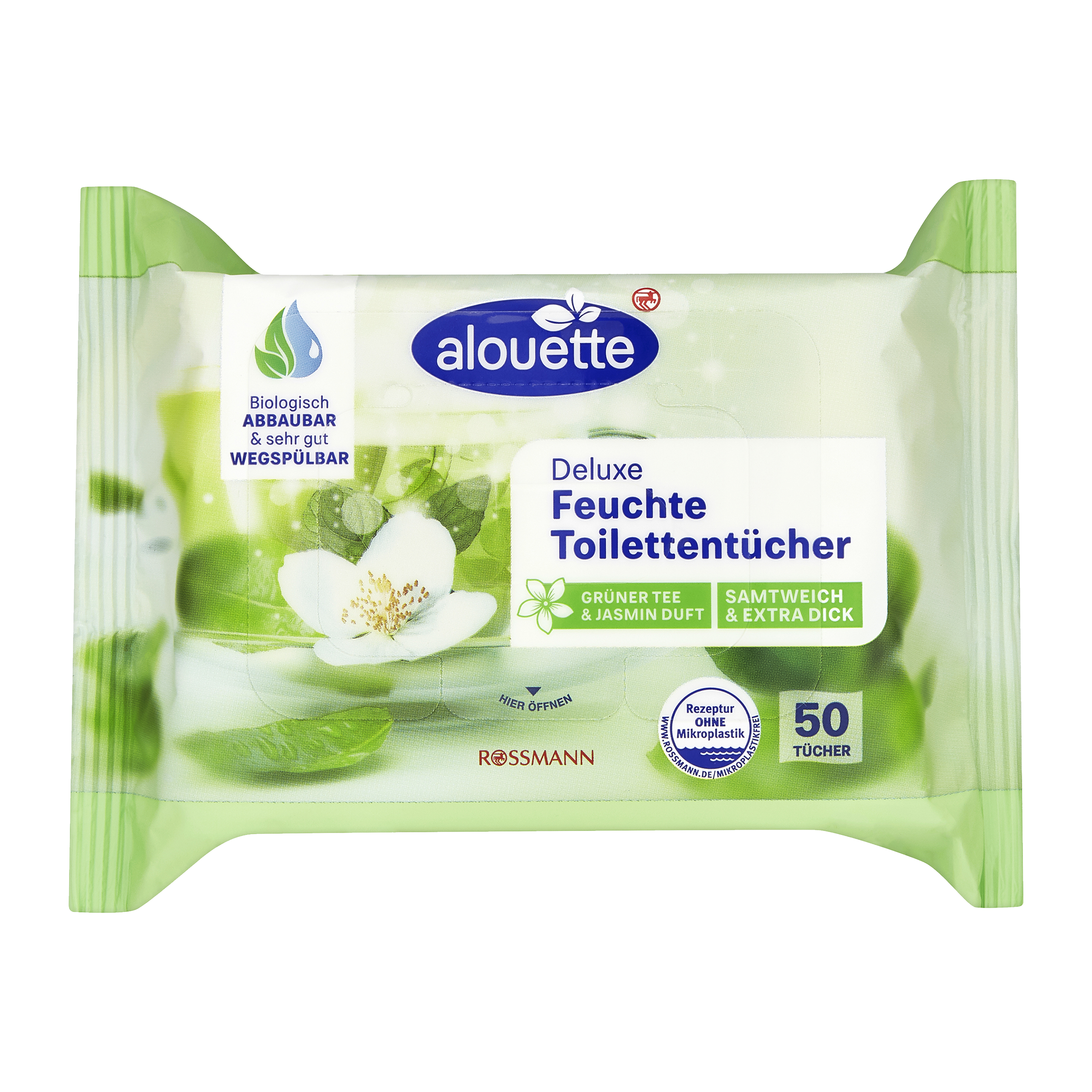 Ideální doplněk suchého toaletního papíru. Vlhčené toaletní ubrousky alouette s vůní zeleného čaje a jasmínu nabízejí vysokou kvalitu. Díky speciálnímu složení vláken fleecového materiálu jsou příjemně měkké. Inovativní pečující receptura s přírodním alantoinem a výtažkem z heřmánku zajišťuje svěží, příjemný pocit čistoty.