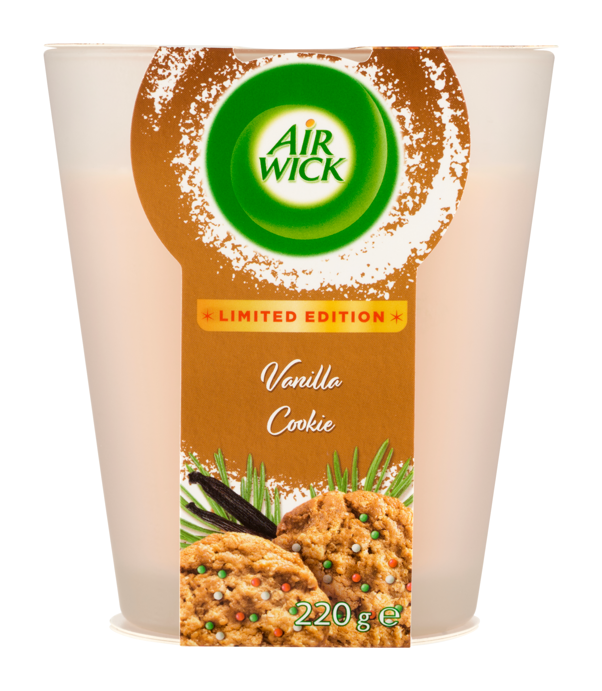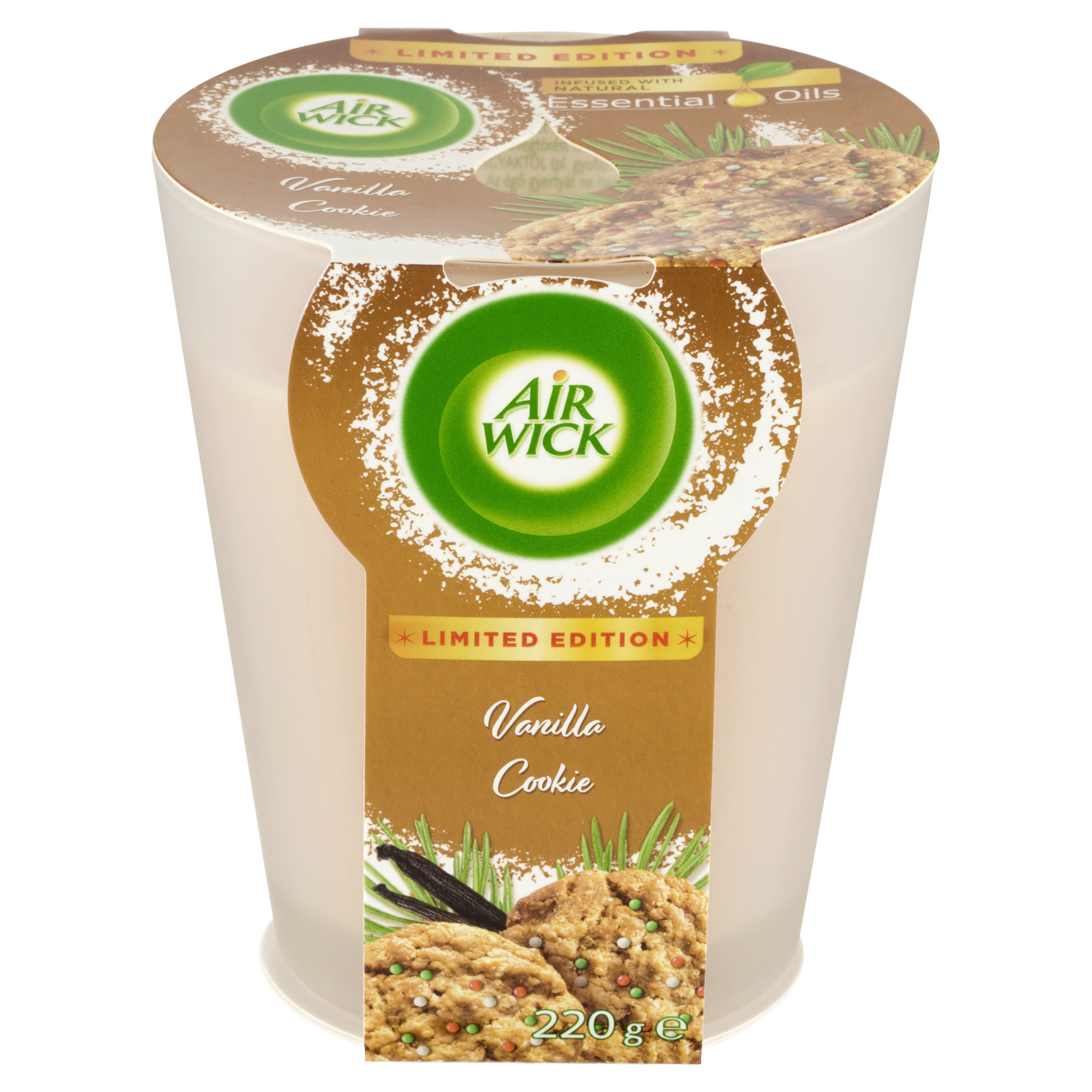 Air Wick svíčka - Vanilkové cukroví. Uchovávejte mimo dosah dětí. Je-li nutná lékařská pomoc, mějte po ruce obal nebo štítek výrobku. Osoby s přecitlivělostí na vůně by měly tento výrobek používat s opatrností. Osvěžovače vzduchu nemohou nahradit správné hygienické návyky. VAROVÁNÍ: PŘED POUŽITÍM SI PROSÍM POZORNĚ PŘEČTĚTE BEZPEČNOSTNÍ TEXT. UDRŽUJTE PRO BUDOUCÍ REFERENCE. UPOZORNĚNÍ: Nedodržení pokynů může mít za následek nebezpečí požáru, zranění osob nebo rozbité sklo. Uchovávejte mimo dosah jiných předmětů (např. zápalek). Nepřidávejte esenciální oleje. Knot udržujte 1 cm dlouhý, abyste se vyhnuli přílišnému hoření. Hořící svíčku nenechávejte bez dozoru, v blízkosti předmětů, které se mohou snadno vznítit, nebo hořet víc než 4 hodiny. Svíčku uhaste, je-li vrstva svíčky nižší než 1 cm, a nikdy nedovolte, aby svíčka dohořela až do úplného dna. Umístěte na rovný, teplu odolný povrch, nevystavujte průvanu. Nepalte svíčky na nebo v blízkosti čehokoliv, co by se mohlo vznítit. Uchovávejte svíčky ve vzpřímené poloze. Nepoužívejte na teplých površích (např. na TV). Nenaklánějte svíčku, pokud hoří nebo je vosk tekutý. Nedovolte, aby se plamen dotýkal strany nádobky. Skleněná nádobka bude během používání a po jeho skončení horká. Nepoužívejte, když je skleněná nádobka poškozená. Vždy nechte mezi zapálenými svíčkami mezeru alespoň 20 cm. Svíčku uhaste jemným sfouknutím.