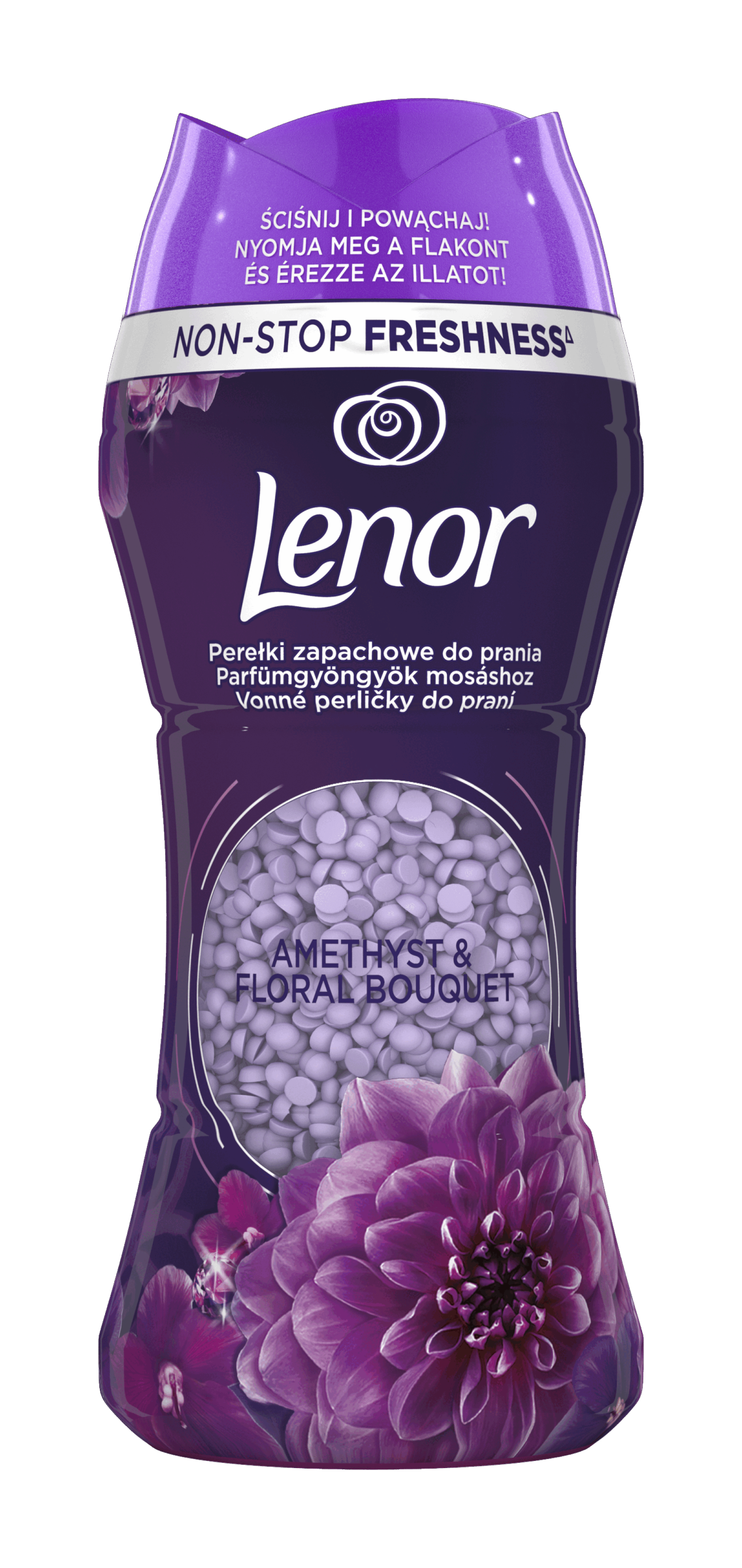 Objevte vonné perličky do praní Lenor, nejnovější přípravek Lenor pro příjemně voňavý zážitek. Lenor dá vašemu prádlu intenzivní svěží vůni až do dalšího vyprání (až 12 týdnů, při uskladnění prádla) a vaše oblečení nádherně provoní Amethyst And Floral. Tuto vůni tvoří mysteriózní koktejl jiskrného bergamotu a vzdušný buket jemné frézie a zářivého jasmínu. Jemné nuance spodního tónu vás zabalí do sametového tepla, které vám dodá pocit jistoty a pohodlí na celý den. Fascinující a jedinečná vůně jako opravdový ametyst. Vonné perličky do praní Lenor Amethyst And Floral byly vytvořeny tak, aby fungovaly v dokonalé harmonii s aviváží Lenor Amethyst And Floral. Jsou okouzlující samostatně… a neodolatelné společně. S Lenorem se cítím skvěle.