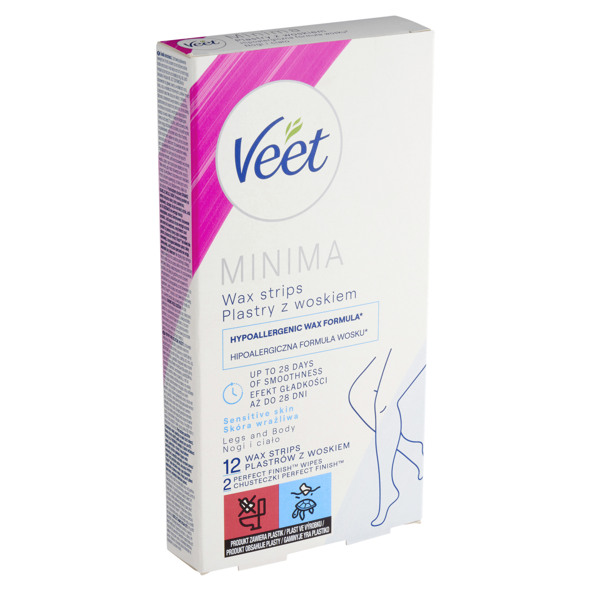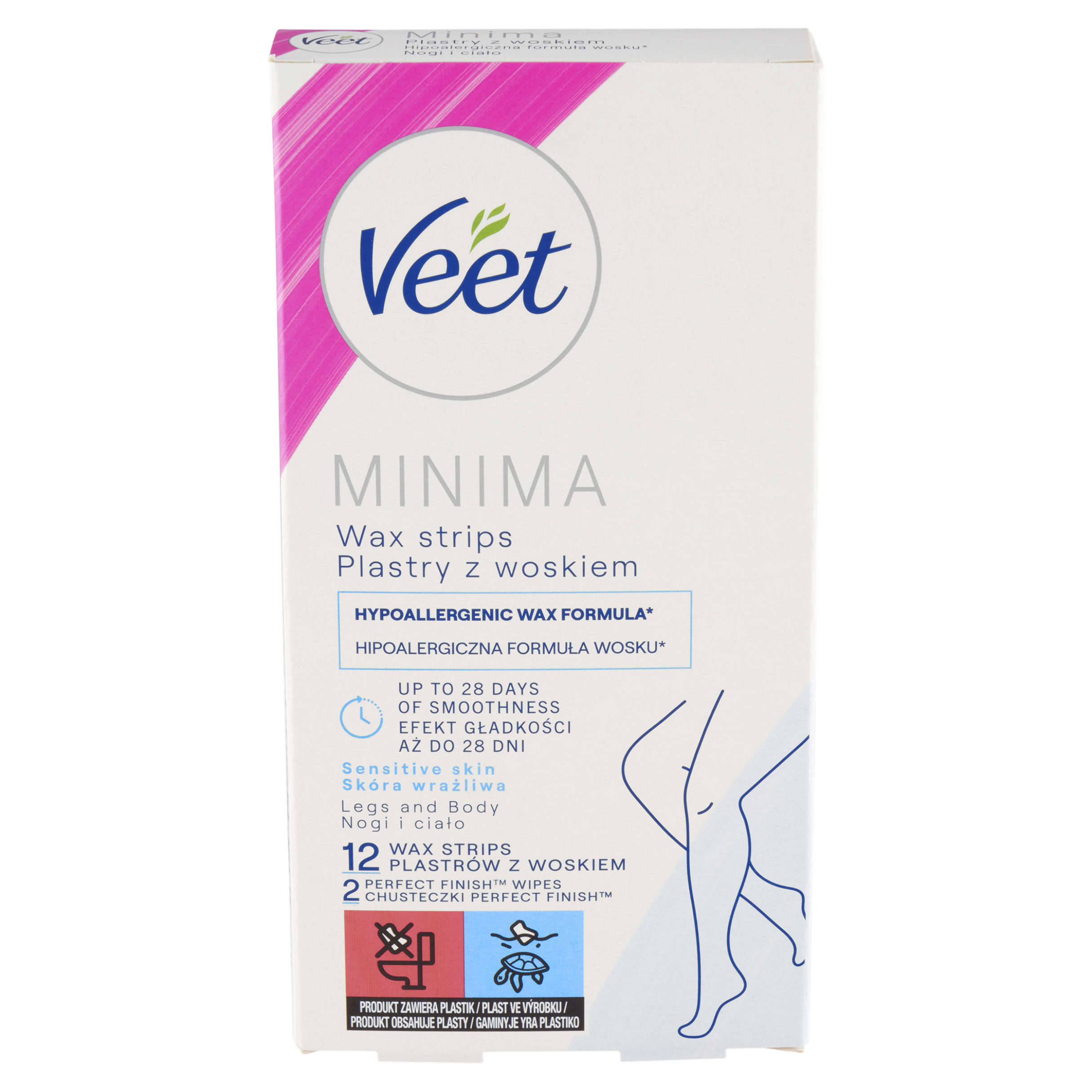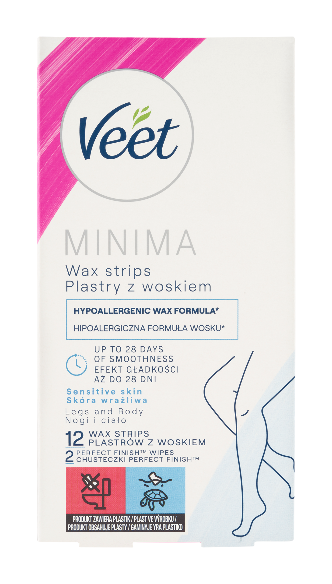Veet Minima voskové pásky na nohy a tělo s hypoalergenním složením* pro citlivou pokožku. Obsahuje minimální množství ingrediencí. Odstraní chloupky od kořínků pro hladkou pokožku až na 28 dní. *Složení minimalizuje riziko alergických reakcí.