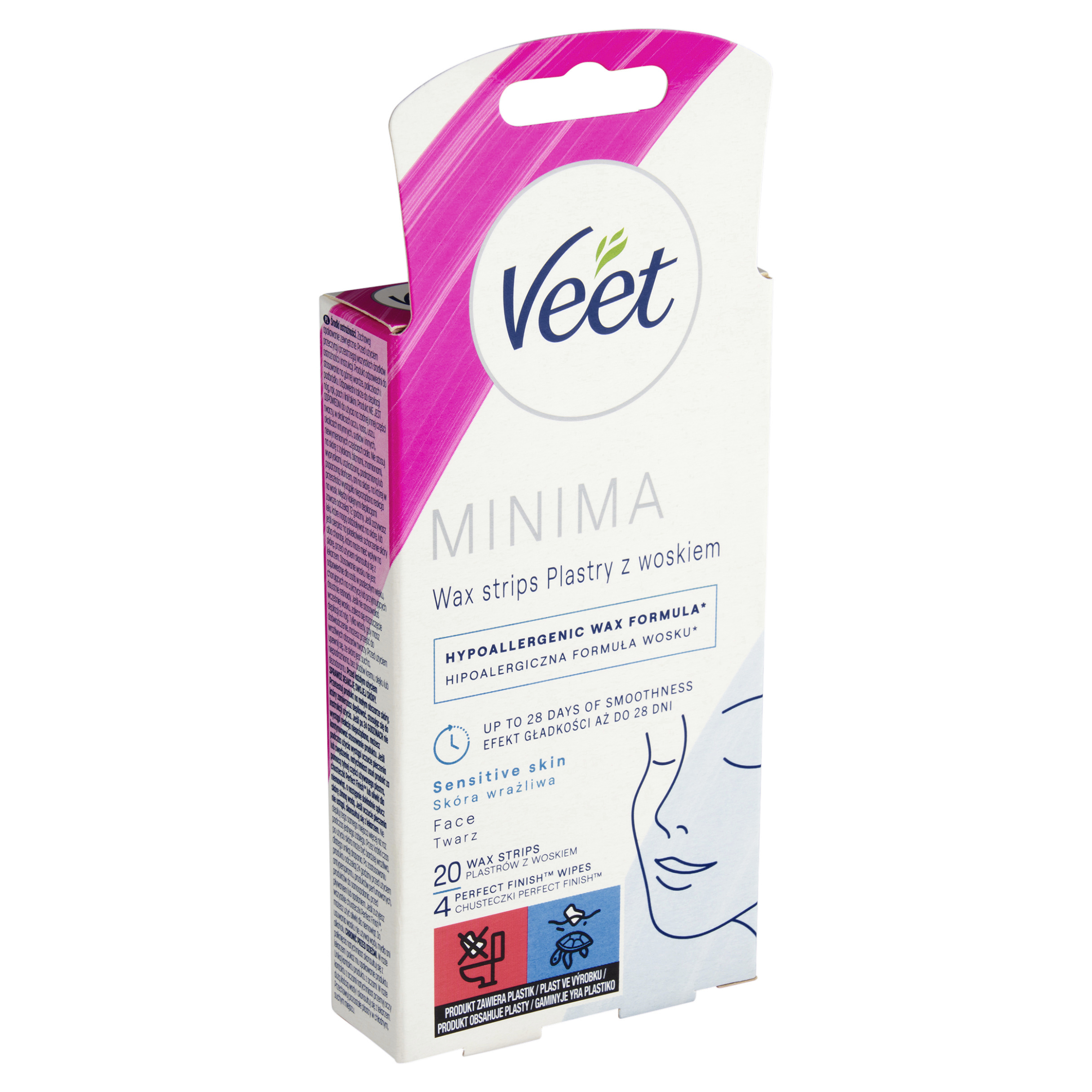 Veet Minima voskové pásky na obličej s hypoalergenním složením* pro citlivou pokožku Složení s minimálním množstvím ingrediencí odstraní chloupky od kořínků pro hladkou pokožku až na 28 dní. *Složení minimalizuje riziko alergických reakcí Veet Minima voskové pásky na obličej s hypoalergenním složením* pro citlivou pokožku Složení s minimálním množstvím ingrediencí odstraní chloupky od kořínků pro hladkou pokožku až na 28 dní. *Složení minimalizuje riziko alergických reakcí