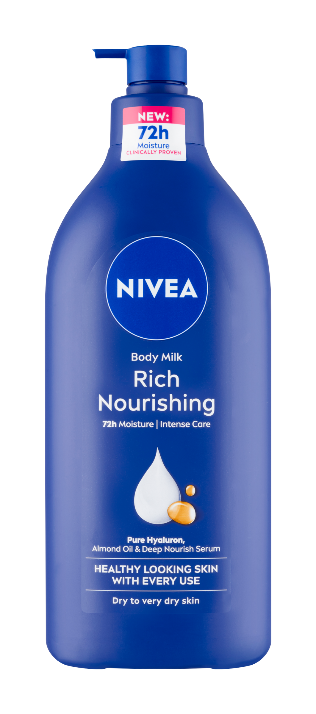 Nivea® Výživné tělové mléko Rich Nourishing hloubkově hydratuje i velmi suchou pokožku po 72 hodin. Rychle se vstřebávající a nemastné složení je obohacené o čistou kyselinu hyaluronovou, mandlový olej a hloubkově vyživující sérum.