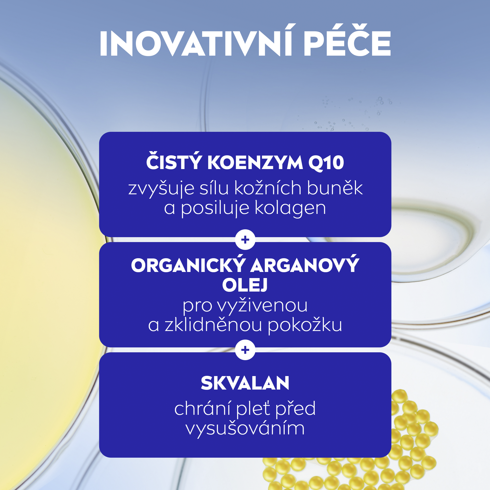 NIVEA Výživný denní krém proti vráskám Q10 má bohatou krémovou texturu, která se snadno nanáší a zanechává pleť okamžitě hladkou a hebkou. Čistý koenzym Q10: Vstřebává se do každé kožní buňky. Posiluje energii buněk. Podporuje správné fungování pleti a redukuje vrásky zevnitř.* Bio arganový olej: Bohatý na omega-6 a omega-9, známý pro doplnění vlhkosti. Pro vyživenou a zklidněnou pleť. Skvalan: Aktivní složka pro péči o pleť. Známý ochránce vlhkosti pleti proti vysychání s příjemným pocitem hebké pokožky.