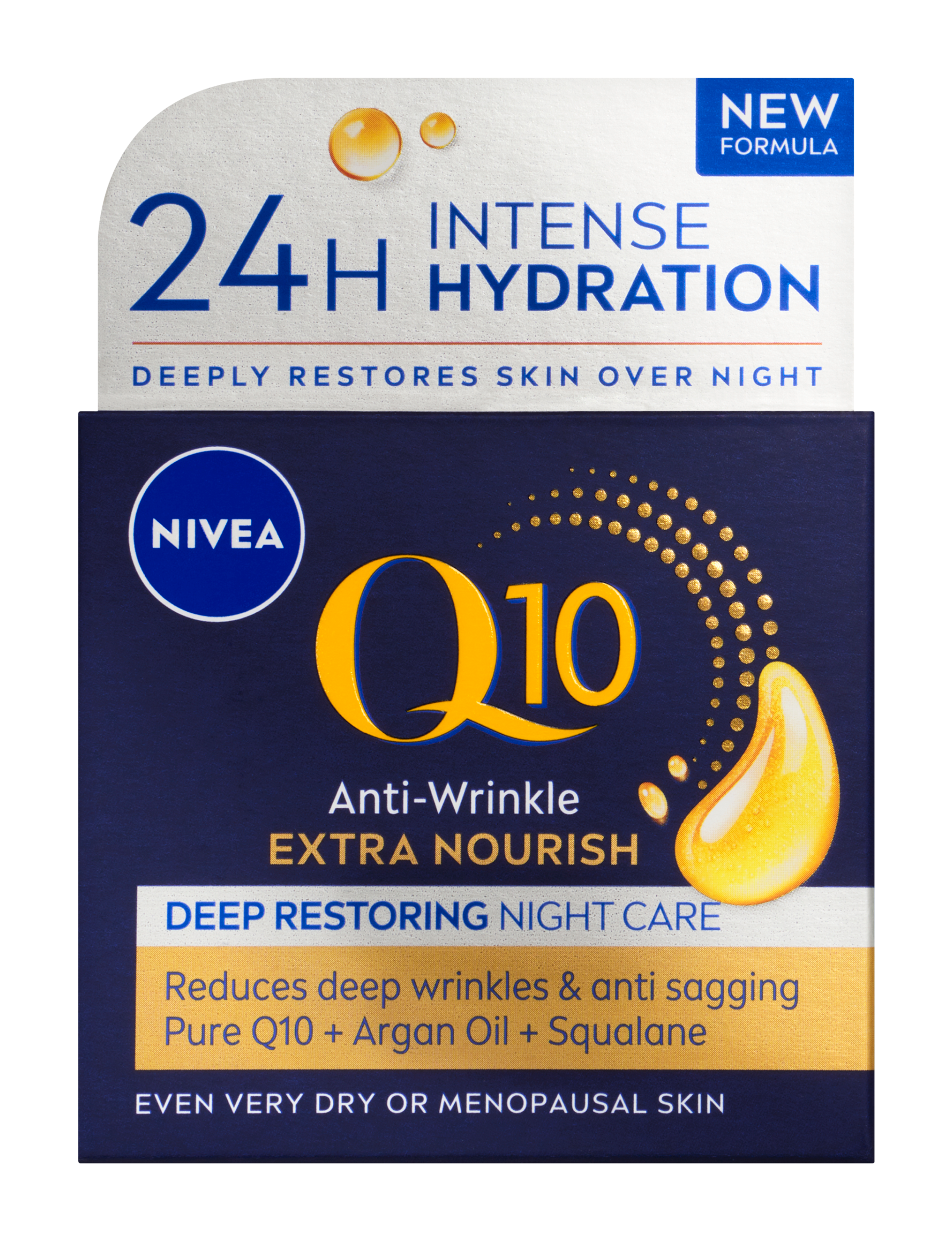 Nivea® Výživný noční krém proti vráskám Q10 Extra Nourish je speciálně navržen tak, aby dobře fungoval během noci, kdy je pleť vnímavější. Složení s čistým koenzymem Q10, organickým arganovým olejem a skvalanem intenzivně pleť vyživuje, aby byla okamžitě hladší a jemnější.