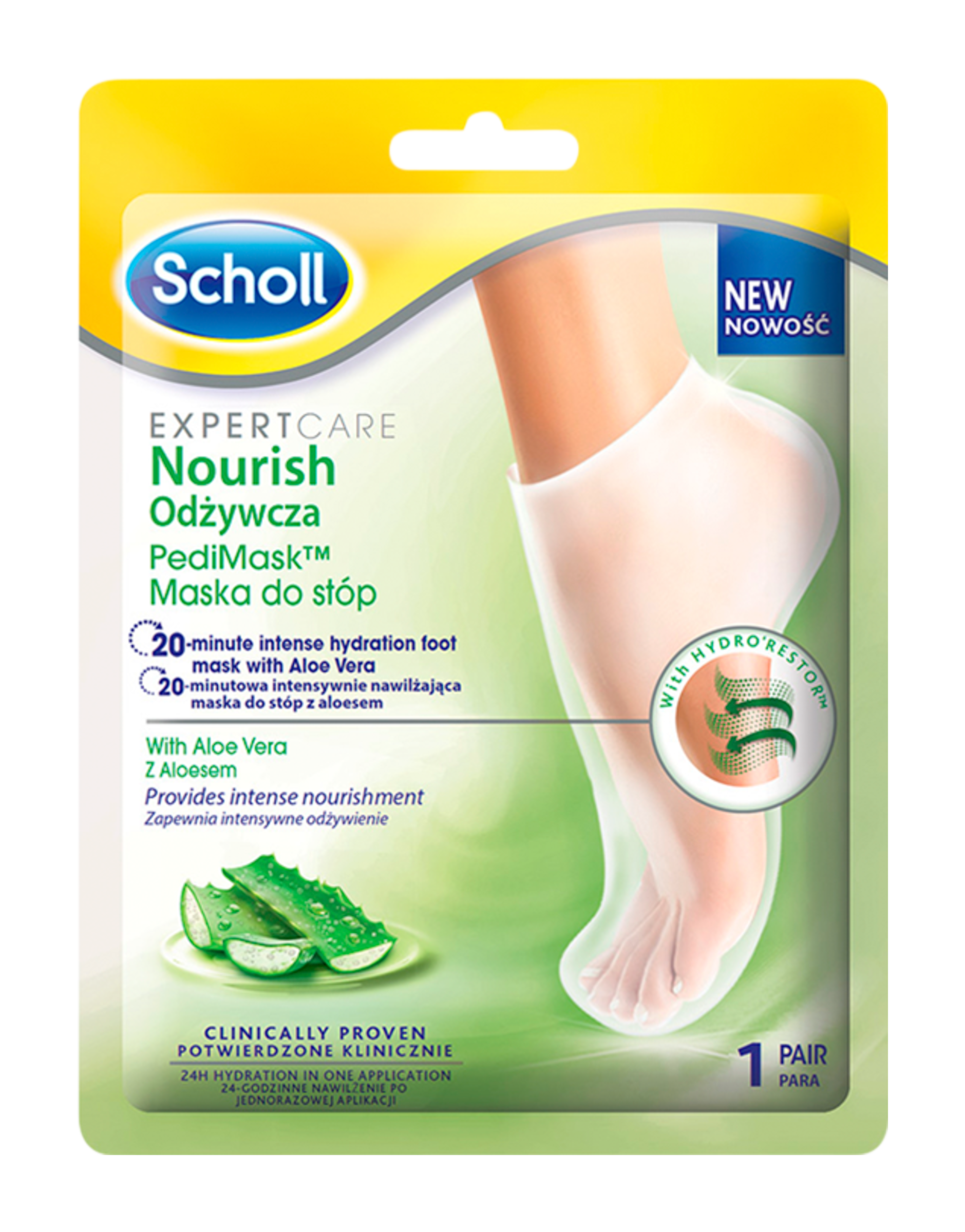 1 pár hydratační masky na nohy. Odborníci z Scholl vyvinuli tuto masku pro zvlhčení suché pokožky na nohou: Měkké a pružné nohy za pouhých 20 minut. Pomáhá opravovat, vyživovat a zlepšovat texturu pokožky. Klinicky ověřeno: 24hodinová hydratační péče s jedinou aplikací. Snadno se nanáší, nemastí. Ideální pro jednorázové použití nebo po odstranění ztvrdlé nebo suché kůže pomocí elektrického odstraňovače mozolů Scholl.