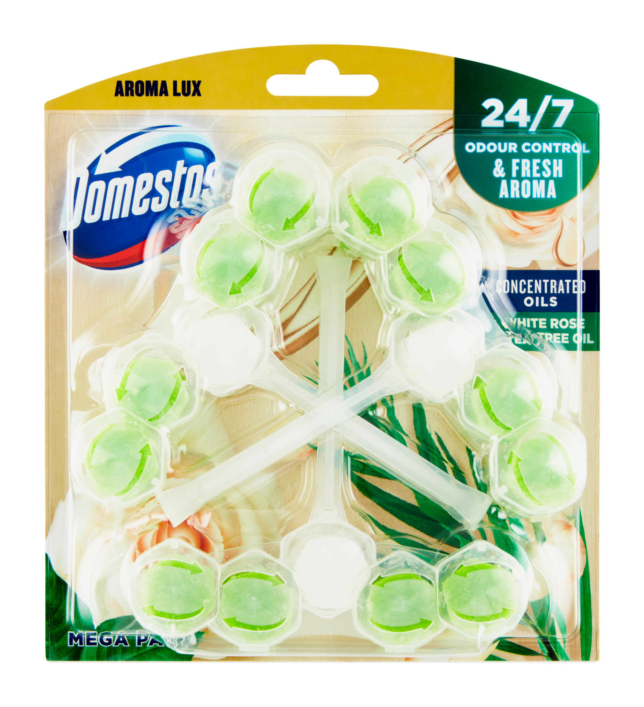 Prevence před vodním kamenem. Dezinfikuje a odstraňuje bakterie. Dlouhotrvající svěžest s vůní bíle růže a čajovníků, 100% lesk a hygienická čistota. Síla v každém spláchnutí! Udržování svěžesti a čistoty vašeho WC nebylo nikdy tak snadné jako s revolučním závěsným WC blokem Domestos Aroma Lux White rose & Tea Tree Oil. Tento účinný závěsný wc blok má hned několik klíčových výhod pro úžasnou čistotu a mimořádnou svěžest. S každým jednotlivým spláchnutím uvolňuje blok Aroma Lux pod okraj toaletní mísy aktivní čistící pěnu, která odstraňuje nečistoty i bakterie, desinfikuje, brání tvorbě vodního kamene, leští vaši toaletu a zároveň uvolňuje svěží a dlouhotrvající vůni bíle růže a čajovníků. Domestos Aroma Lux White rose & Tea Tree Oil tak zanechá vaše WC čisté, zářící a se svěží vůní.