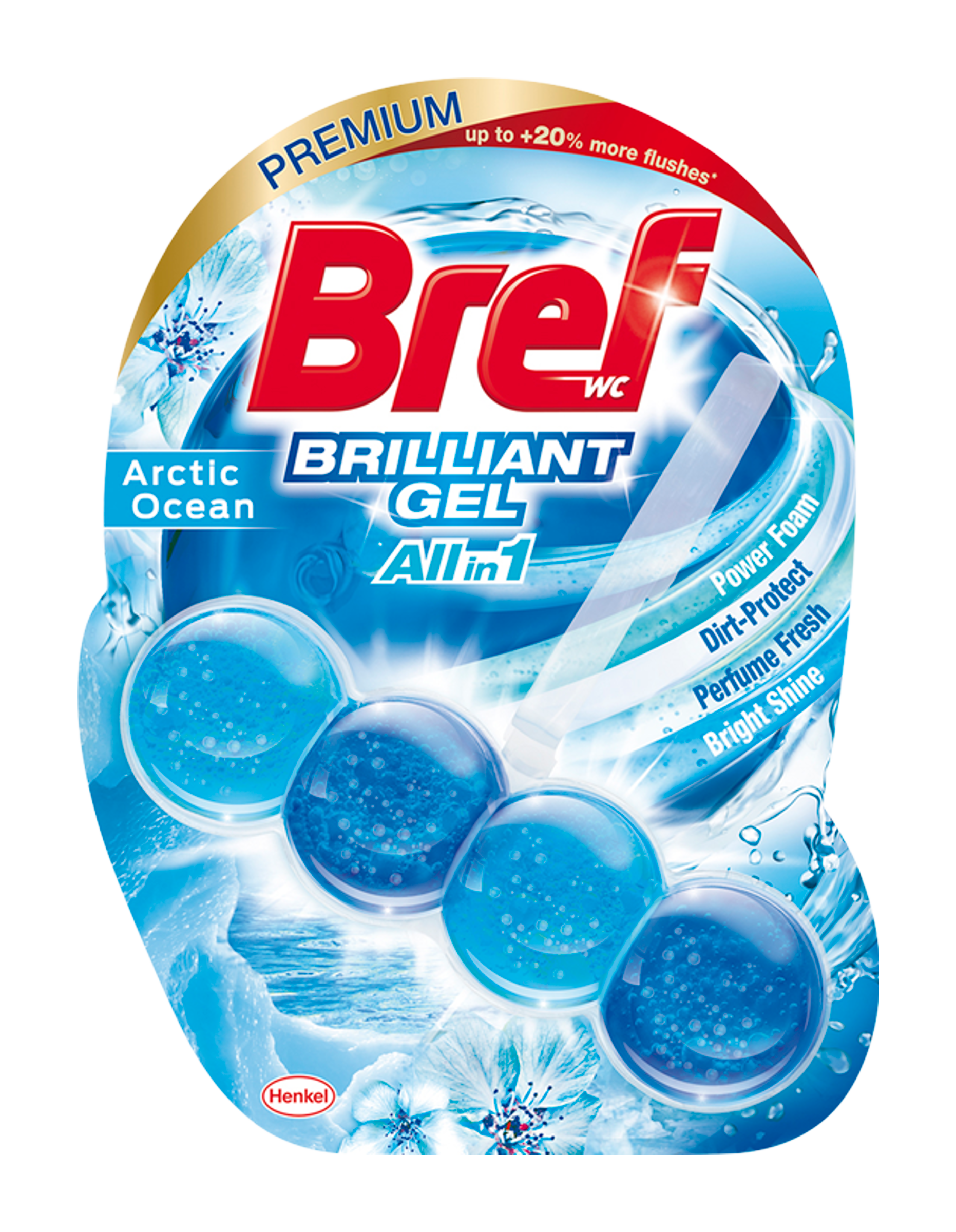 Bref Brilliant Gel Artic Ocean: Účinný All in 1 WC čisticí gel pro svěžest a zářivý lesk Bref Brilliant Gel Artic Ocean je první gelový Bref WC blok. Díky svému All in 1 složení se čtyřmi funkcemi udržuje tento automatický WC čistič vaši toaletu čistou s každým spláchnutím, zabraňuje usazování nových nečistot, nabízí speciální svěžest a zanechává dokonalý lesk. Při spláchnutí toalety se Bref Brilliant Gel promění na rychlý pěnový WC čistič, který osvěží vaši toaletu a zanechá příjemnou vůni pro další osobu. Bref Brilliant Gel je brilantním řešením pro vaši toaletu.