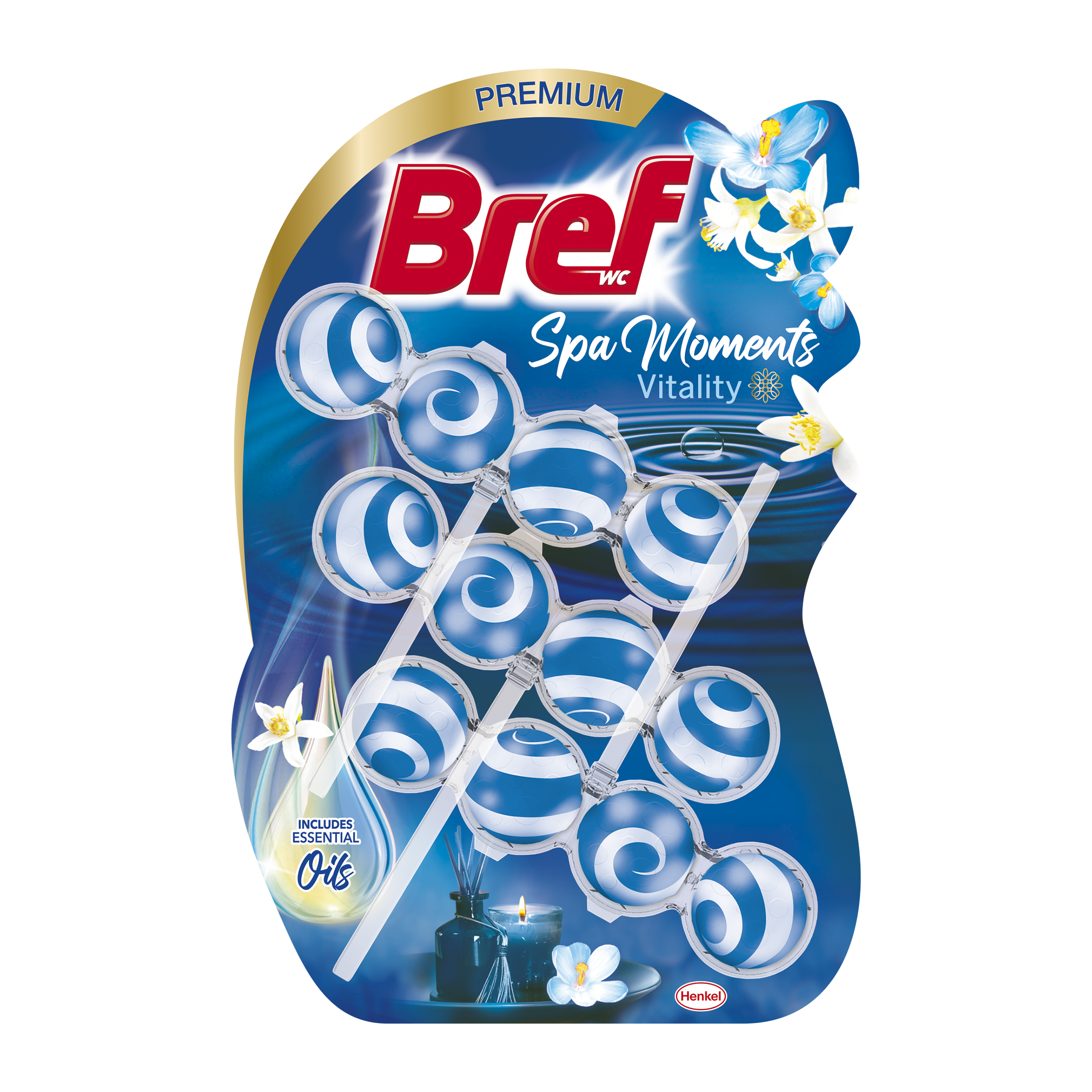 Bref Spa Moments Vitality tuhý WC blok - Zažijte relaxační a dlouhotrvající vůni při každém spláchnutí! Odpojte se od vnějšího světa a užijte si čas pouze pro sebe. WC blok Bref Spa Moments poskytuje relaxační dlouhotrvající vůni a proměňuje vaši toaletu v oázu klidu. Příjemná vůně se uvolňuje s každým spláchnutím a navozuje útulnou a pohodovou atmosféru. Závěsný WC blok má jedinečné složení s luxusními esenciálními oleji, které byly pečlivě vybrány pro zklidnění vašich smyslů.