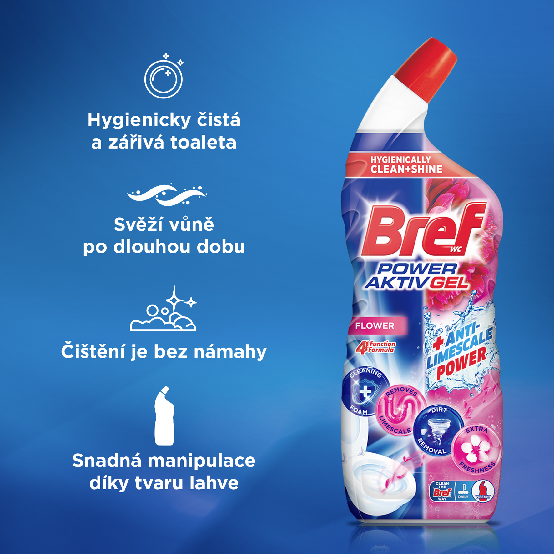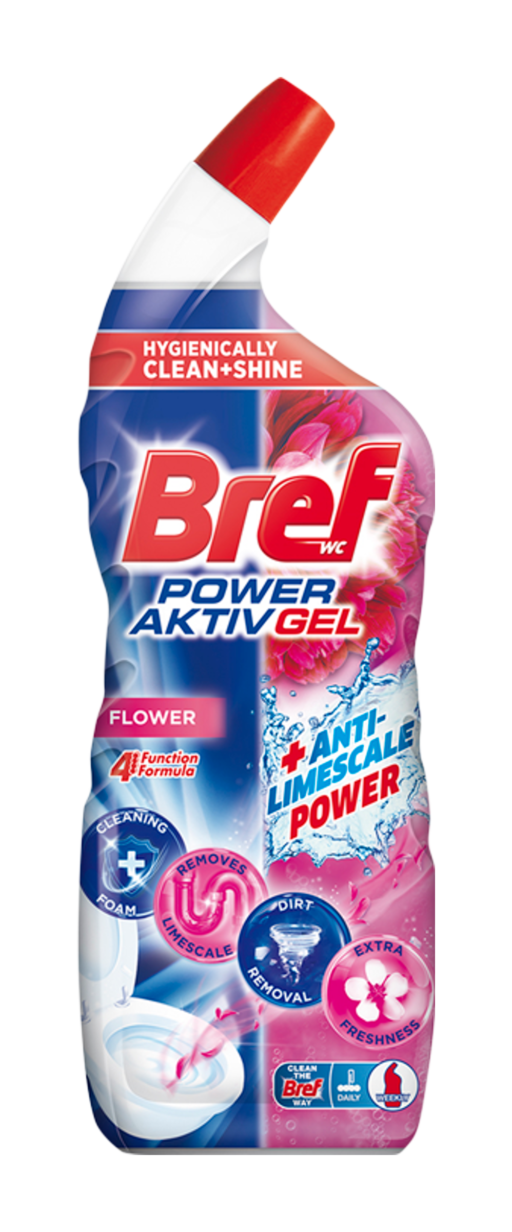 WC čistič Bref Power Aktiv Gel se svěží květinovou vůní Bref Power Aktiv Gel je perfektní pro vynikající, zářivé a svěží výsledky čištění. Čistič toalety odstraňuje vodní kámen, nečistoty a skvrny z okraje toalety a toaletní mísy a zaplní koupelnu svěží vůní na dlouhou dobu. Díky své účinné čisticí pěně nabízí Bref Power Aktiv Gel snadné a hygienické čištění beze stop vodního kamene a nečistot, a navíc vaši toaletu provoní svěží vůní květin.