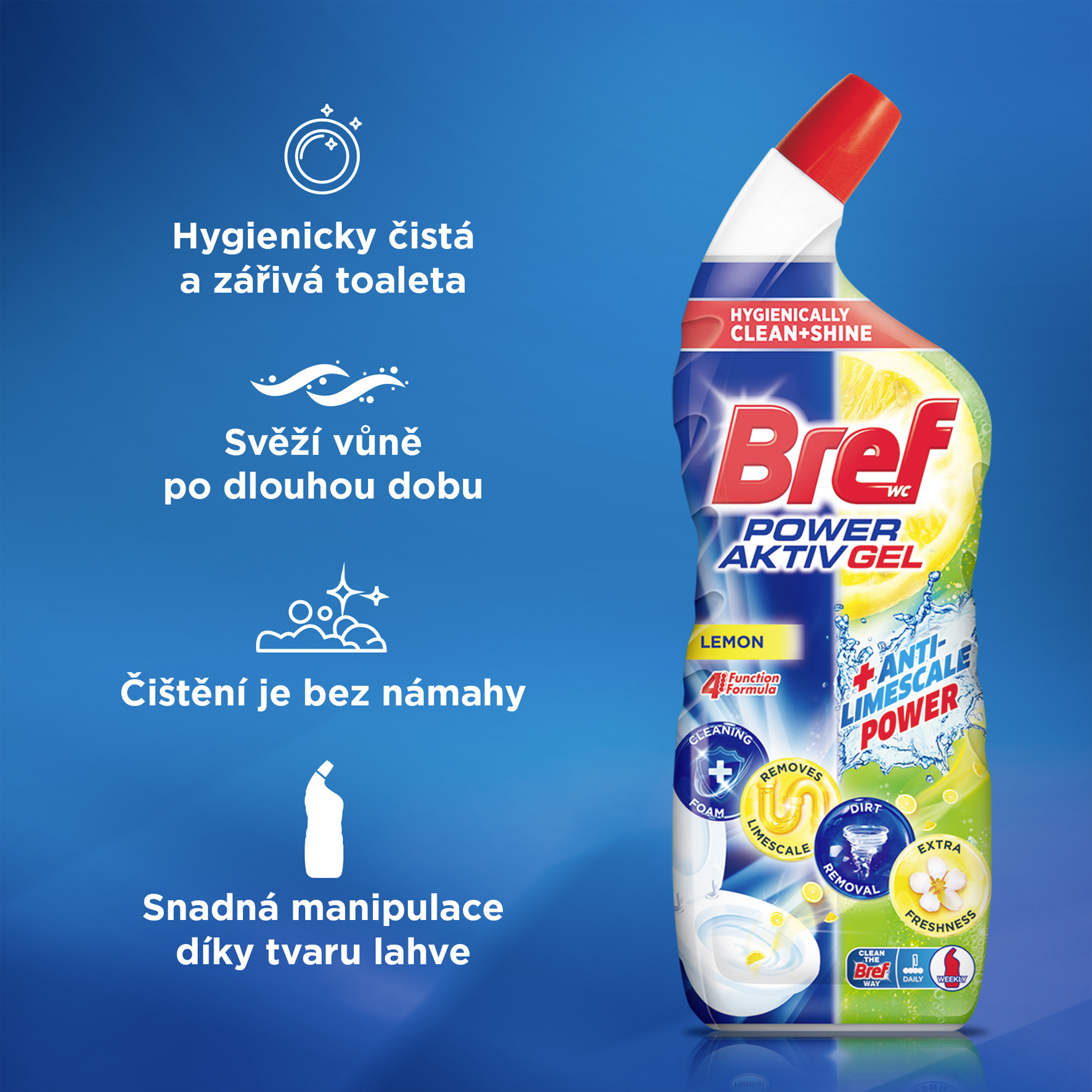- LESK A SVĚŽEST: Bref Power Aktiv Gel je účinný čisticí gel na povrch toalety, který poskytuje čistou a lesklou toaletu a zanechává příjemnou dlouhotrvající vůni citrónu ve vaší koupelně