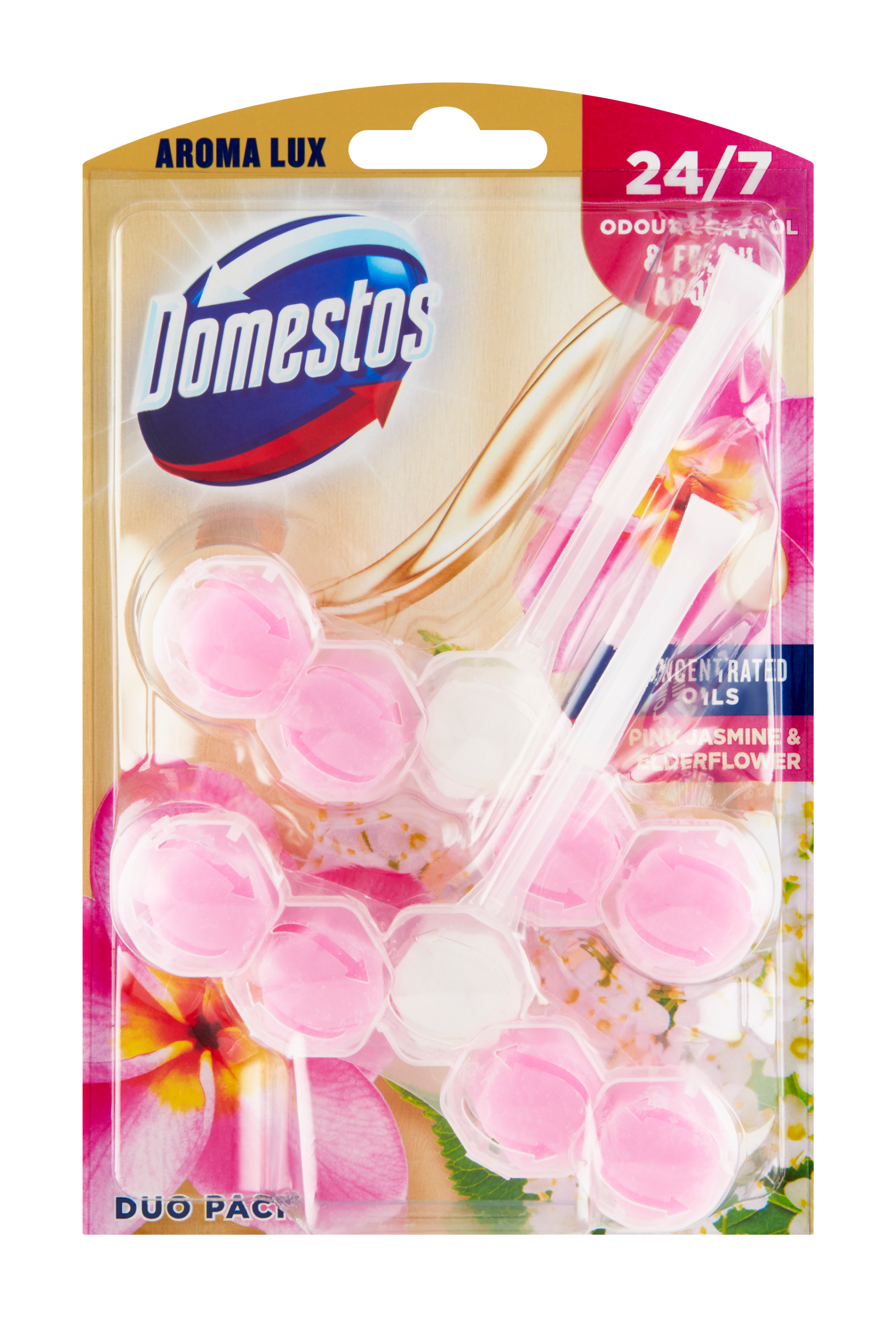 Nové aroma WC bloků Domestos otevírají příjemné tóny šťavnaté hrušky a oroseného melounu. Bílé dřeviny, vůně čistoty a nádech vanilky dotváření svěží a jemnou vůni. To vše zabaleno v květinové vůni růžového jasmínu, bezového květu a bílých květin. S technologií, která odstraňuje zápach 24/7.