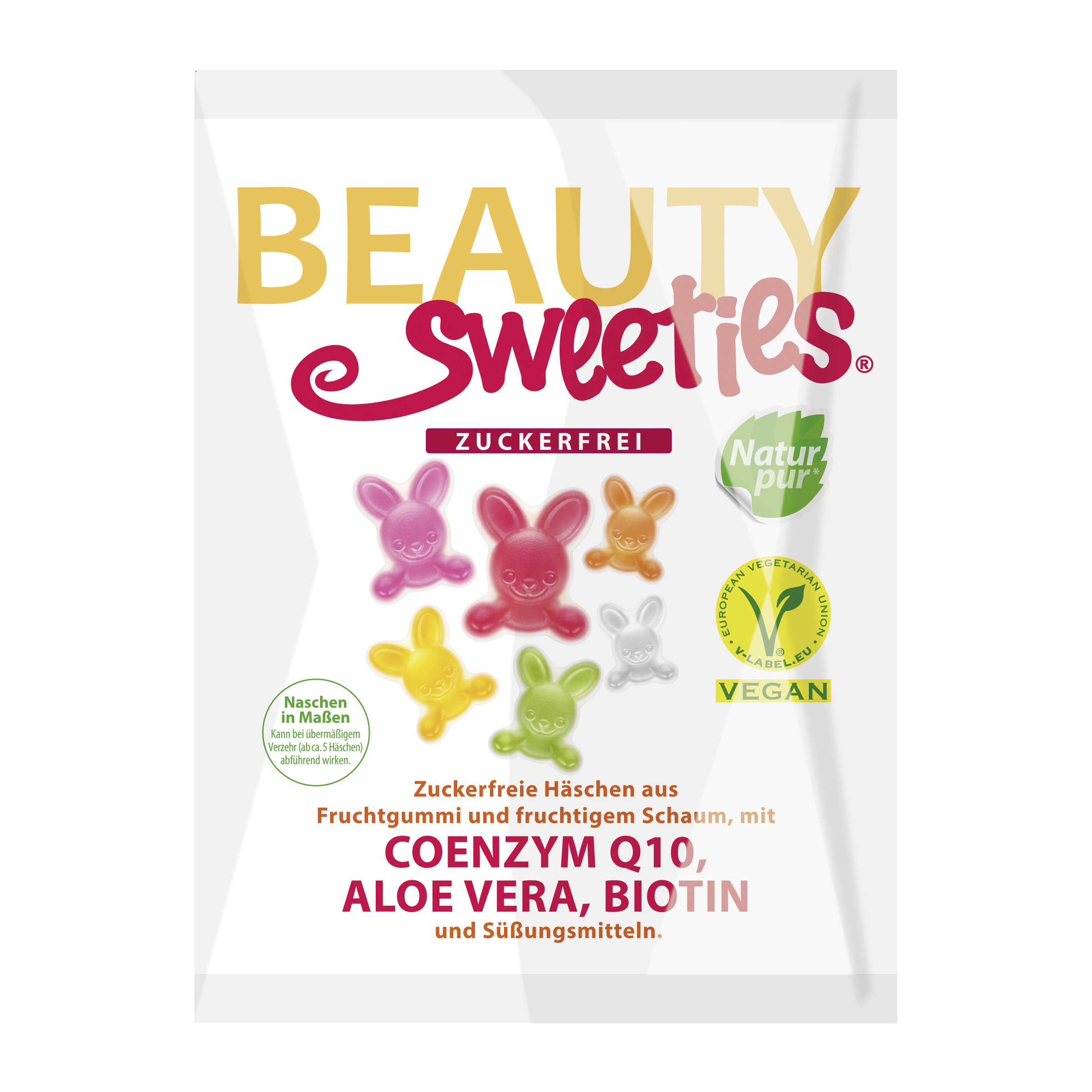 Veganské bonbóny plné chuti a zdraví "Beauty Sweeties" Zajíčci jsou zcela bez cukru! Neobsahují želatinu, konzervanty, umělé příchutě a umělá barviva. Zároveň obsahují zdraví prospěšné látky jako je kolagen, koenzym Q-10, aloe vera, vitamín C a biotin, známý jako vitamín H, který je velmi důležitý pro zdravý vzhled vlasů a pokožky.