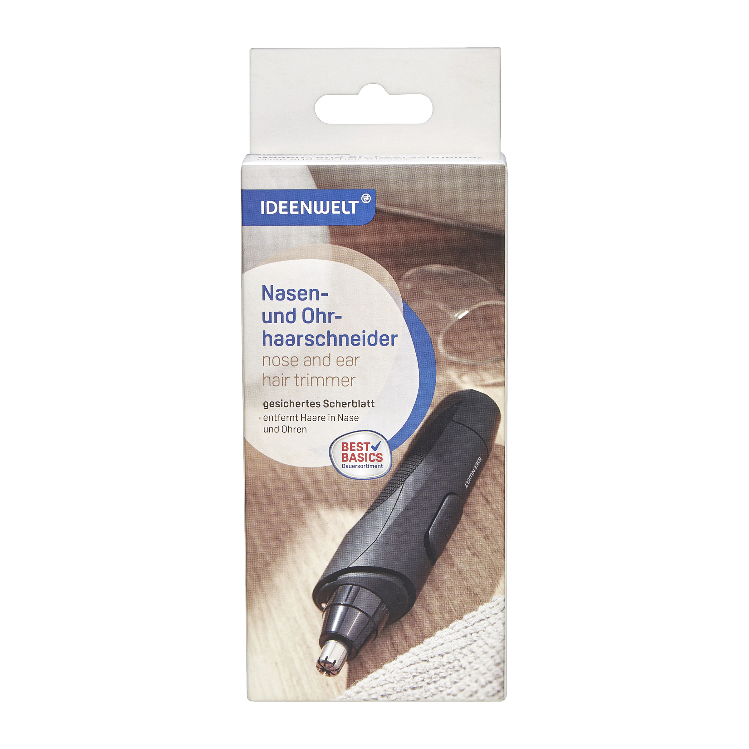 Zastřihávač nosních a ušních chloupků s integrovaným čisticím kartáčem. Řezná hrana je chráněna.