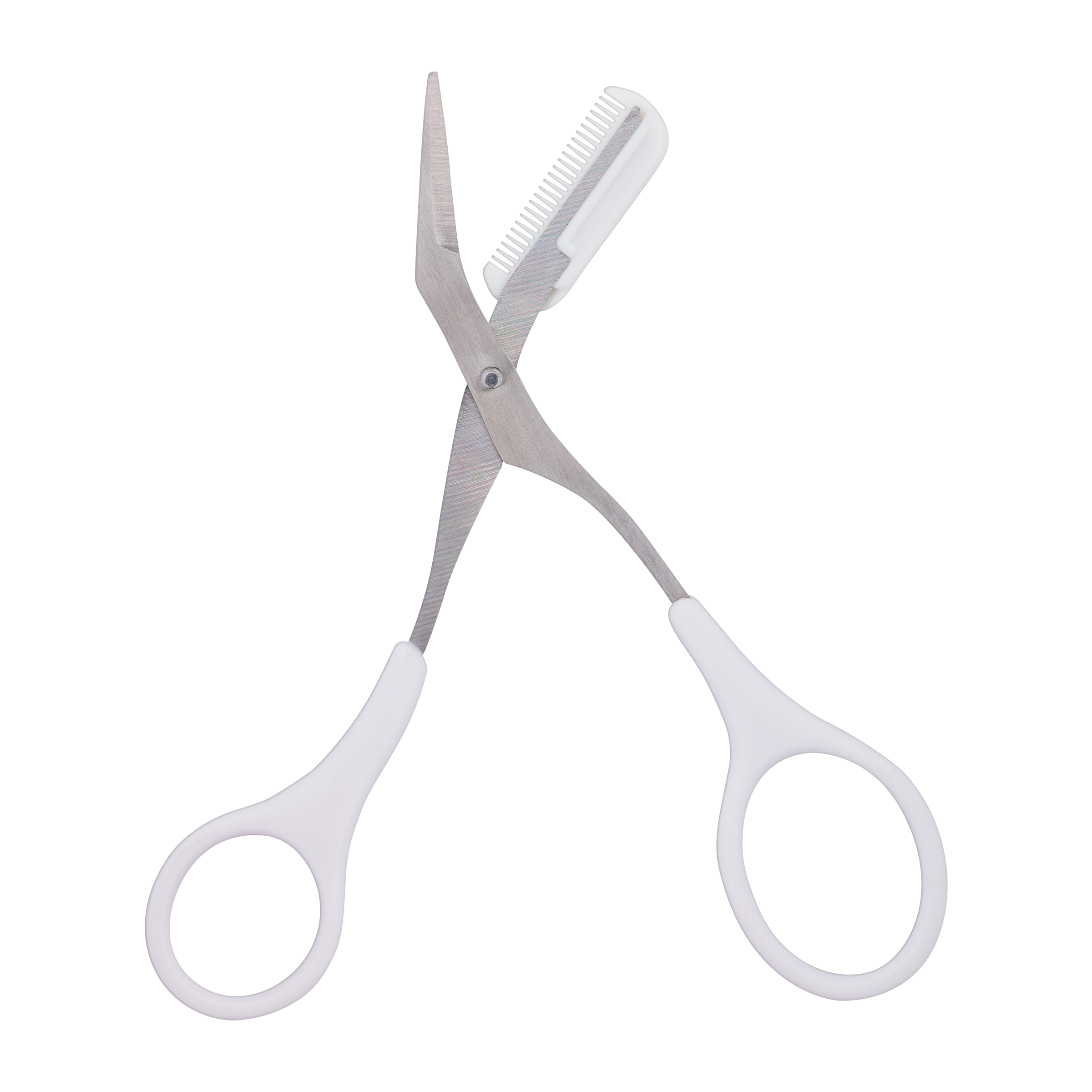 Hřebínkem vyčešte obočí směrem nahoru a zastřihněte chloupky pomocí opačné nůžkové hrany. Tupá špička nůžek vám umožňuje bezpečně a přesně upravit a zastřihnout obočí během okamžiku.