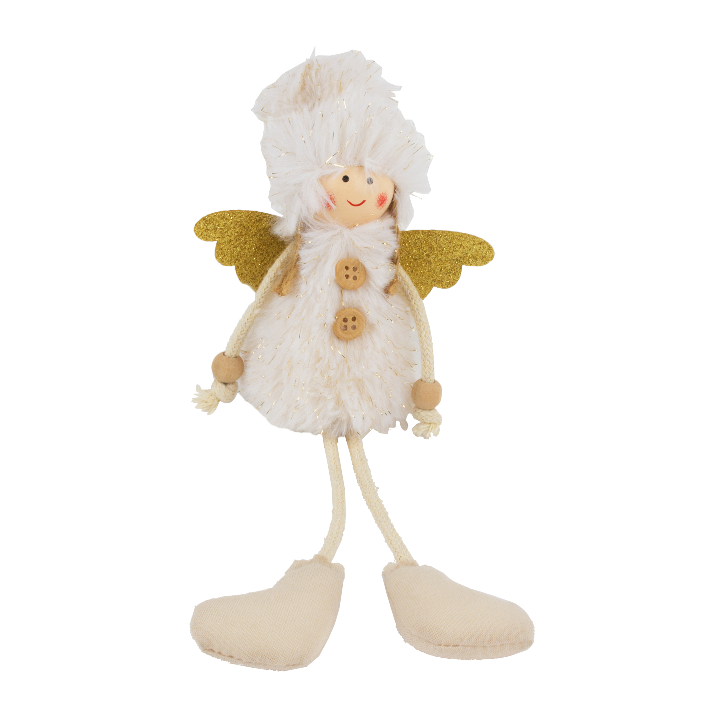 Něžná závěsná figurka anděla s nadýchaným bílým tělíčkem, zlatými křídly a dřevěnými detaily. Usměvavý obličej s růžovými tvářemi dodává dekoraci kouzelný výraz. Dlouhé nožky s béžovými botičkami a provázkové ruce zakončené korálky podtrhují její jemný vzhled. Ideální pro vánoční výzdobu. Výška: 21 cm.