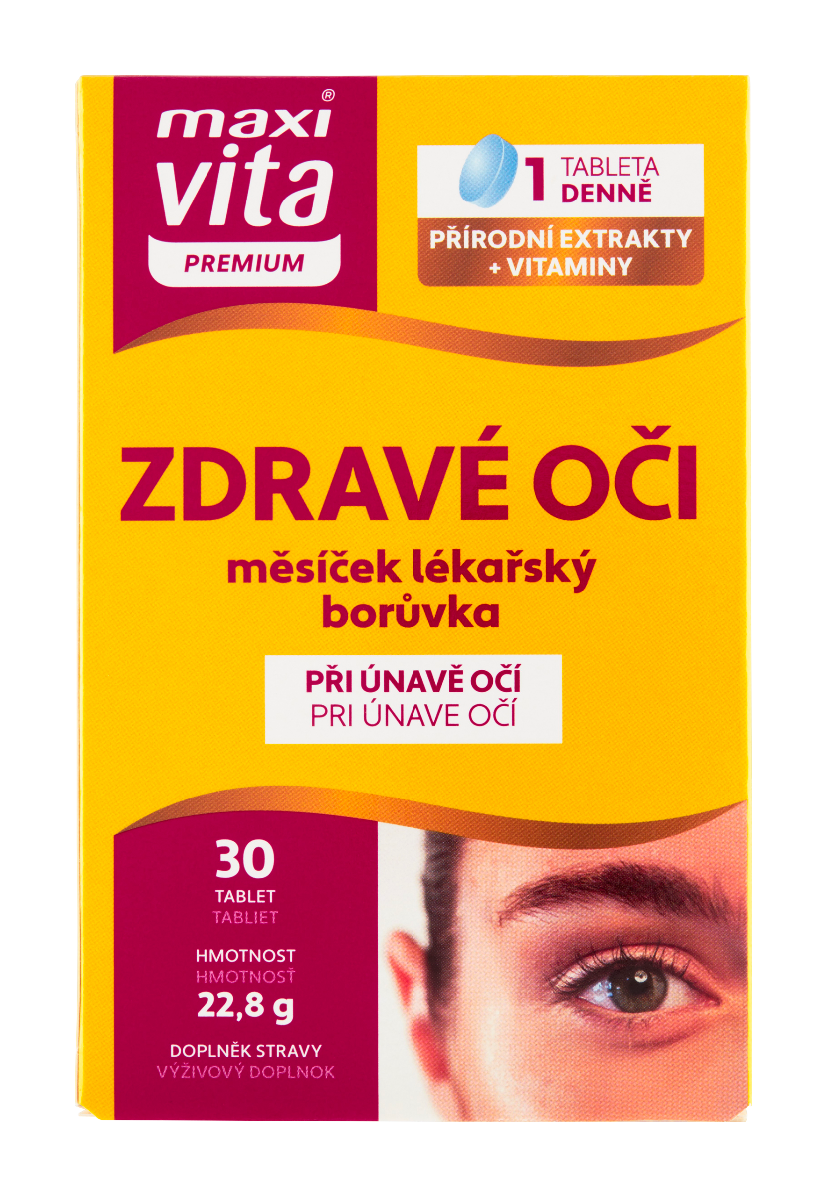 MaxiVita® Zdravé oči obsahuje přírodní extrakty z borůvky a měsíčku lékařského, který je zdrojem karotenoidů luteinu a zeaxantinu, ty jsou přirozenou součástí oční sítnice. Extrakt z borůvek je významným antioxidantem, který má blahodárný vliv na oční cévy. Podporuje tak správnou funkci očí. Vitaminy B2 a C se podílejí na správné funkci nervové soustavy, která ovládá všechny orgány v těle. Společně s vitaminem E se podílejí i na ochraně buněk před oxidativním stresem.