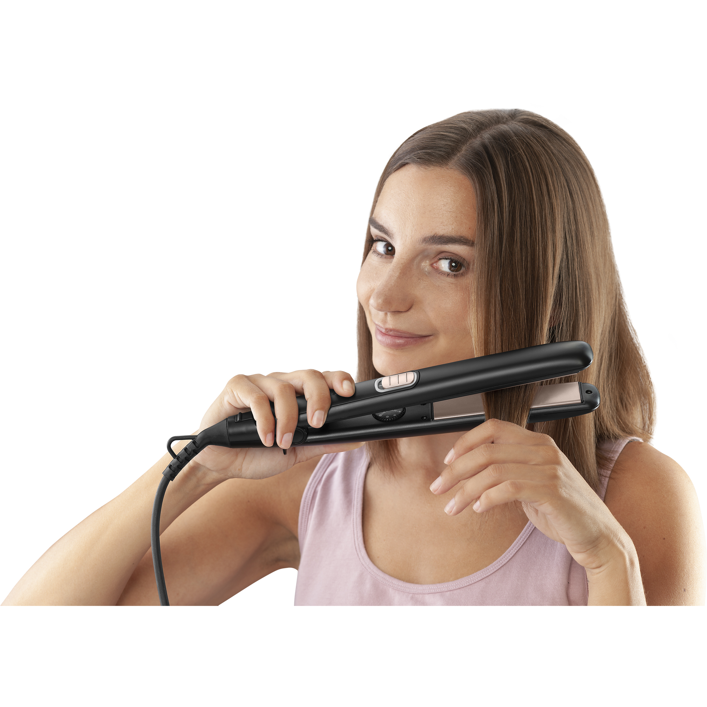 Naše žehlička na vlasy s keramickým povrchem a dvěma topnými deskami zaručí dokonalé narovnání vašich vlasů. Možnost nastavení teploty 80-200 °C. Praktický otočný kabel a smyčka na pověšení.