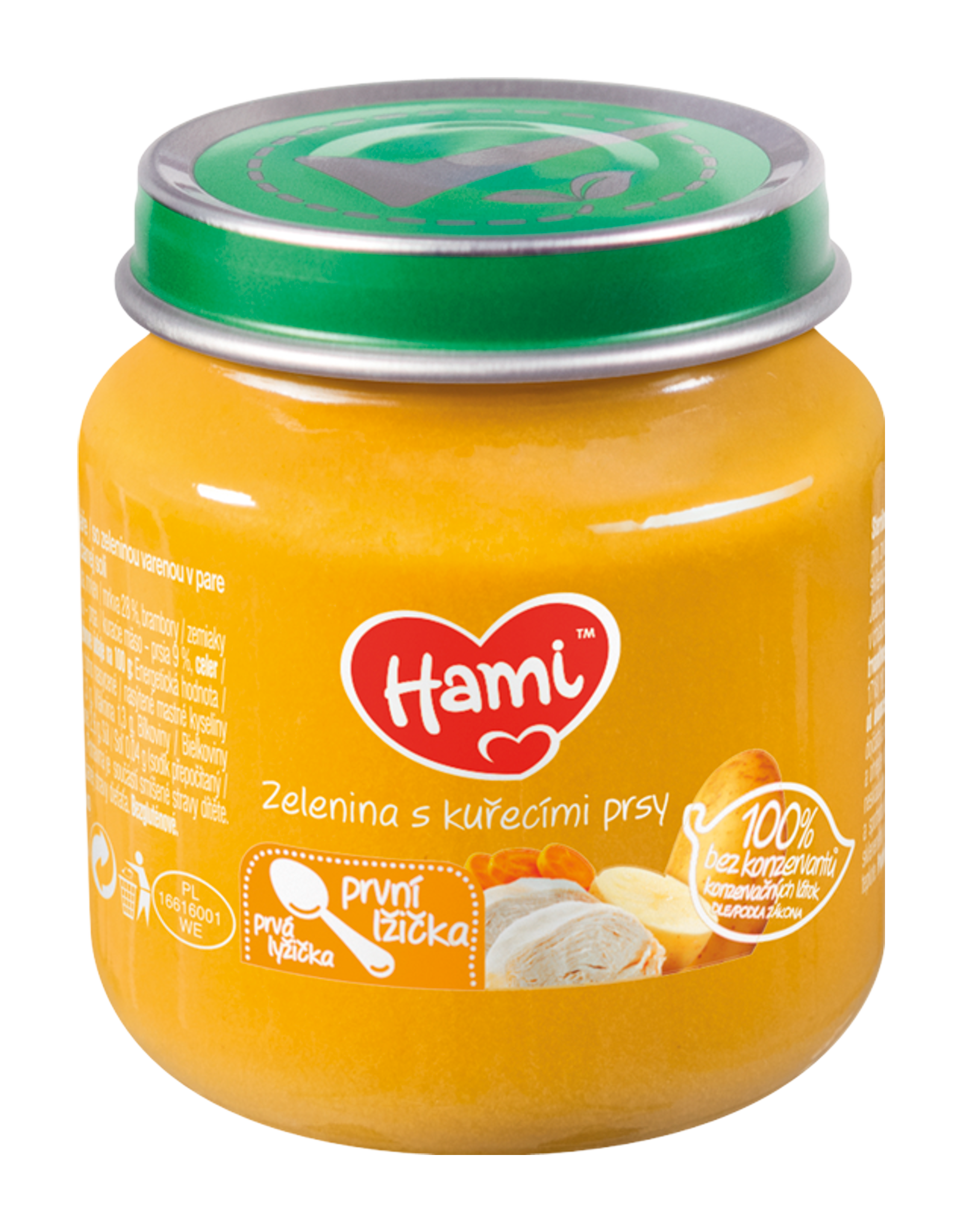 Složení ve 100 g výrobku: voda, mrkev 28 %, brambory 15,7 %, rýže 10,3 %, kuřecí maso - prsa 9 %, celer 1,8 %, řepkový olej