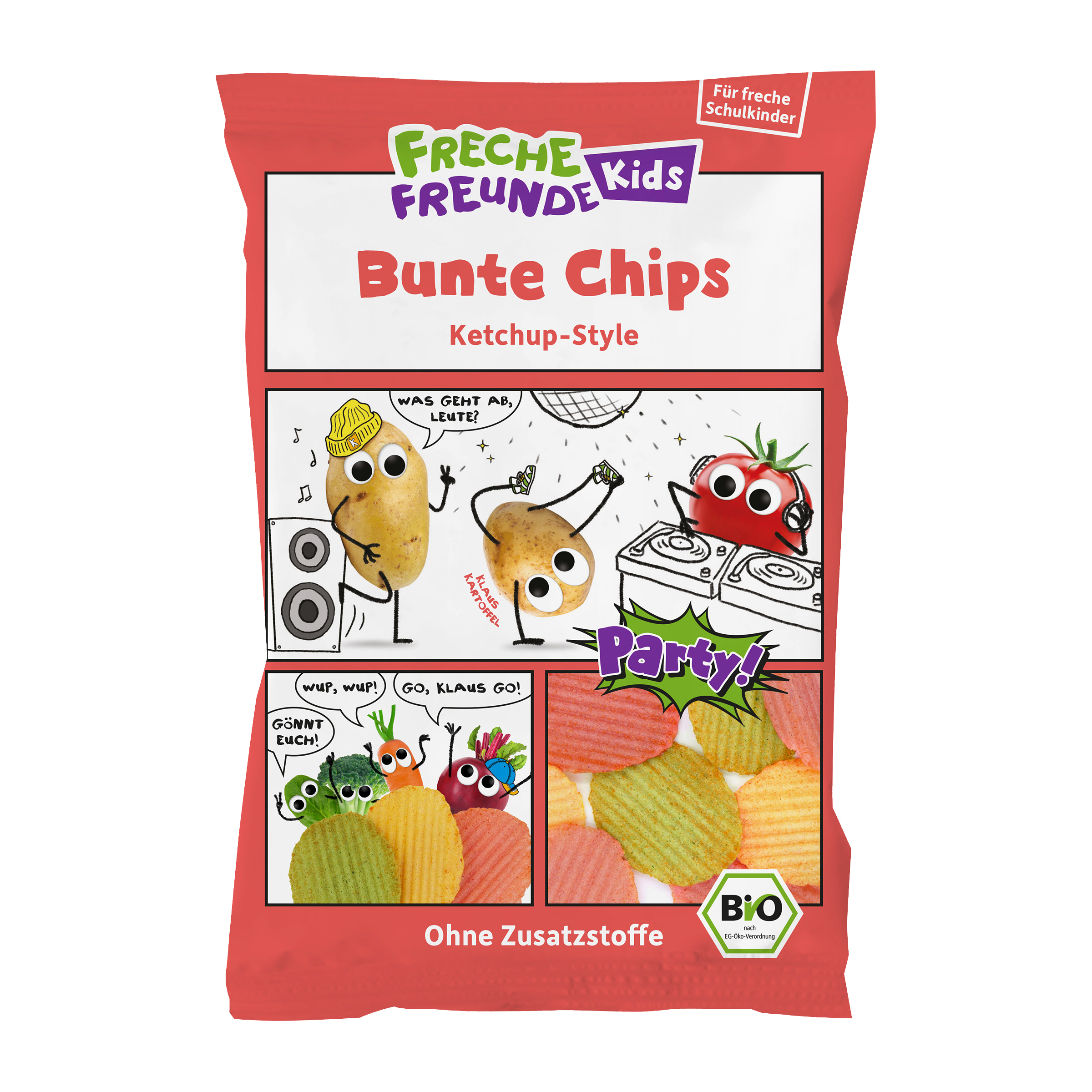 Barevné zeleninové BIO chipsy Freche Freunde mají 100% přírodní složení. Barví a ochucují se sušenou zeleninou, kurkumou a spirulinou.