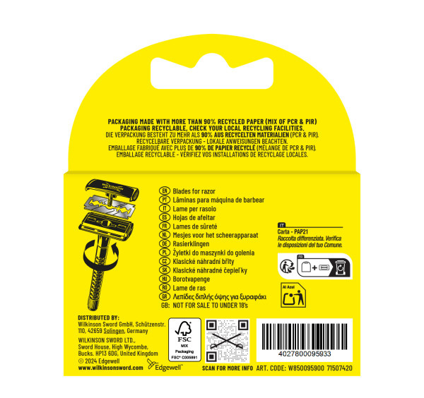 Wilkinson Classic je již po desetiletí nejoblíbenějším žiletkovým břitem. Žiletky jsou vyrobeny z nejkvalitnější nerezové oceli. Díky trojitému kalení a šestiúrovňové povrchové úpravě zůstávají břity déle ostré. Ochranný kryt a zabezpieczenie proti posunutí čepele snižují riziko pořezání. Kovové jádro rukojeti holicího strojku zajišťuje vynikající vyváženost a stabilní uchopení.