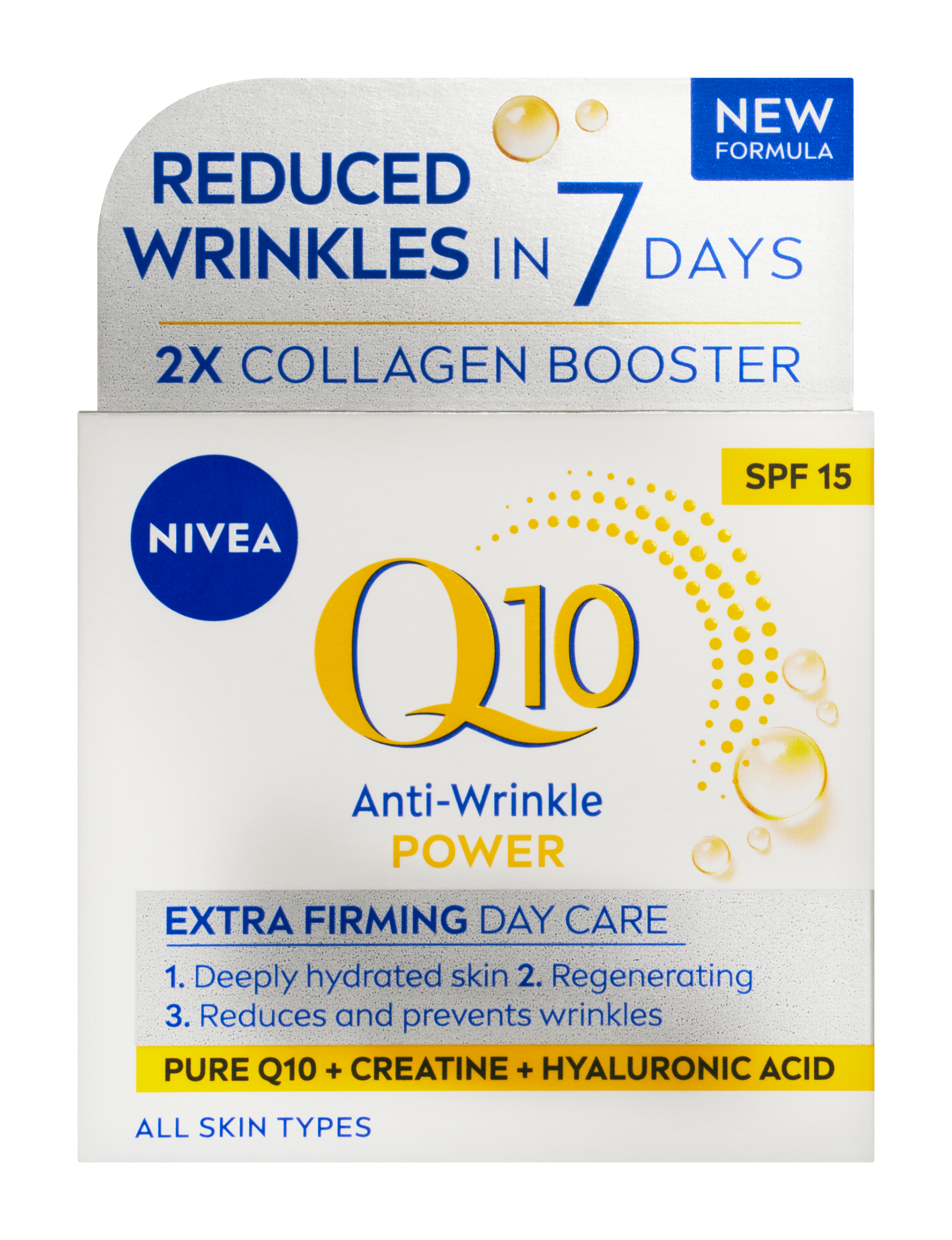 Nivea® Zpevňující denní krém proti vráskám Q10 Power intenzivně o pleť pečuje a hydratuje ji. Pro okamžitě hladší a jemnější pleť.