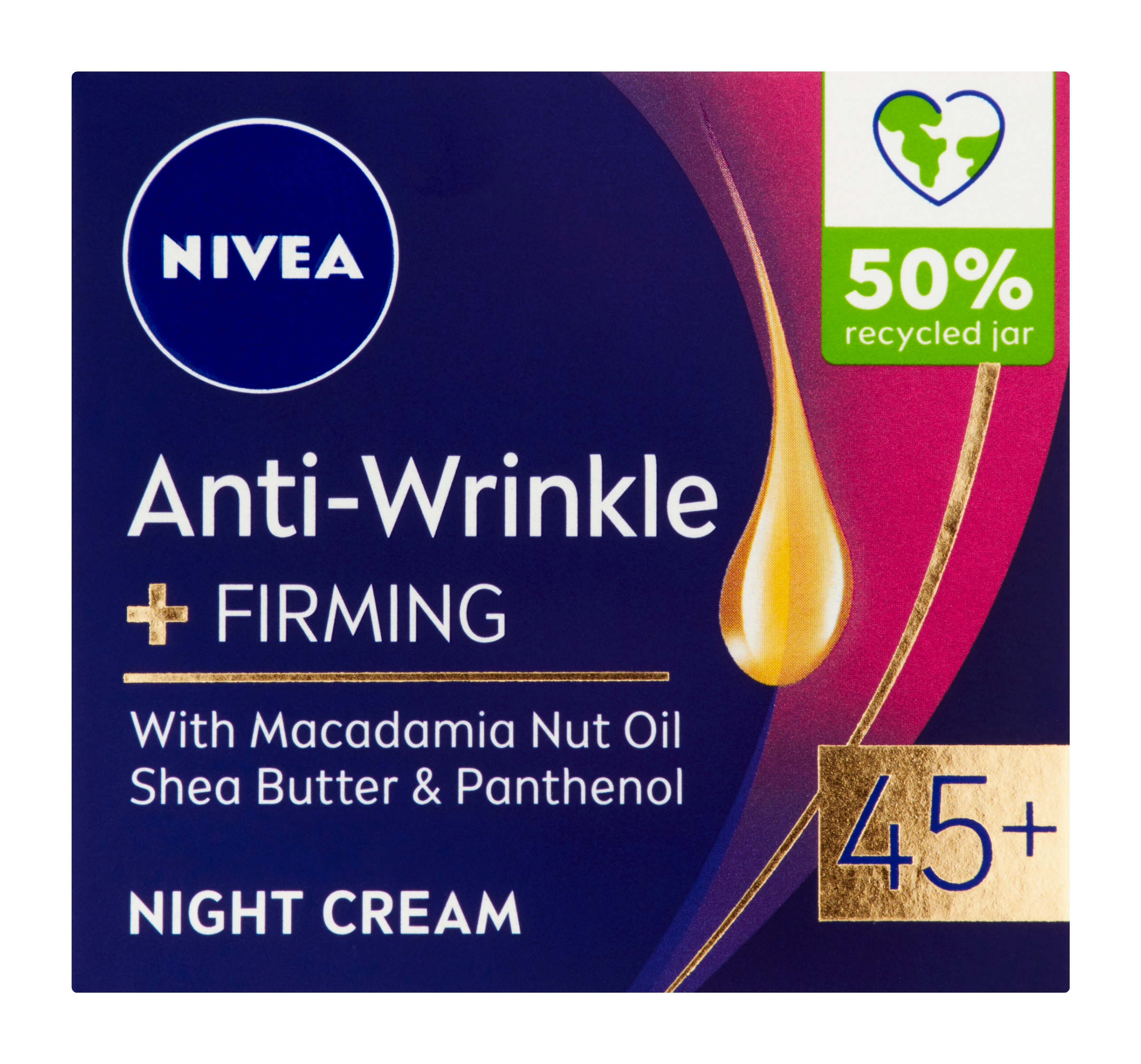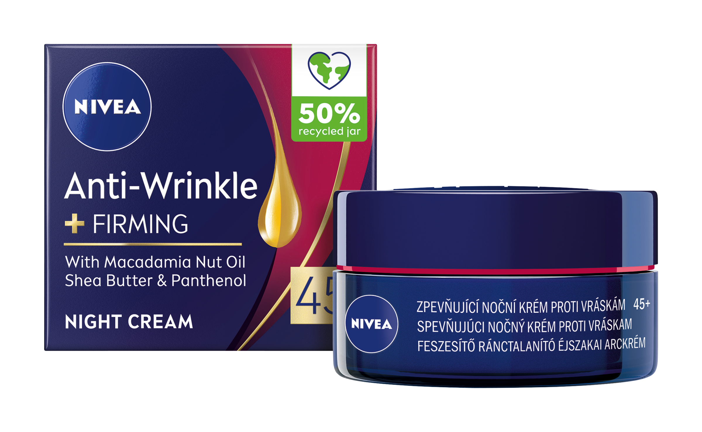 Nivea® Zpevňující noční krém proti vráskám 45+ obsahuje makadamiový olej, bambucké máslo a panthenol pro intenzivní hydrataci a regeneraci pleti během noci. Výsledek: