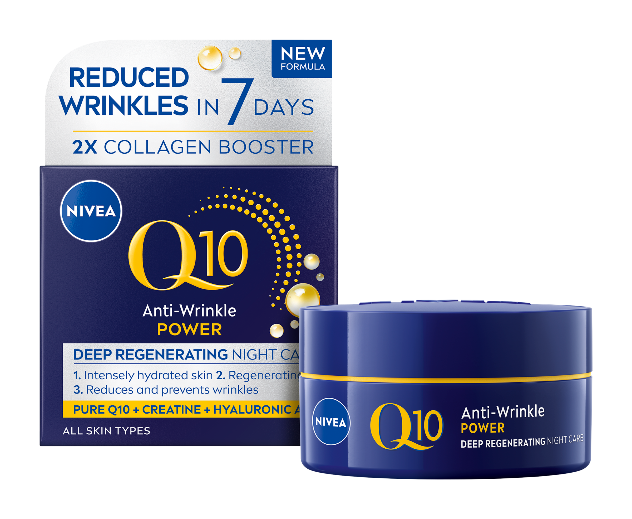 Nivea® Regenerační noční krém proti vráskám Q10 Power intenzivně o pleť pečuje a hydratuje ji. Pro okamžitě hladší a jemnější pleť.
